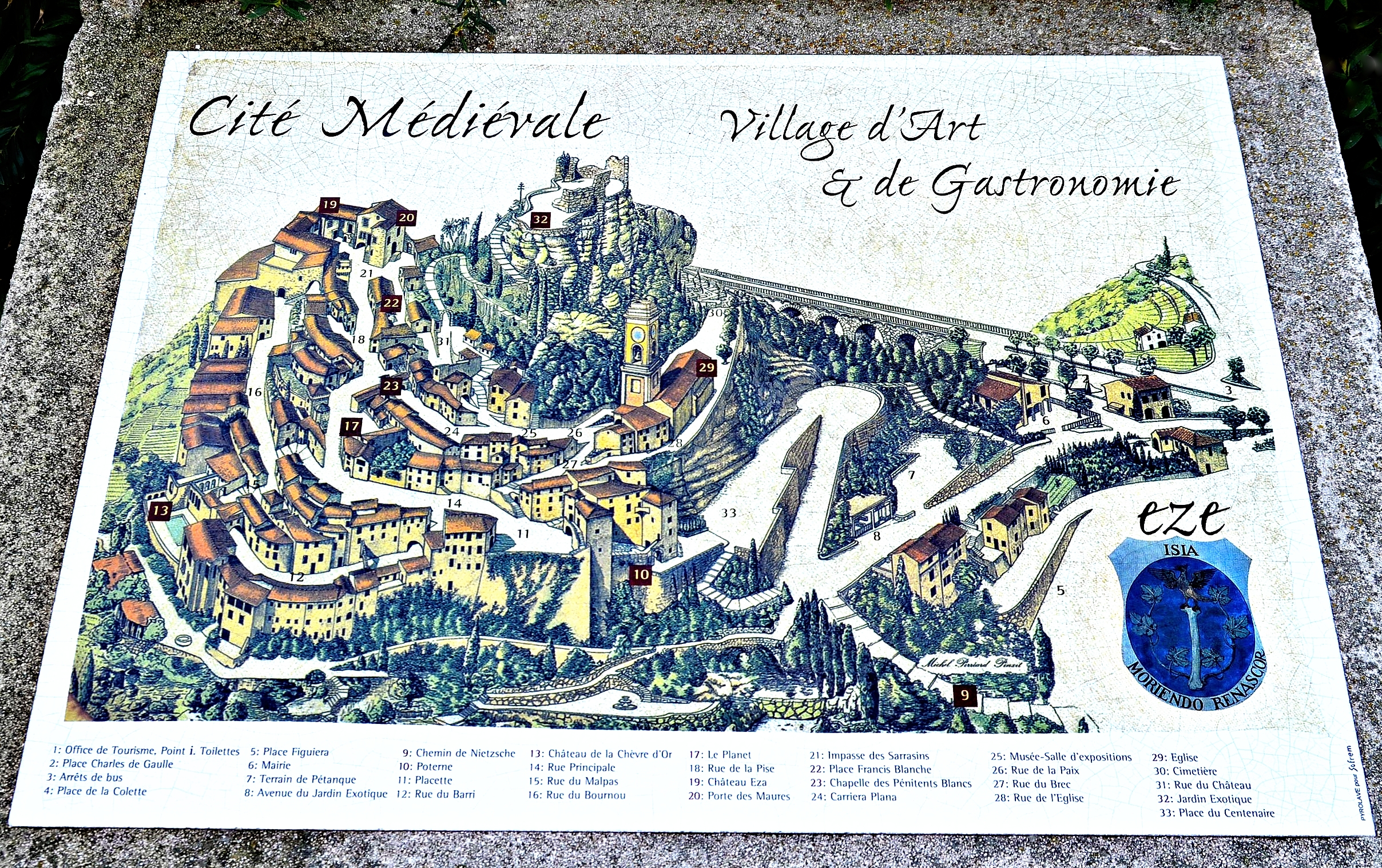 | エズ [Èze] 頂上の展望台 [Table panoramique] (13:58) 古代ケルト人によって造られたエズ村は、地理的に優れた場所として数々の権力争いに巻き込まれてきた。 紀元前から続いたローマ帝国の支配が弱まる7~8世紀ごろに異教徒の襲撃が相次ぎ、山頂に堅固な城塞都市を築いた。 フランス領となったのは1860年。 所々に立てられている女性の彫刻像は、ジャン=フィリップ・リチャードの地球女神 [Les déesses de terre de Jean-Philippe Richard] 。 「南西」MAPLay. C |