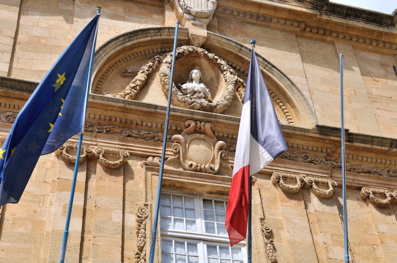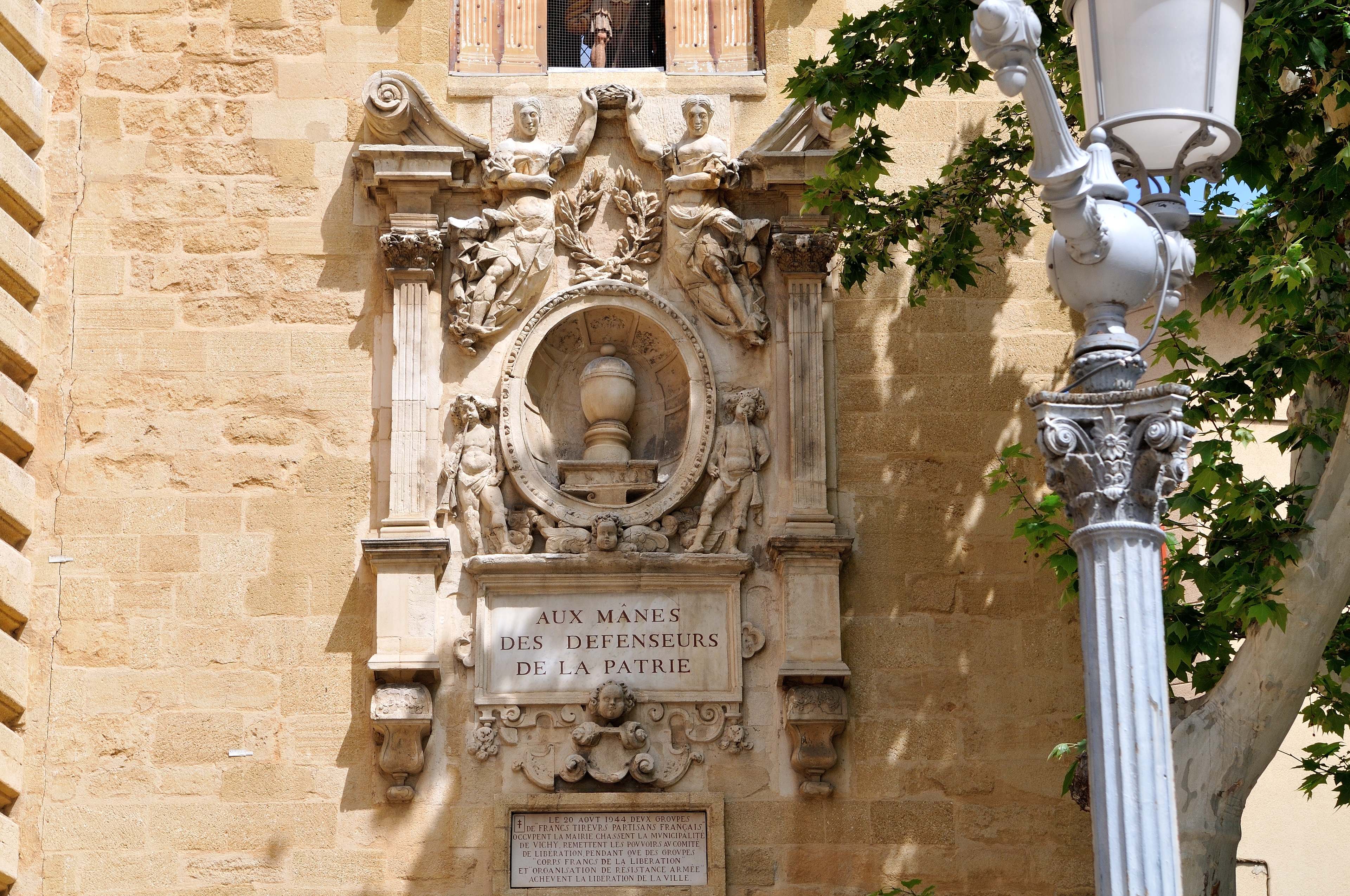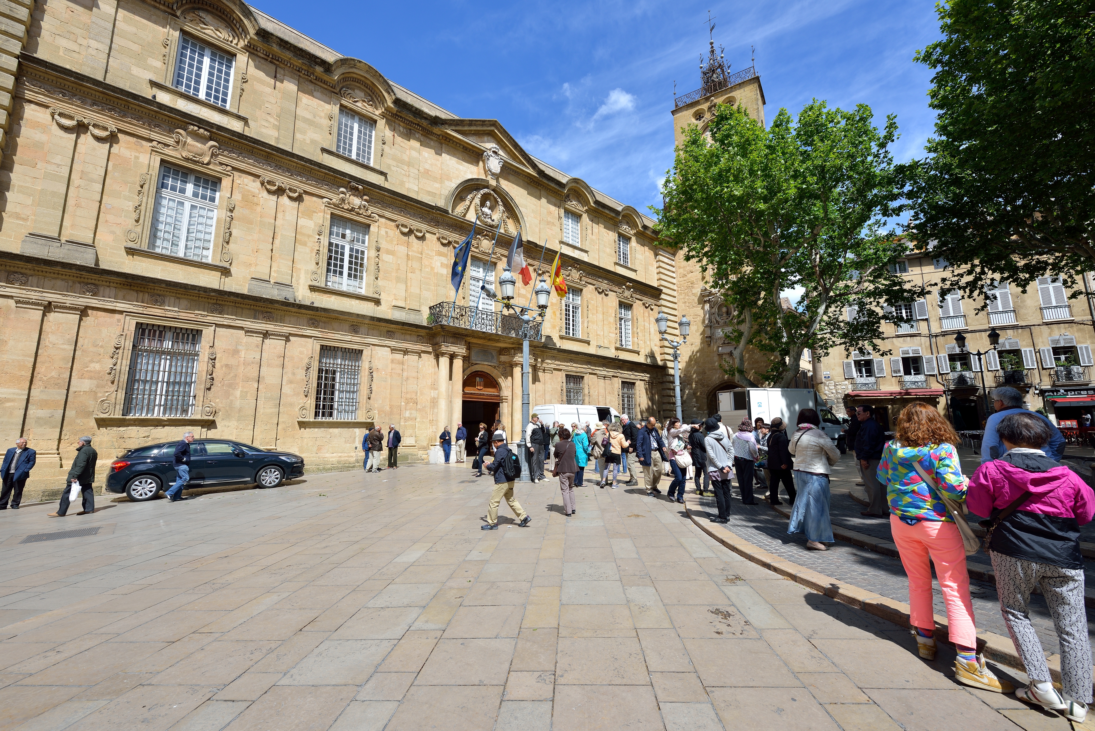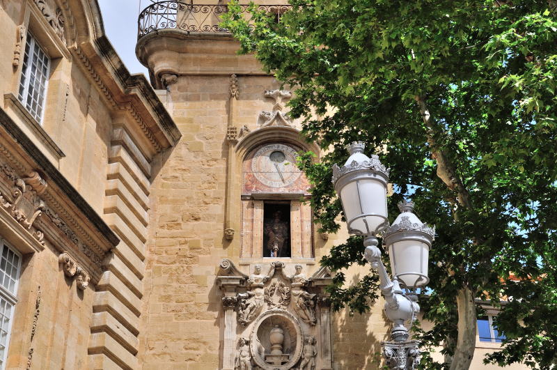 | 市庁舎 [Hôtel de Ville]* (11:25) 中央の旗の立っているところが、17世紀後半のイタリア様式で造られた市庁舎。 この市庁舎には、セザンヌの出生証明書や死亡証書が保管されている。 その右手の高い建物は、時計台。 「北西」MAPLay. A * 市庁舎の入口には、ホテル・ド・ヴィル [Hôtel de Ville] と書かれているが、"Hôtel" は、宿泊するホテルとは意味合いが違い、建物や館を意味し、 "Ville" は町を意味する。 従って "街の館" を意訳すれば "市庁舎" になる。 《注意:下の文は上の写真を説明したものではありません》 ルネ王は、住民の衛生状態にも気を配り、保健衛生条例を公布して市内各地の清掃にも力を入れた。 当時の エクサン・プロヴァンス の人口は 4000人から5000人で大司教区や伯爵領の行政機関の本拠地であった。 ルネ王は晩年アンジュー家の本拠地アンジェ [Angers] には戻らず1480年 (72歳) にエクス=アン=プロヴァンスで亡くなっている。 彼の死後 フランス王ルイ11世 がプロヴァンスの領主となり、1486年にフランス王国領に併合された。 その後、エクサン・プロヴァンスには、王の代理である総督が置かれた。 |