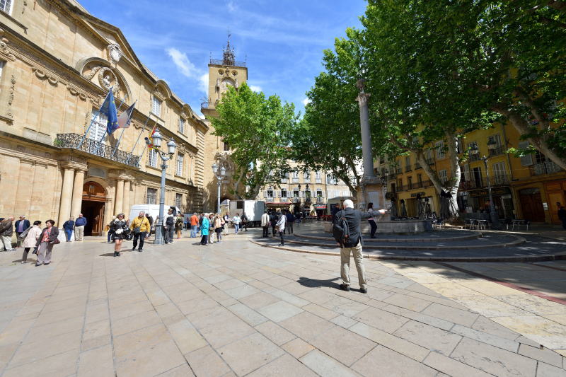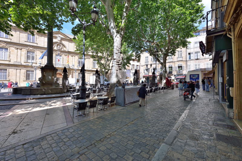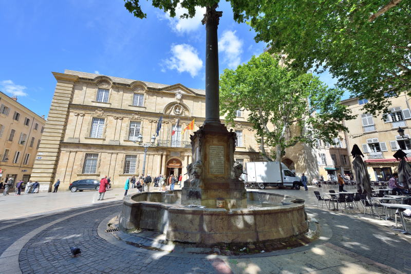 | 市庁舎広場 [Place de l'Hôtel de ville] (11:25) 「北」MAPLay. A 《注意:下の文は上の写真を説明したものではありません》 エクサン・プロヴァンスは、16世紀になると高等法院が設置され、行政機関も集まりプロバンスの中心となって栄えていく。 高等法院の司法官達は裕福で、彼らは マザラン地区 [Quartier Mazarin] と呼ばれる旧市街の外に豪華な邸宅を構えた。 そのため、古い城壁は取り払われ、幅の広い道が造られた。 それが、現在の "ミラボー通り" [Cours Mirabeau] である。 |