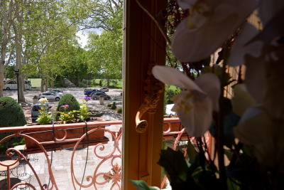 | Château de Richebois の窓から前庭を望む (13:07) レストランはプラタナスの並木道の奥まった所に在る。 「南」MAPLay. B |