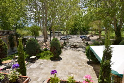 Château de Richebois の窓から前庭を望む (13:07) レストランはプラタナスの並木の奥まった所に在る。 「南」MAPLay. B |