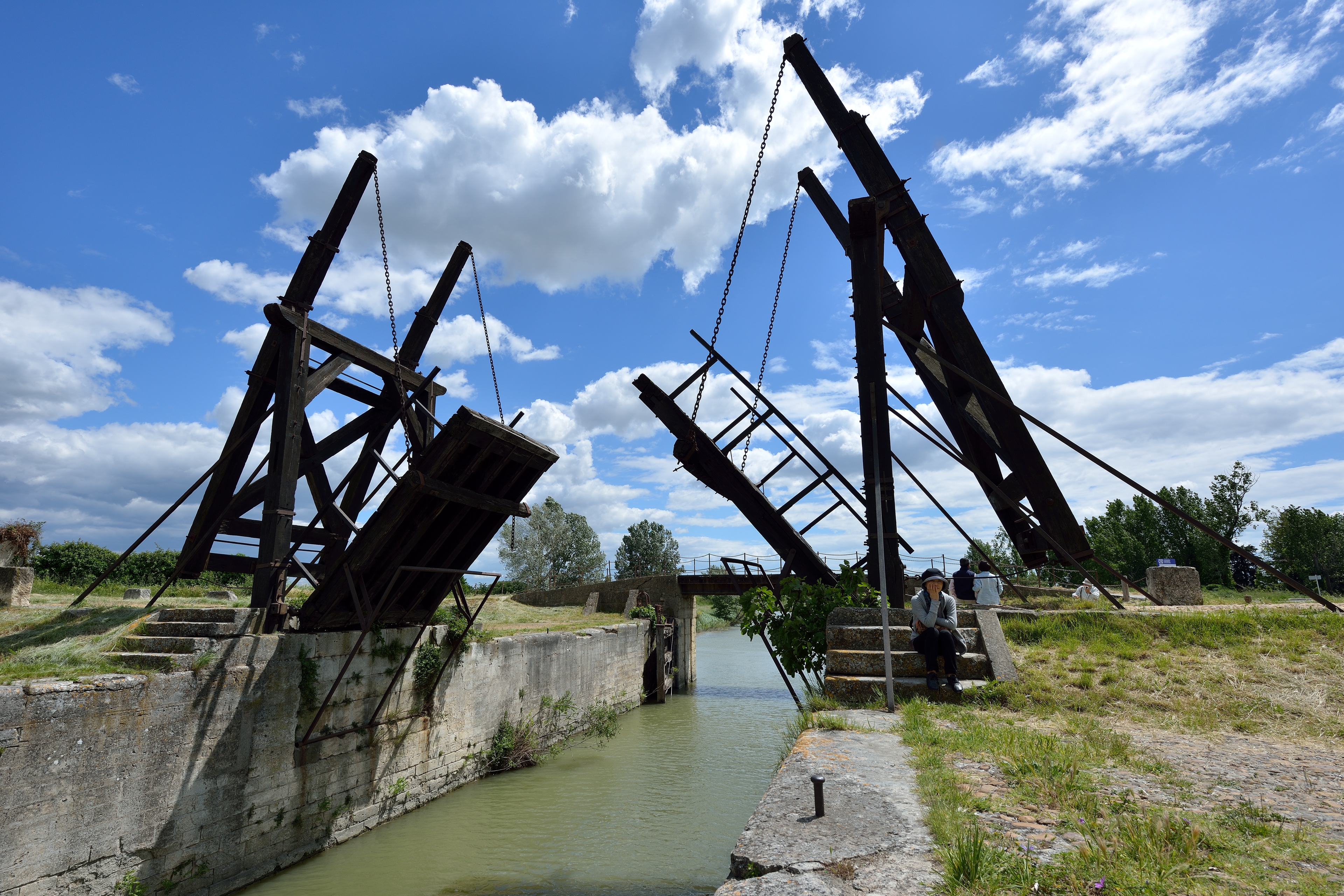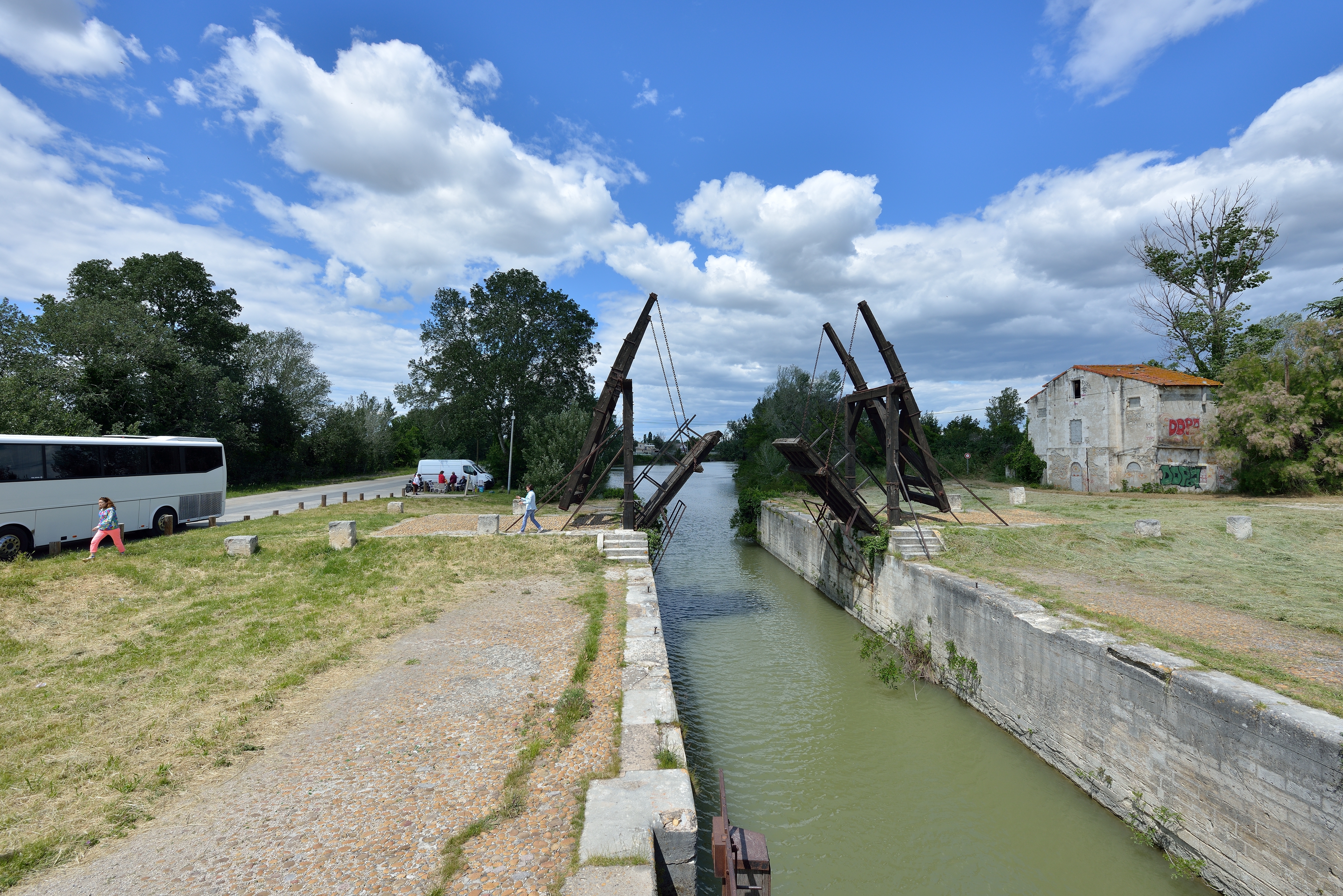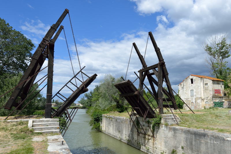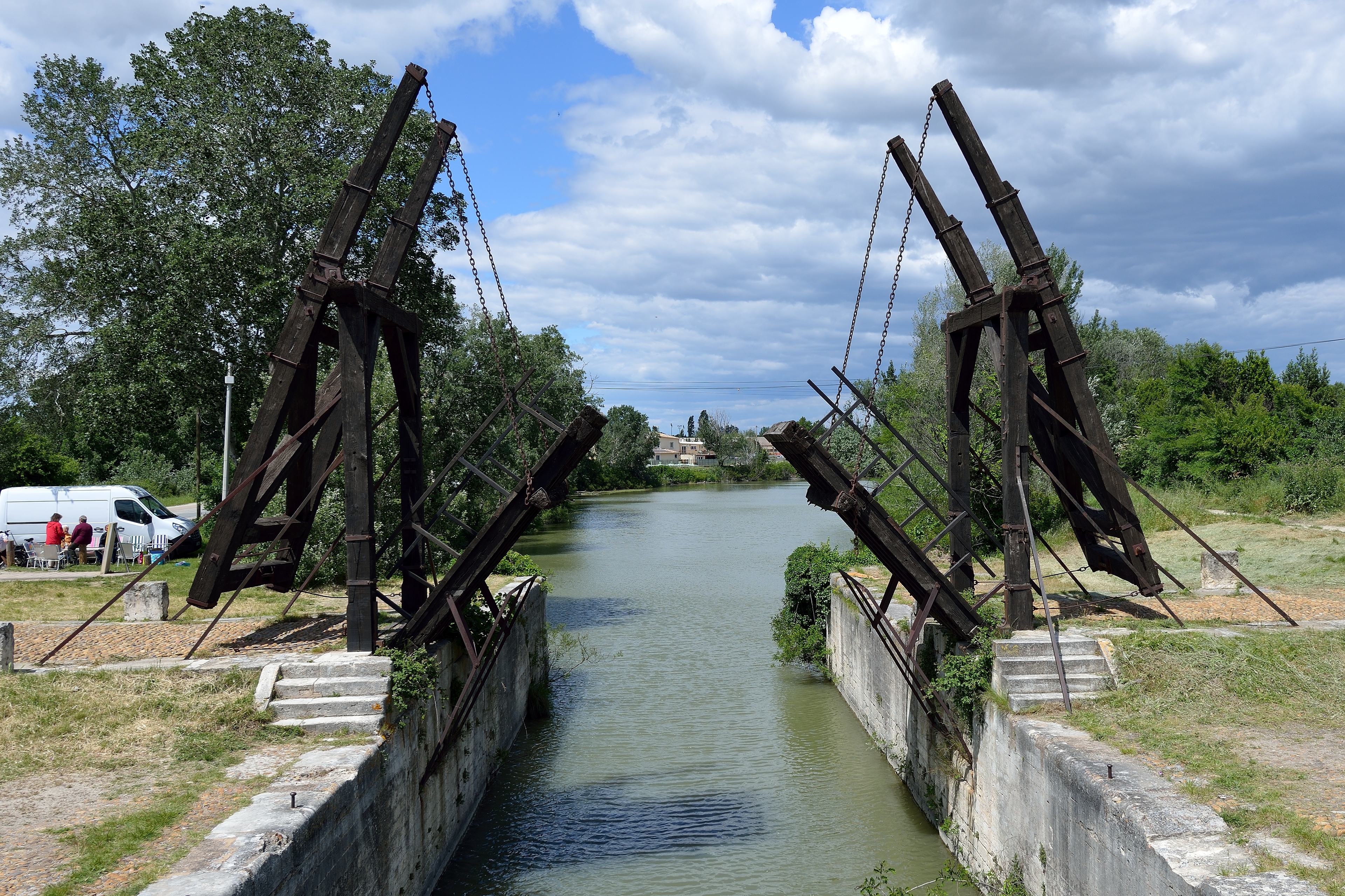 | 復元されたゴッホの跳ね橋 [Pont Van Gogh] (15:00) カナル・ダルル・ア・ブック [Canal d'Arles à Bouc] (アルル・ブック運河) に架けられている復元されたゴッホの橋。 アルルBouc運河は、1820年 ~ 1830年を中心に構築され、1837年にオープンされている。 嘗て、この運河には、オランダ人技師によって、11本の木製橋が架けられていたが、全て破壊され、現在、ゴッホの描いたラングロワ橋 [Le Pont de Langlois] のみが復元されている。 「北」MAPLay. B |