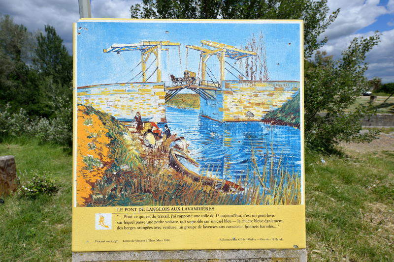 | Le Pont de Langlois aux Lavandières (ラングロワ橋と洗濯する女性たち) (15:03) 橋の傍らに立てられている、フィンセント・ファン・ゴッホが描いた油彩画 "ゴッホの跳ね橋" を紹介したパネル。 ゴッホの跳ね橋と呼ばれるこの橋は、正式の名前はラングロワ橋 [Le Pont de Langlois] で、この橋は1930年にはコンクリート製のアーチ橋に造り替えられ、第2次世界大戦中、ドイツ軍に他の橋と共に爆破されている。 現在の橋は実際に橋があった所から2kmほど南の下流に、戦火を逃れ、セメント工場に1つだけ残っていた木製の跳ね橋を移築して復元されている。 そのため、運河の堤などの風景が異なり、作品の雰囲気は正確に再現されていない。 「東」MAPLay. B |