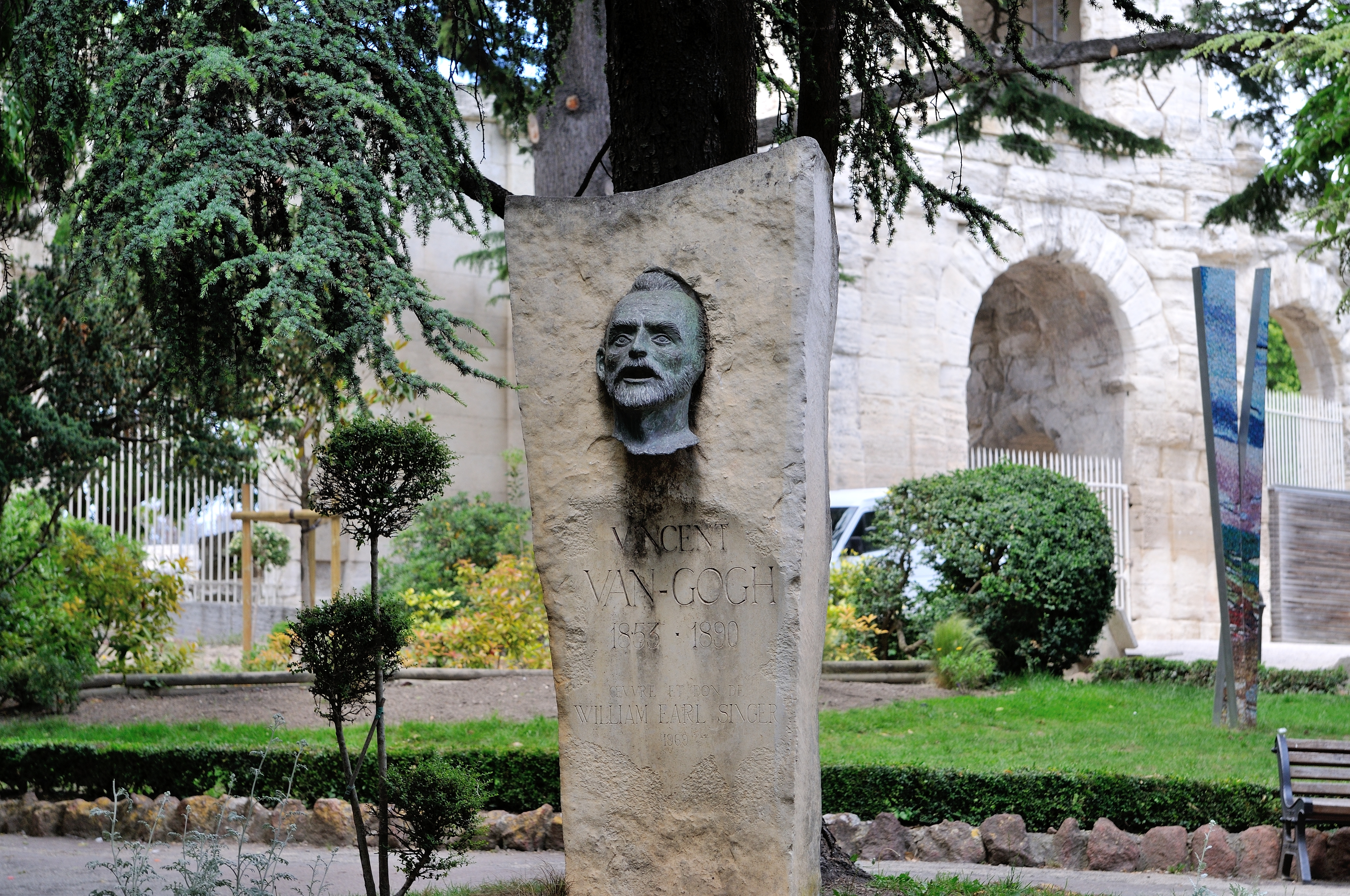 | 庭園にある、フィンセント・ウィレム・ファン・ゴッホ [Vincent Willem van Gogh] 像 (15:22) アルル市が建てた、ゴッホの像。 左耳が無いのが、特徴。 ゴッホは、1888年2月パリからアルルにやって来た。 アルルに滞在したのは1年と3ヶ月だけだったが、その間、この地で沢山の絵画が描かれている。 1年3ヶ月間の内の2ヶ月間だけポール・ゴーギャンと共同生活をしたが、アブサン酒が好きでアルコール中毒になり、精神の病にも罹り、次第に二人の関係は行き詰まていった。 そして、1888年12月23日のファン・ゴッホの左耳切断事件を機に、二人の共同生活は破綻した。 因みに、左耳切断は耳全体ではなく、左耳の耳朶のみを切断したそうです。 「北東」MAPLay. B |
