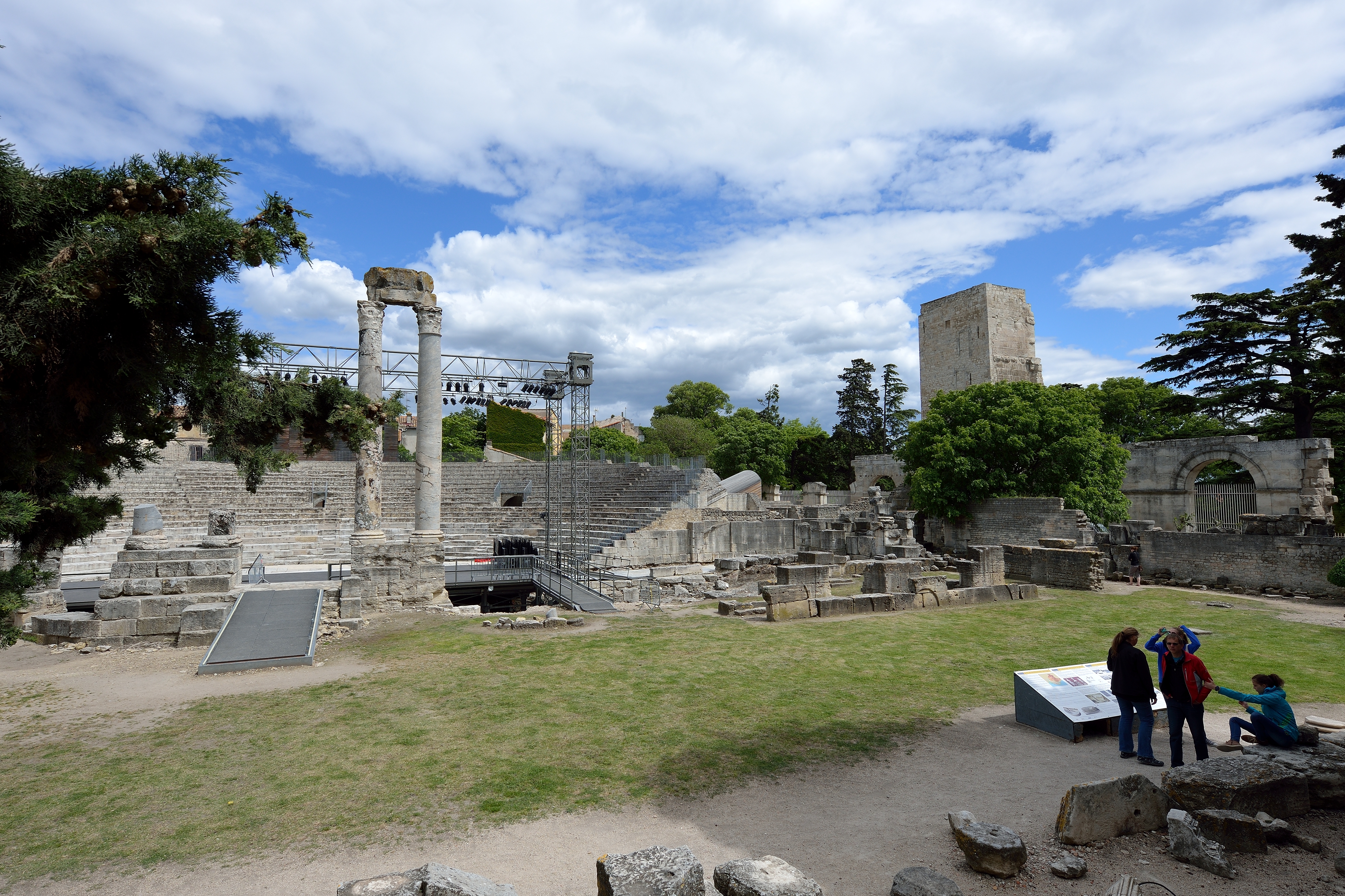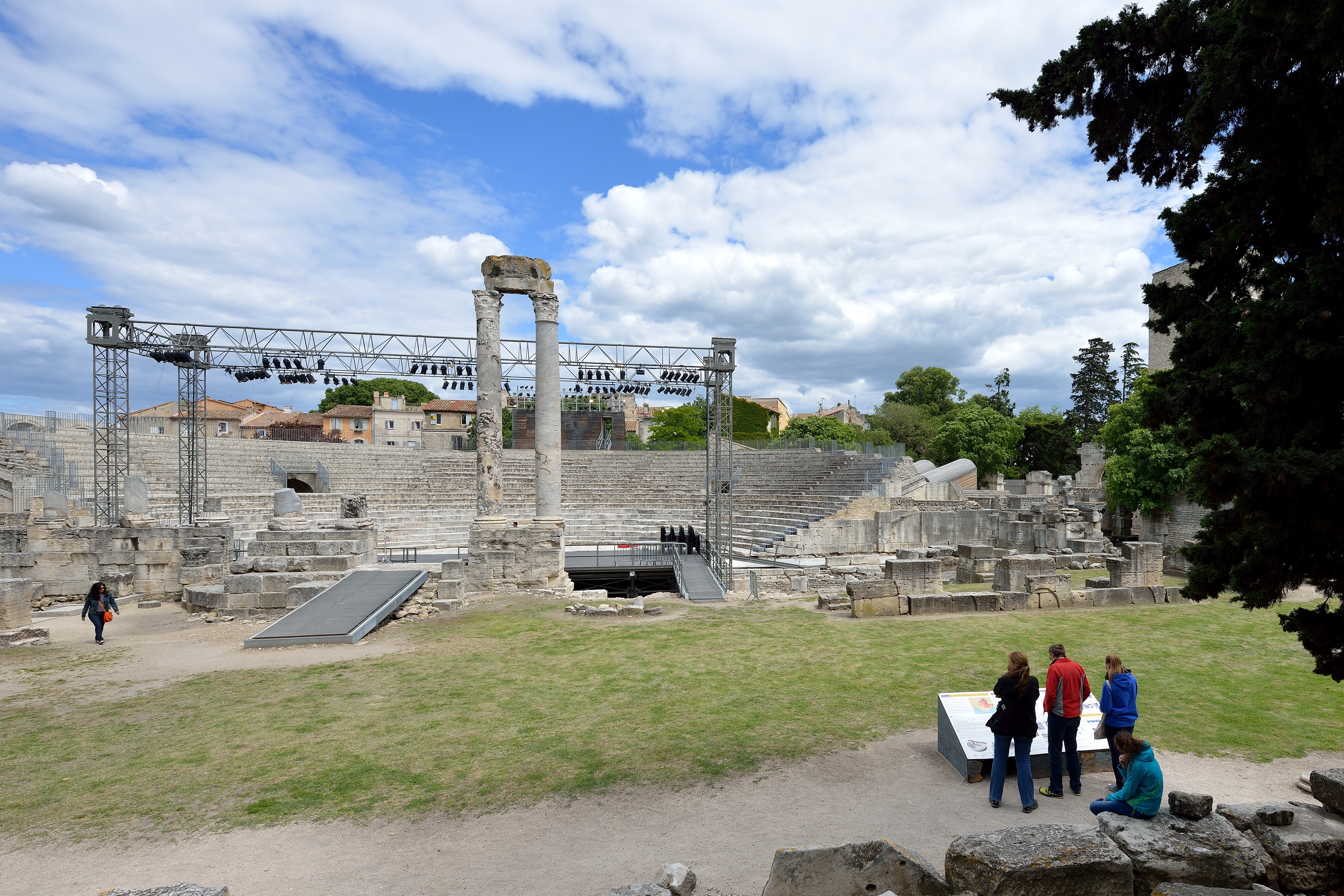 | 古代劇場 [Théâtre Antique] (15:26) 紀元前30年~20年に建設された劇場で、半円形をしており、直径は104m、高さは約21mぐらいあった。 半円形になった階段状の客席には、約12000人以上の観客を収容できたと言われている。 当時の客席は、現在の客席の数倍以上あったと言われている。 中央に見える2本の円柱は、嘗て、舞台の壁になっていた部分で、ほぼ舞台の中央に位置していた。 そこには、縦に2層になった4本の柱があり、高さは30m以上の舞台の壁を構成していた。 そして2層目の上部には、大理石で出来たアウグストゥス帝の石像が飾られていた。 現在、この石像は、腰から上のみ、古代アルル博物館に所蔵されている。 「東」MAPLay. B |