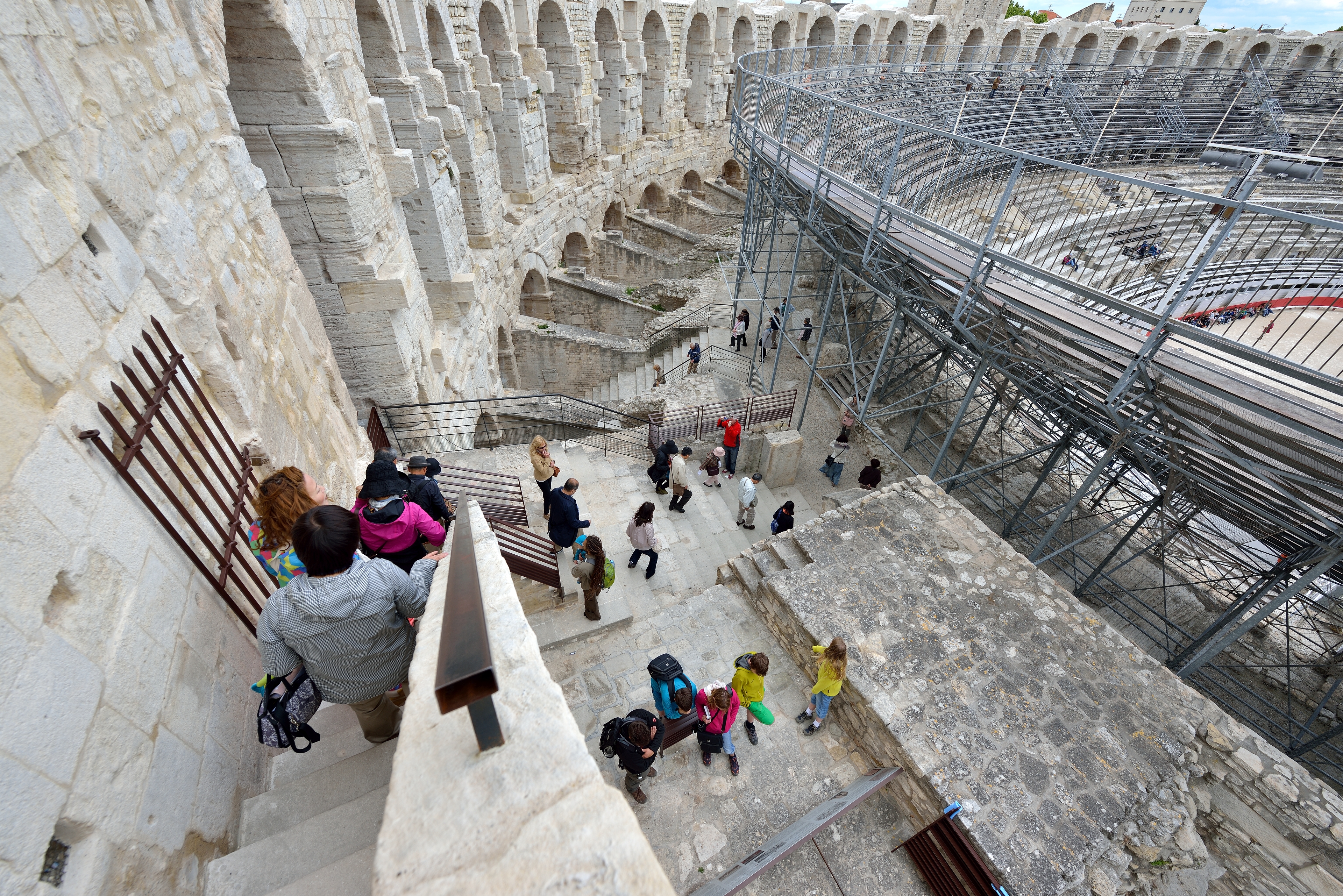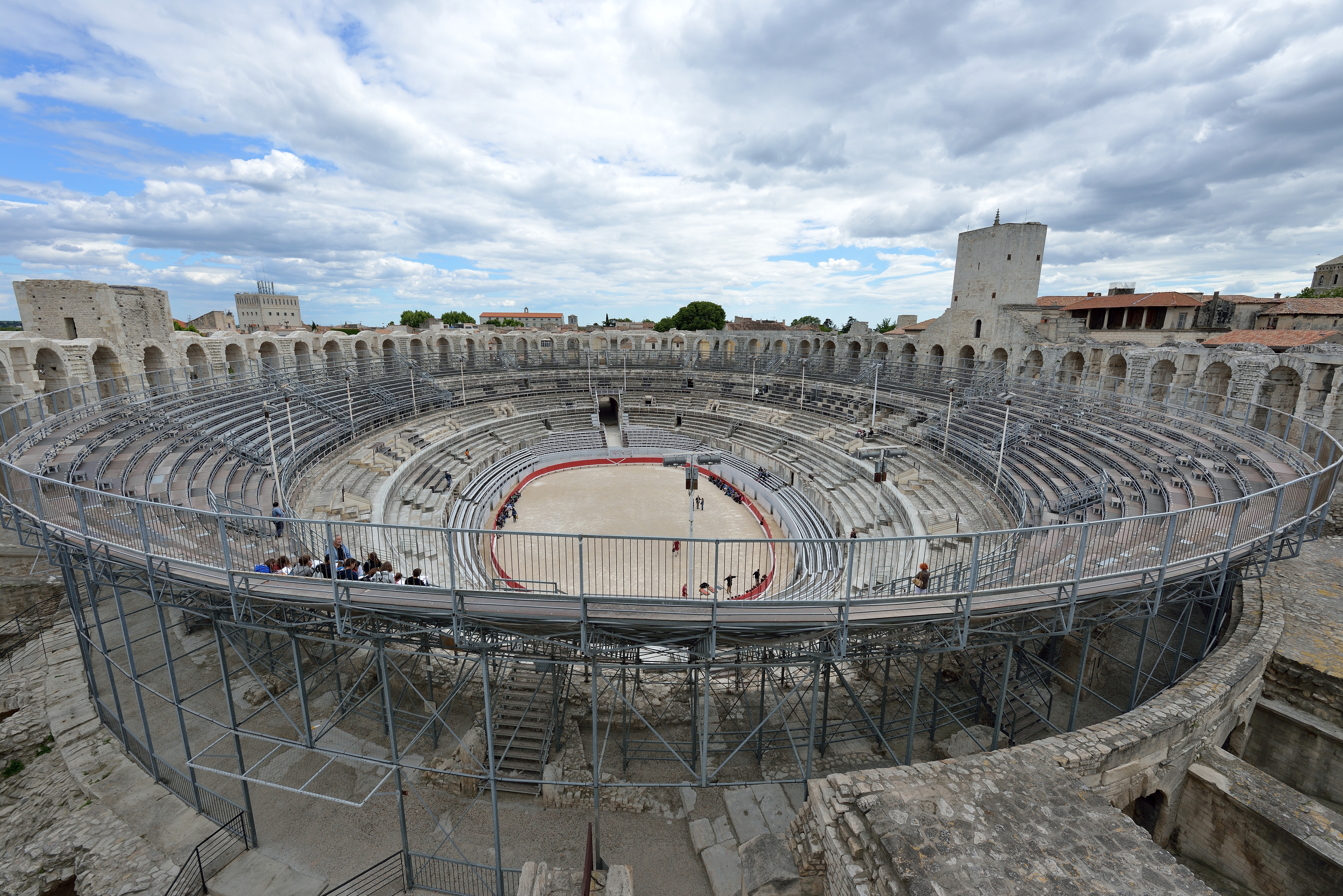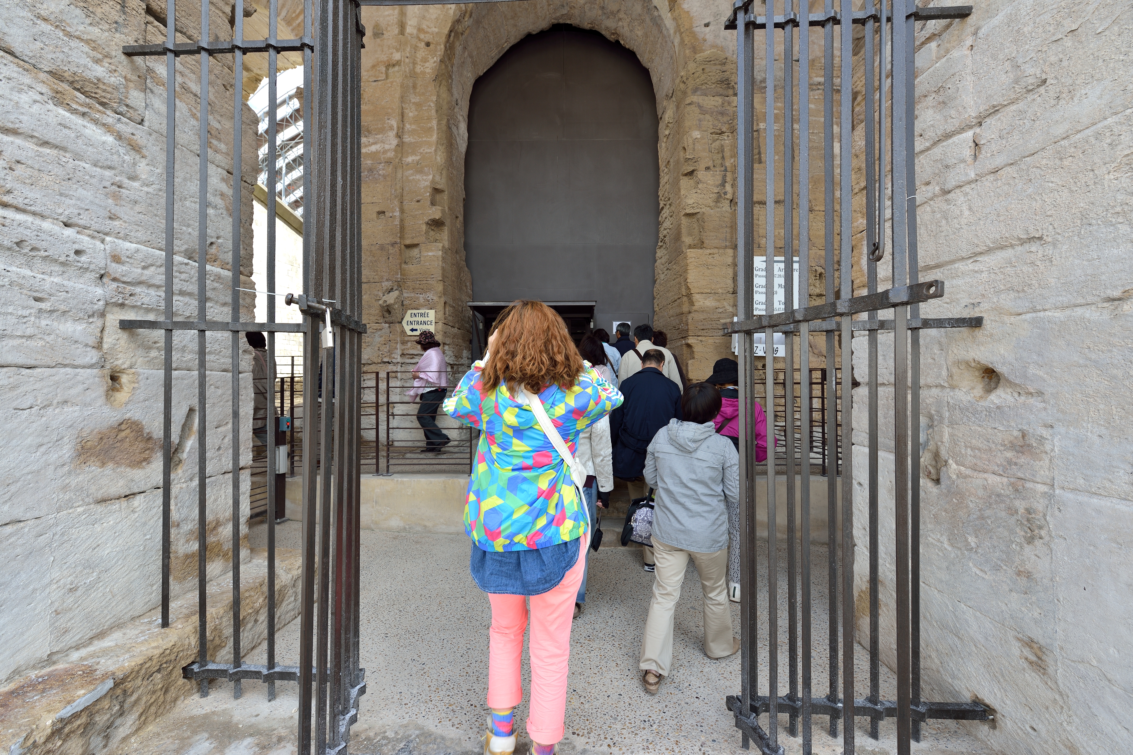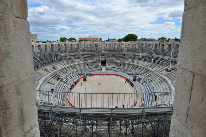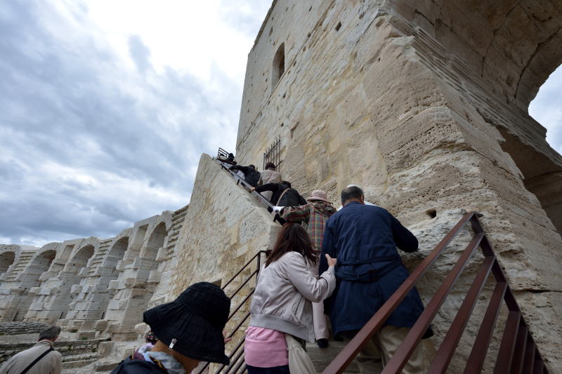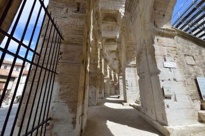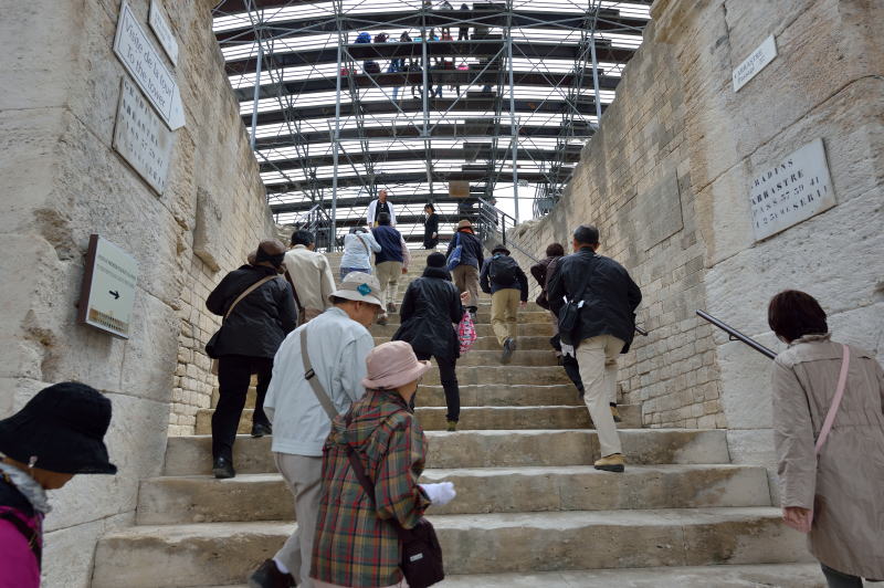 | 円形闘技場 [Amphithéâtre] (15:35) この円形闘技場は、紀元後90年頃、ローマ人が丘を切り開いて造った闘技場で、建材に石灰岩石 (フォンヴィエイユの石*) を使用している。 闘技場の周囲は、石灰岩石で出来た高さ21mの、2層のアーチで壁を形成しており、闘技場全体の形状は楕円形になっている。 以前は3層目の壁があったが、アーチ状ではなく、約5mの壁が続いていた。 中央の高い塔は、5世紀以降、闘技場の中に要塞があった頃に建てられた見張り塔で、その左隣の、柱の上方に、柱模様が残っており、その最上部に四角い板状の壁材が乗っかっているが、嘗ては、さらに、その上に約5mの壁があり、周囲を囲んでいた。 その壁は、日よけの目的で造られていた。 壁に約2m間隔で空けられた縦穴に、木の棒を差し込み、棒から円形闘技場内に張られたロープに、天幕を結わえ付け、日よけにしていた。(参照画像) 現在は、このシステムは無く、闘牛が開かれる時など、日陰席は高くなるそうです。 「東」MAPLay. B * アルルの北東に位置する "フォンヴィエイユ" [Fontvieille] 村 (MAP)で採取された石灰石。 |