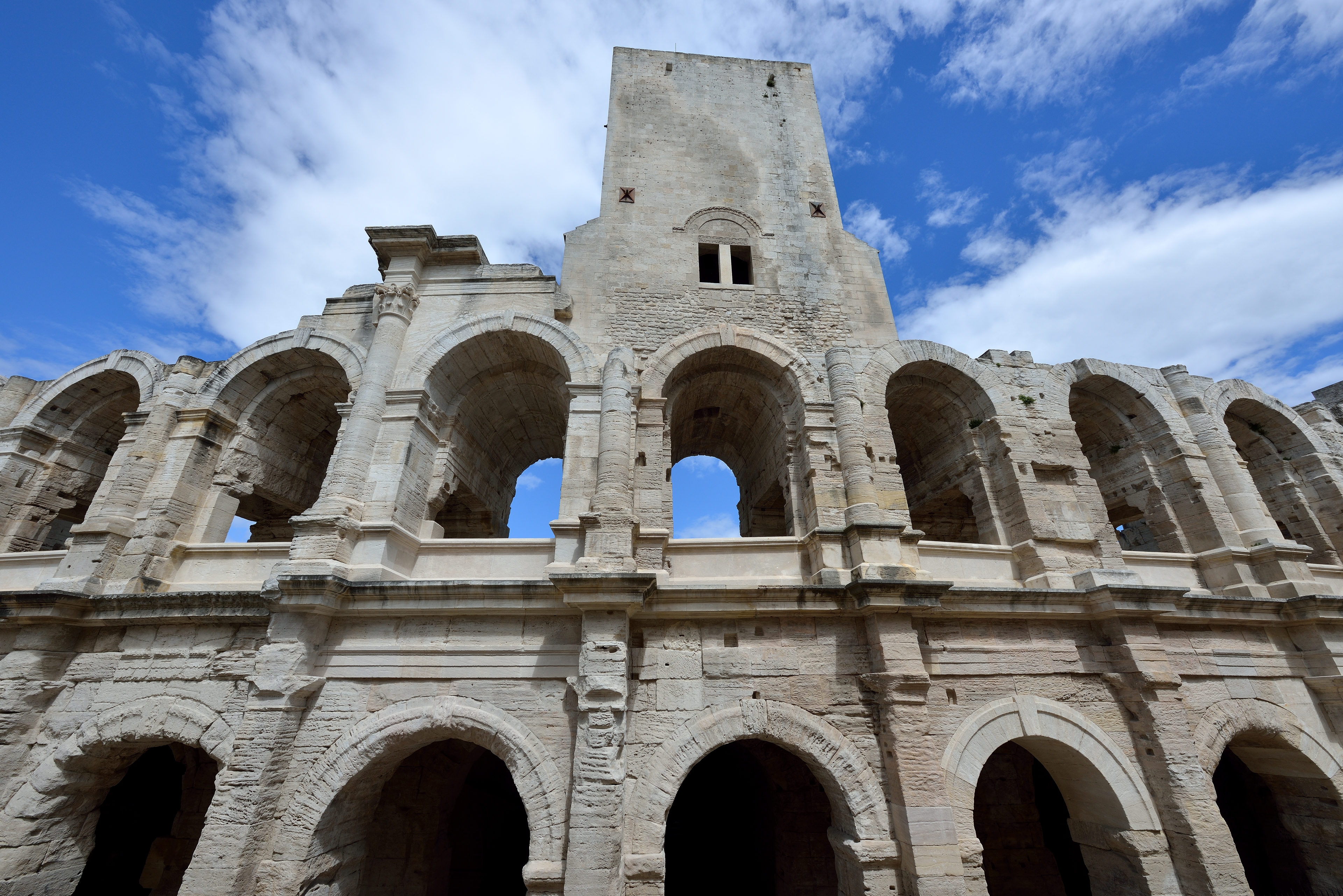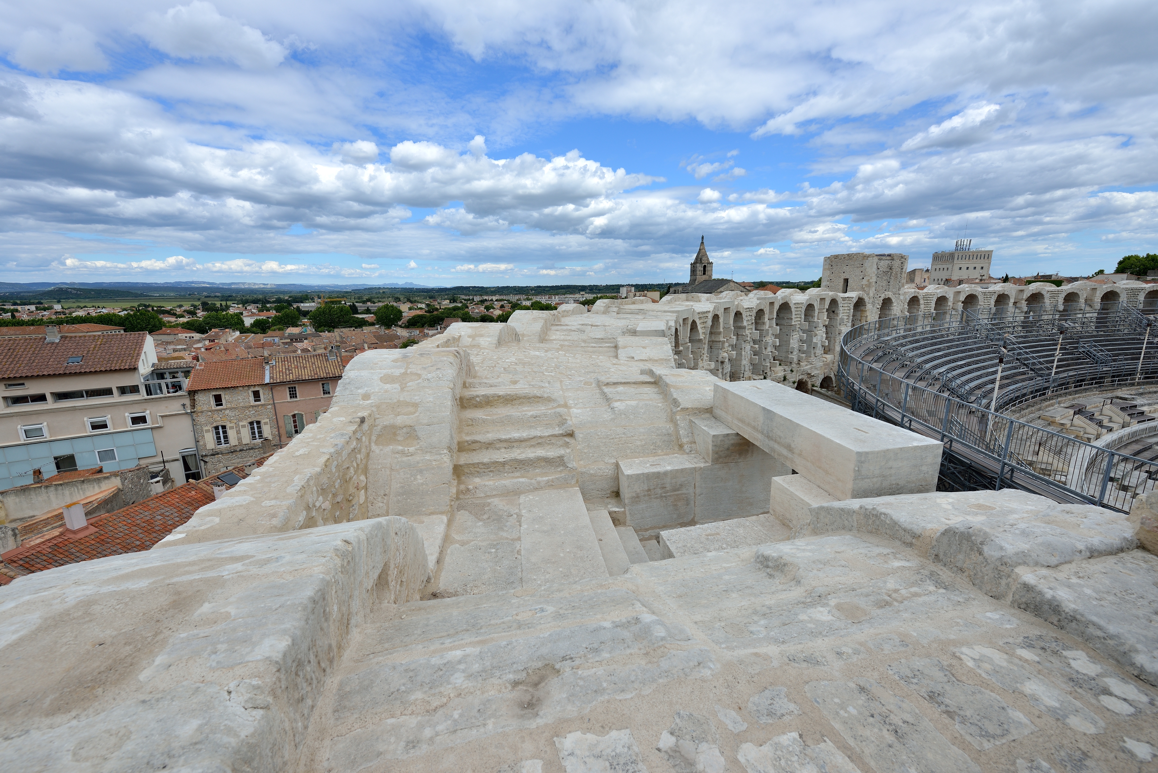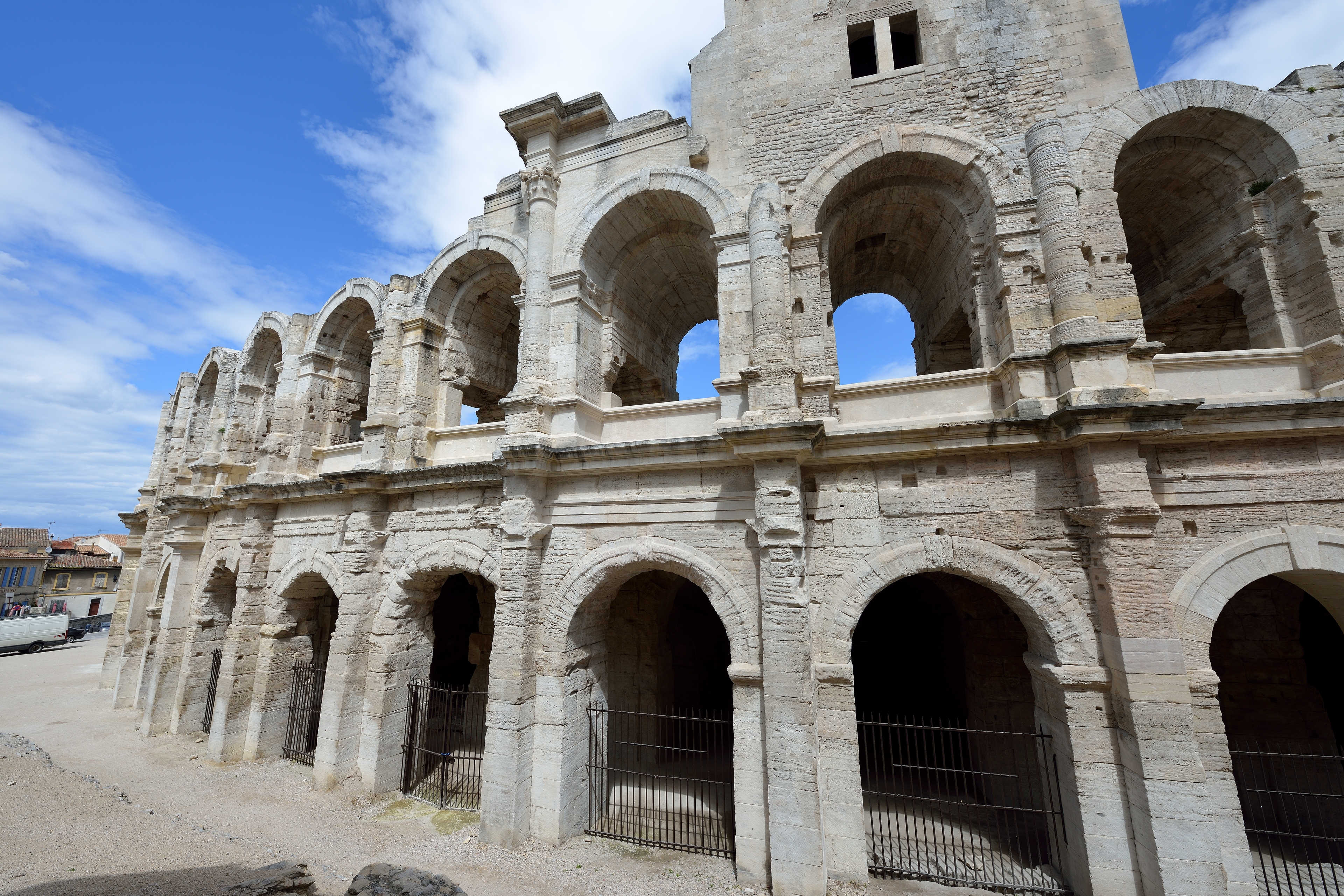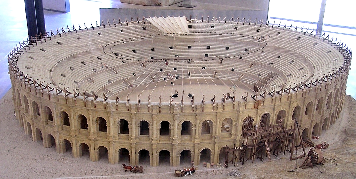 | 円形闘技場 [Amphithéâtre] (15:35) この円形闘技場は、紀元後90年頃、ローマ人が丘を切り開いて造った闘技場で、建材に石灰岩石 (フォンヴィエイユの石*) を使用している。 闘技場の周囲は、石灰岩石で出来た高さ21mの、2層のアーチで壁を形成しており、闘技場全体の形状は楕円形になっている。 以前は3層目の壁があったが、アーチ状ではなく、約5mの壁が続いていた。 中央の高い塔は、5世紀以降、闘技場の中に要塞があった頃に建てられた見張り塔で、その左隣の、柱の上方に、柱模様が残っており、その最上部に四角い板状の壁材が乗っかっているが、嘗ては、さらに、その上に約5mの壁があり、周囲を囲んでいた。 その壁は、日よけの目的で造られていた。 壁に約2m間隔で空けられた縦穴に、木の棒を差し込み、棒から円形闘技場内に張られたロープに、天幕を結わえ付け、日よけにしていた。(参照画像) 現在は、このシステムは無く、闘牛が開かれる時など、日陰席は高くなるそうです。 「東」MAPLay. B * アルルの北東に位置する "フォンヴィエイユ" [Fontvieille] 村 (MAP)で採取された石灰石。 |