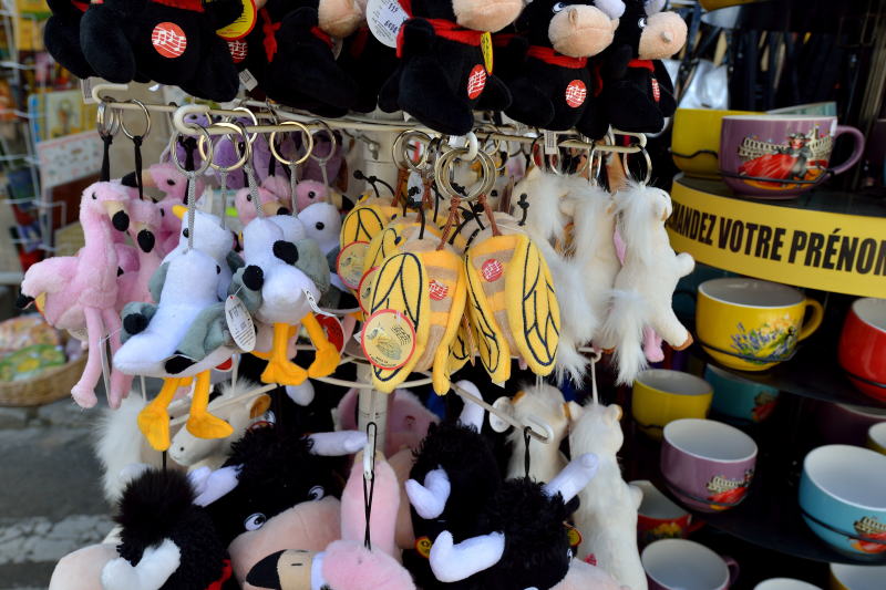 | 円形闘技場の傍にあるお土産店 (15:38) 観光シーズンになると、沢山のお土産店が並んでいる。 ここで、よく目にするのは、蝉で、その他、フラミンゴ、白馬、黒い牛などがモチーフになっている。 これらの動物や野鳥たちは、カマルグ [Camargue] 地方に多く棲息している。 そして、特徴的なのは蝉で、フランスでは南仏にしか棲息しておらず、南仏のシンボルであり、また幸せのシンボルにもなっている。 北ヨーロッパの人達は、光や暖かさを求め、夏は南仏でバカンスを過す人が多い。 (蝉は日陰の温度が26℃以上にならないと棲息できない) 「南西」MAPLay. B |