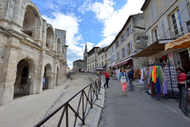 | 闘技場外壁とロータリー [Rond-Point des Arènes] (15:38) 闘技場の周辺には、多くの飲食店やショップが並んでいる。 「南」MAPLay. B |