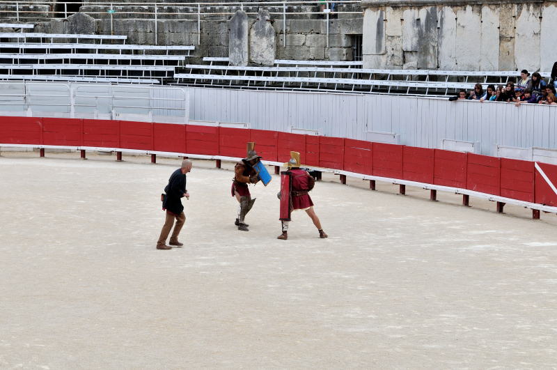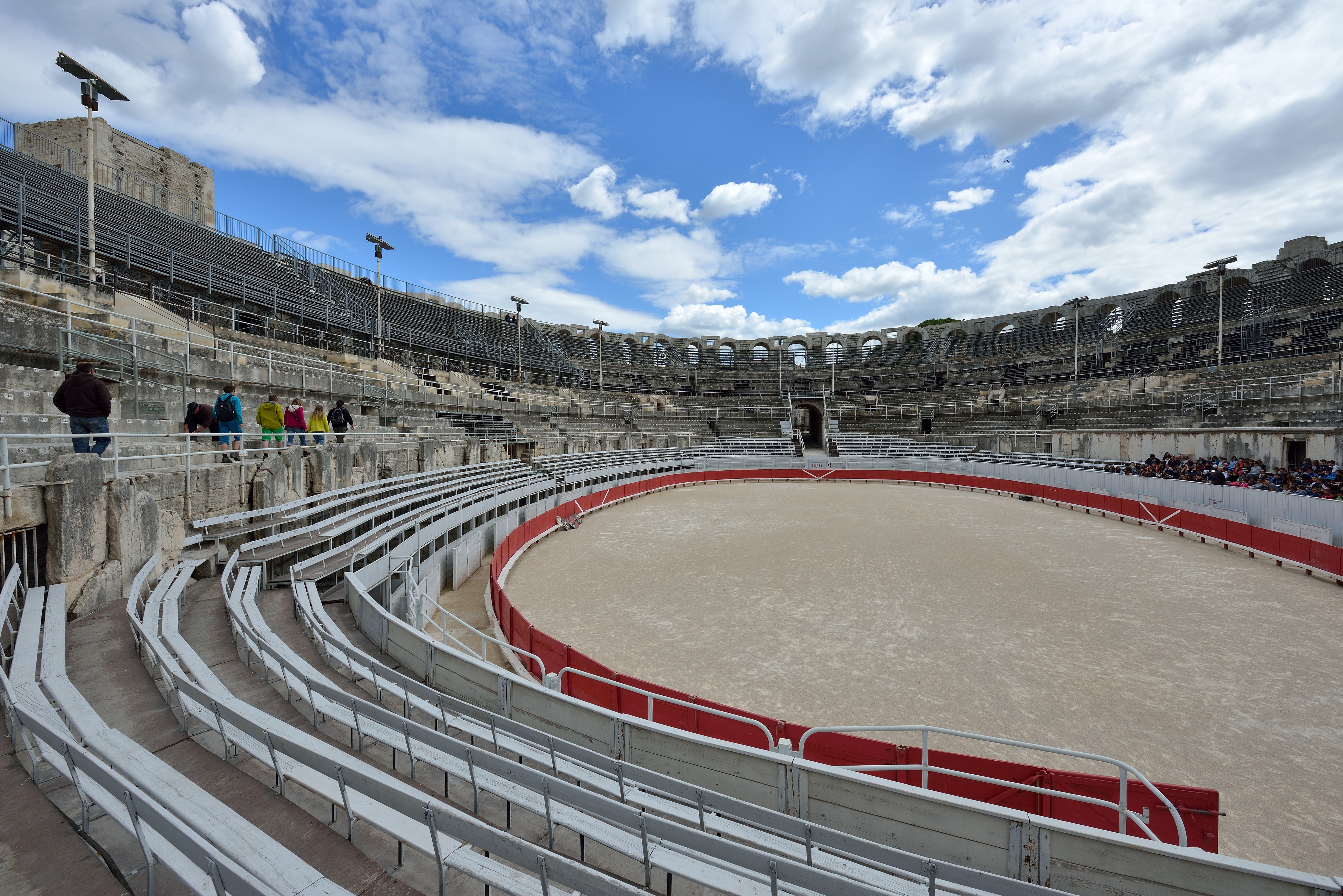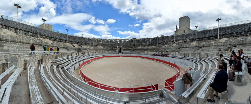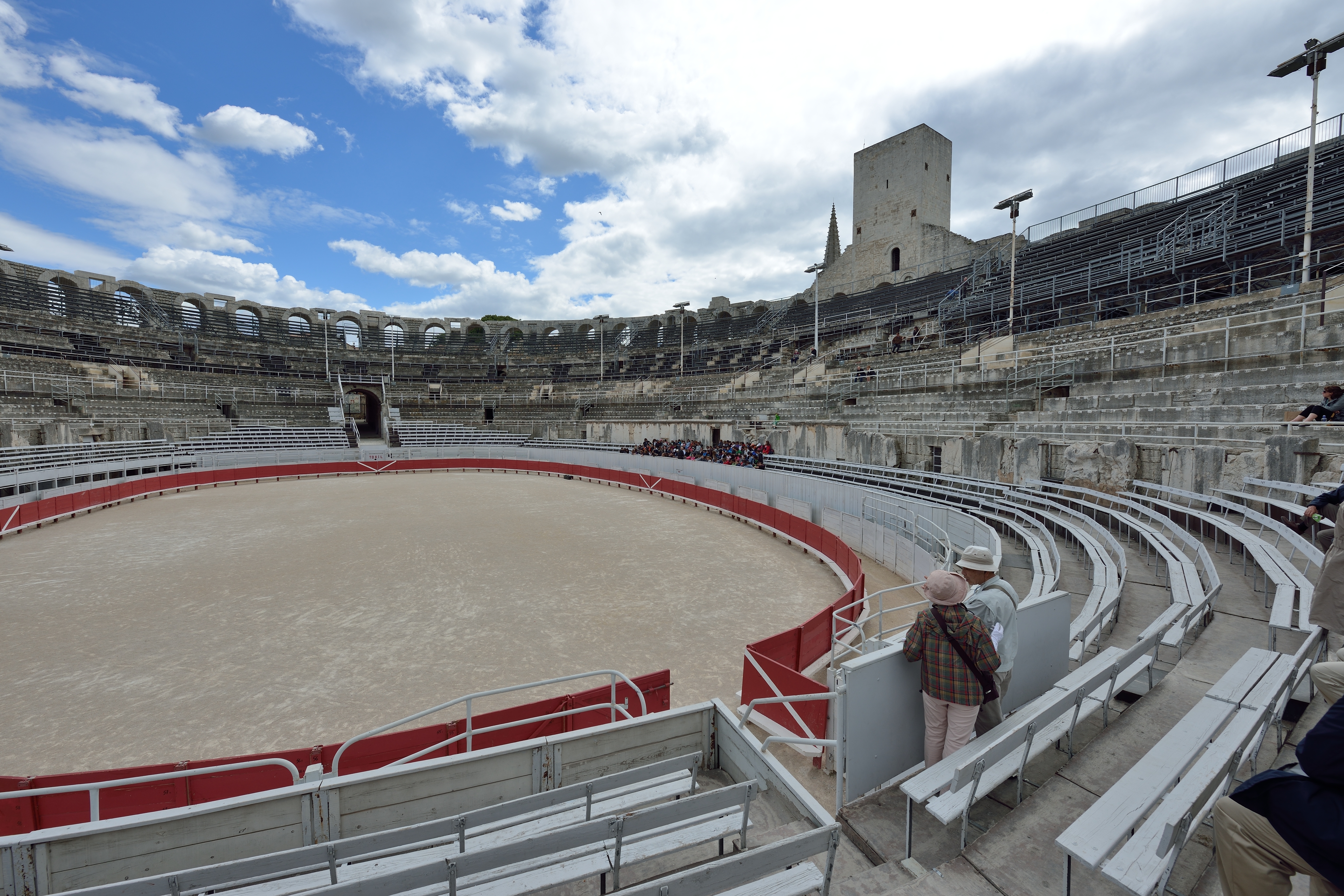 | 闘技場で行われる闘牛の様子 (15:57) 1853年以降、毎年 "キリストの復活祭" と秋の "米の収穫祭" には、闘牛場として使用されている。 この闘牛は、17世紀にスペインから南仏に伝わったもので、内容はスペインの闘牛と同じ。 MAPLay. C |