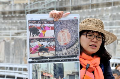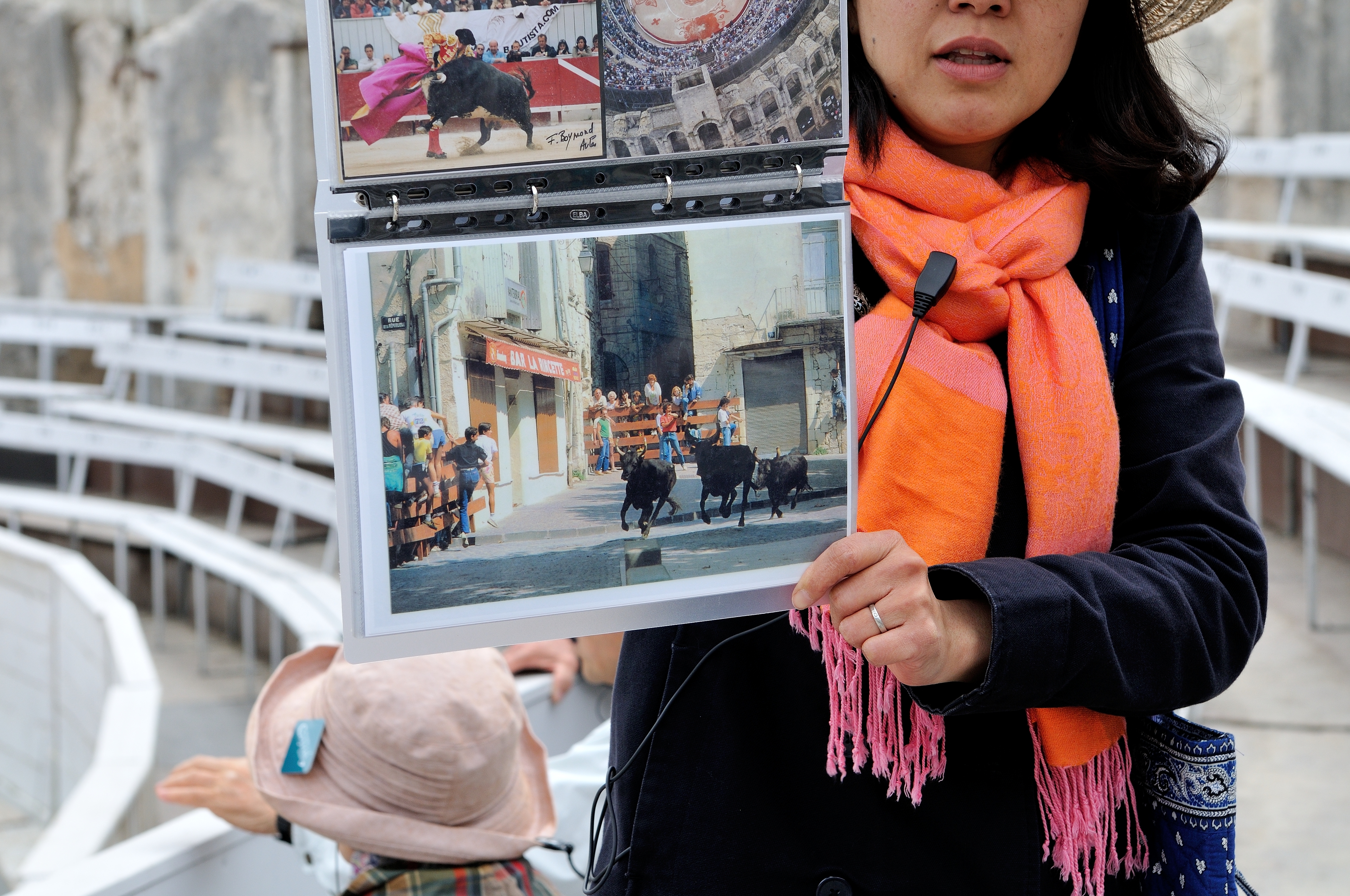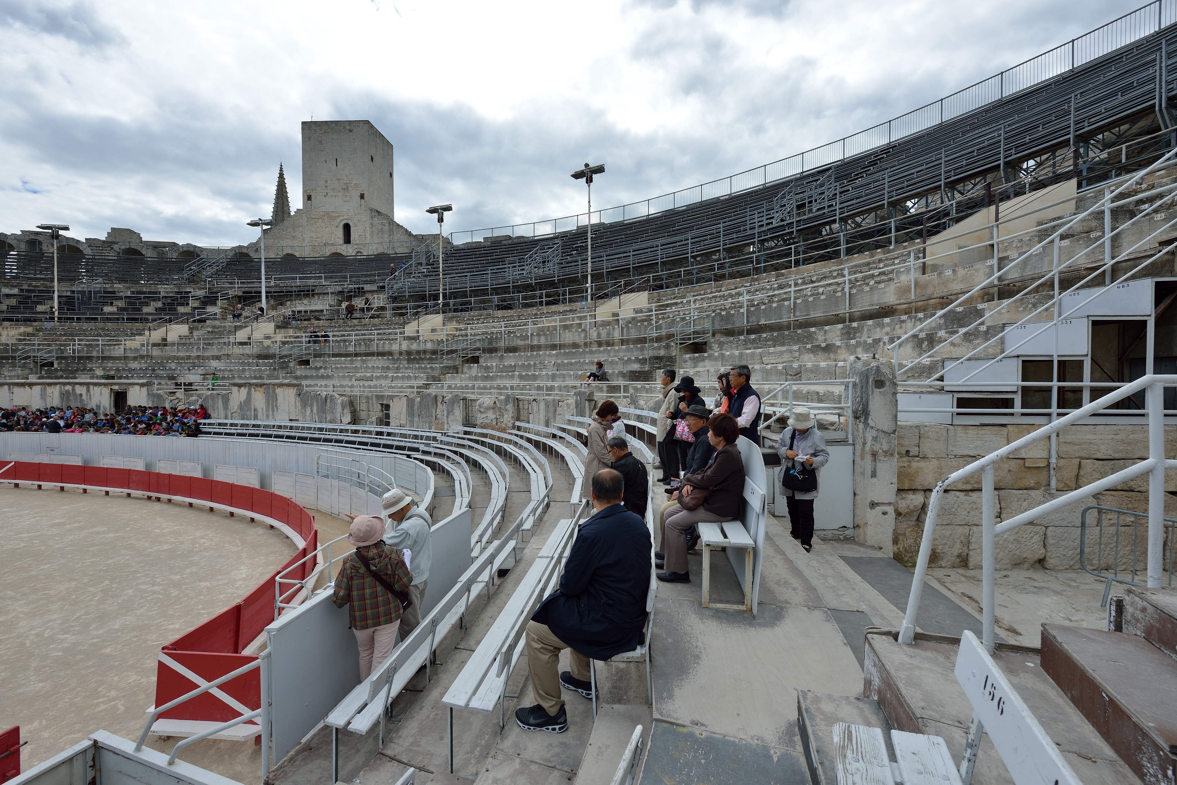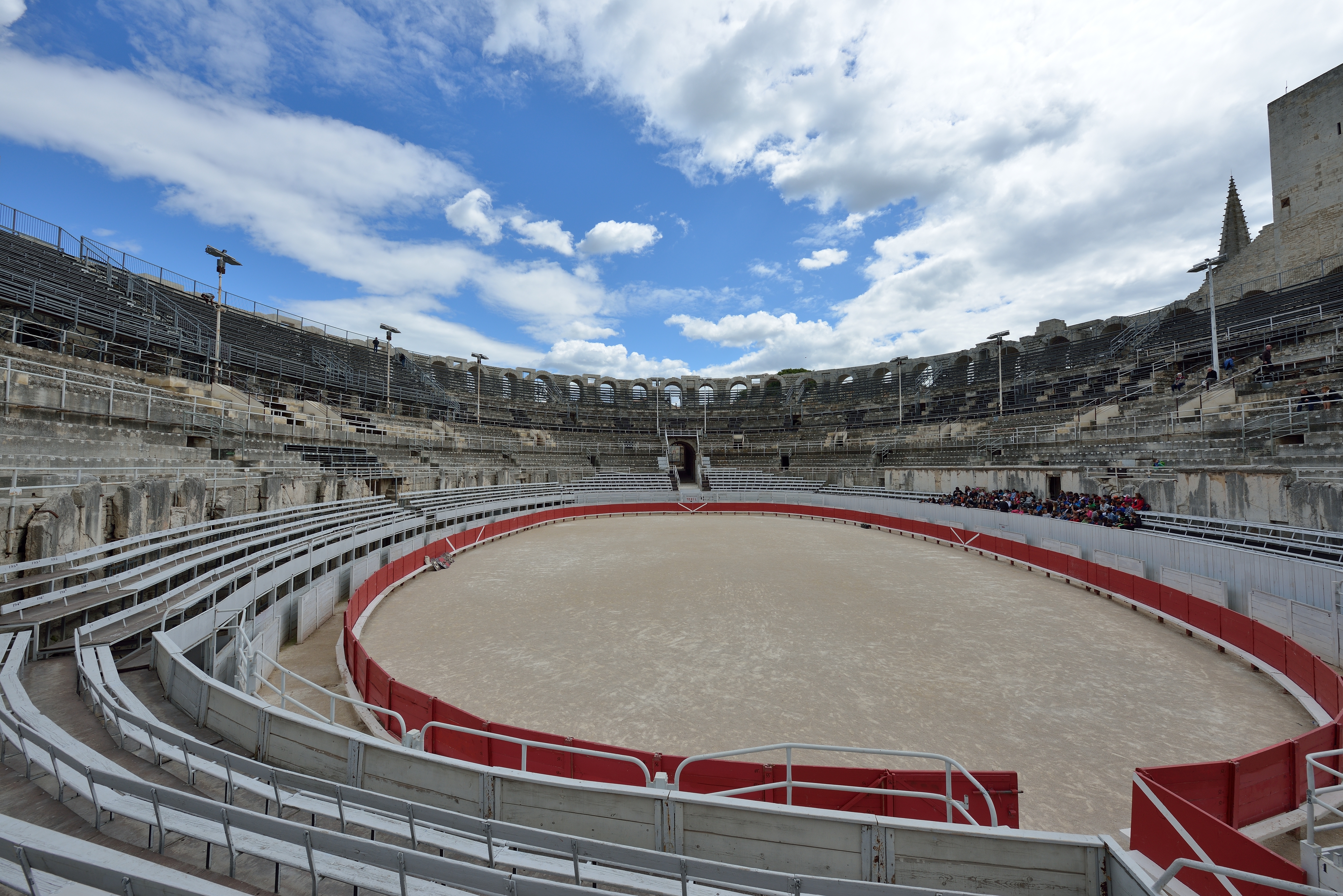 | 闘技場で行われる闘牛の様子 (15:57) 1853年以降、毎年 "キリストの復活祭" と秋の "米の収穫祭" には、闘牛場として使用されている。 この闘牛は、17世紀にスペインから南仏に伝わったもので、内容はスペインの闘牛と同じ。 MAPLay. C |