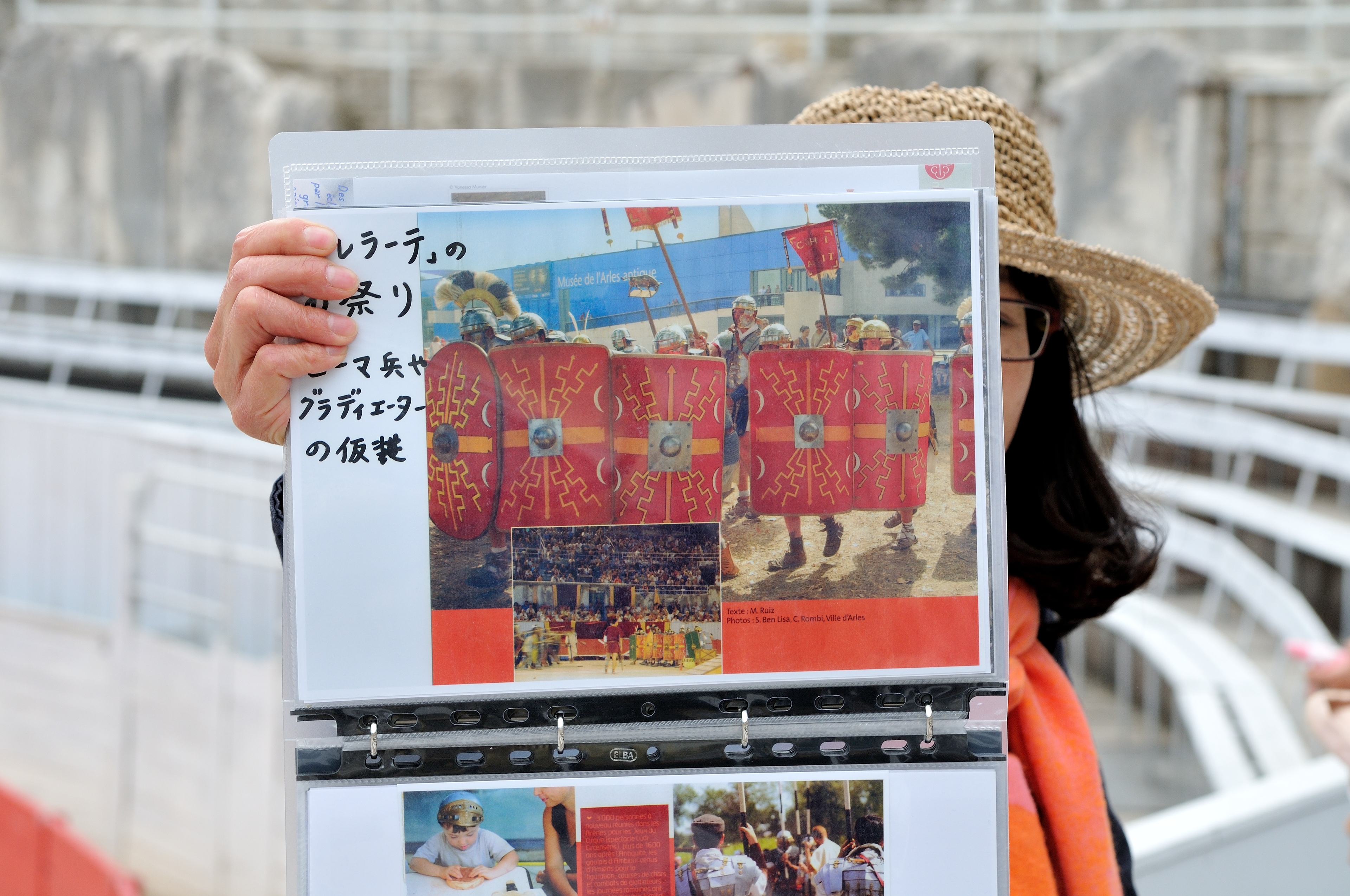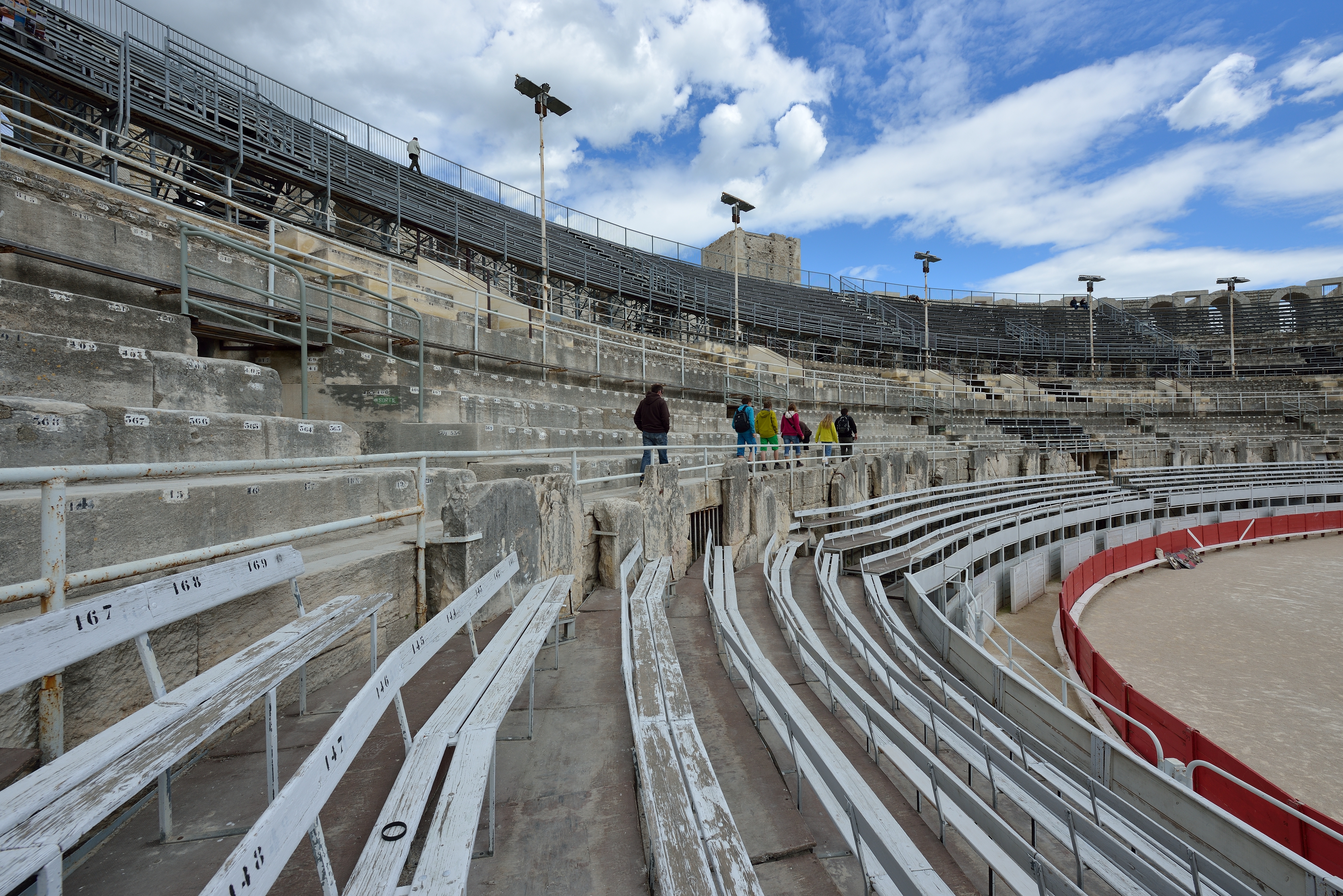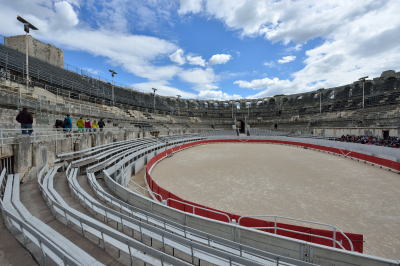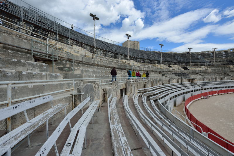 | 円形闘技場 [Amphithéâtre] (15:45) この闘技場は、楕円形をしており、縦136m、横幅104m~106m、高さは嘗て約21mあった。 収容人数は約24000人以上で、嘗ては、188の通路があり、身分の違う人達が顔を会わす事なく、10分間で入退場できたと言われている。 右手の階段席に座っている観客の背後にある四角い穴は、グラディエーターが使用していた出入り口で、今は、無くなっているが、嘗ては高床があり、その床の上で闘技が行われていた。 高床の上には、闘いで流された血を覆い隠すため、砂が撒かれ、床下には猛獣たちの待機用の檻があった。 現在は高床は無いが、闘牛が行われるため、地面に砂が撒かれている。 「南」MAPLay. C |