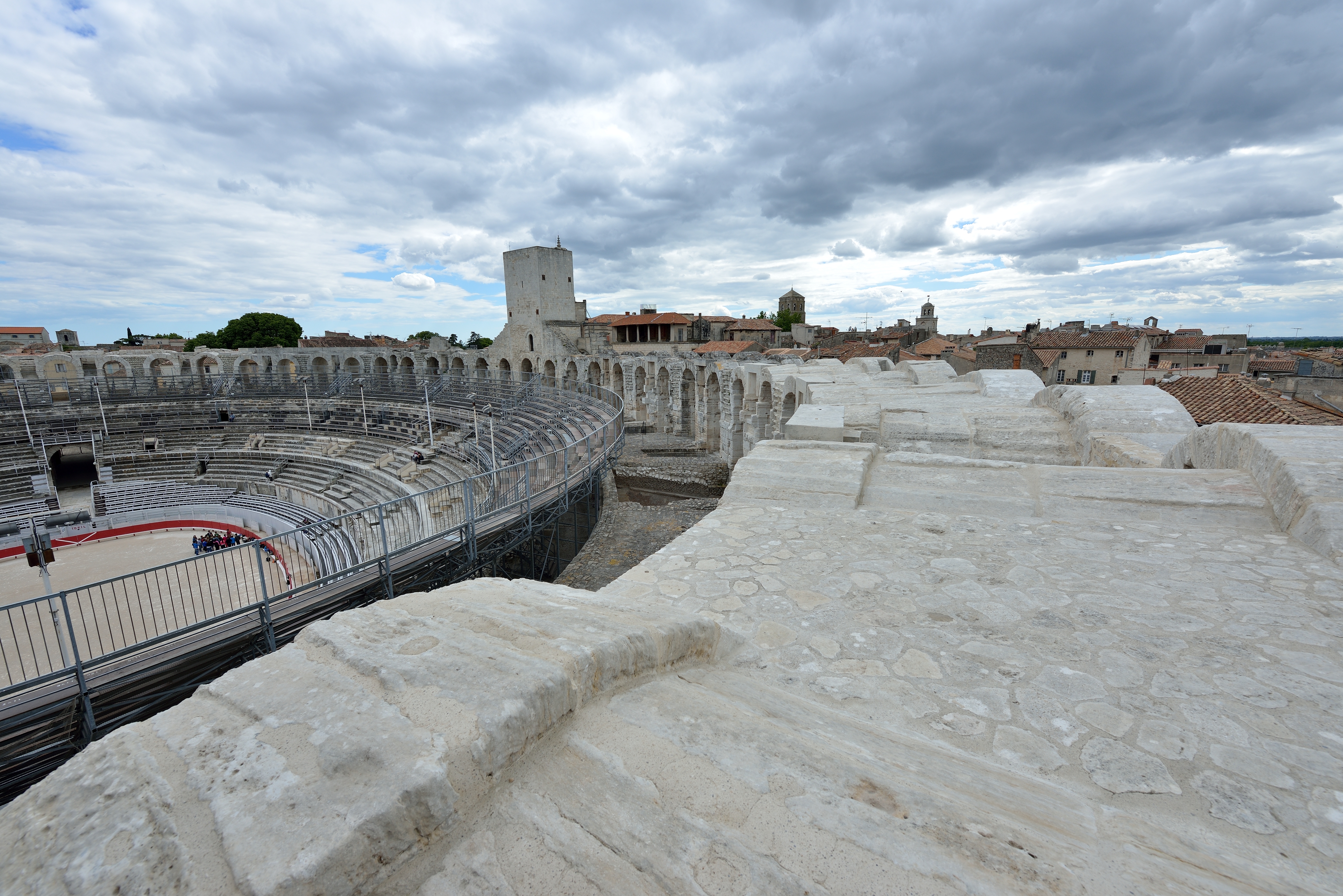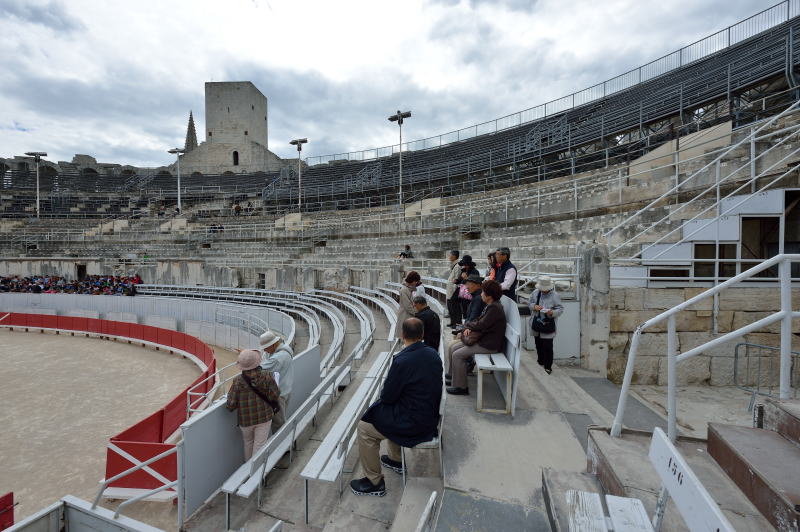 | 円形闘技場 [Amphithéâtre] (15:37) 右手の高い塔は、5世紀以降、闘技場の中に要塞があった頃に建てられた見張り塔。 「南東」MAPLay. B |