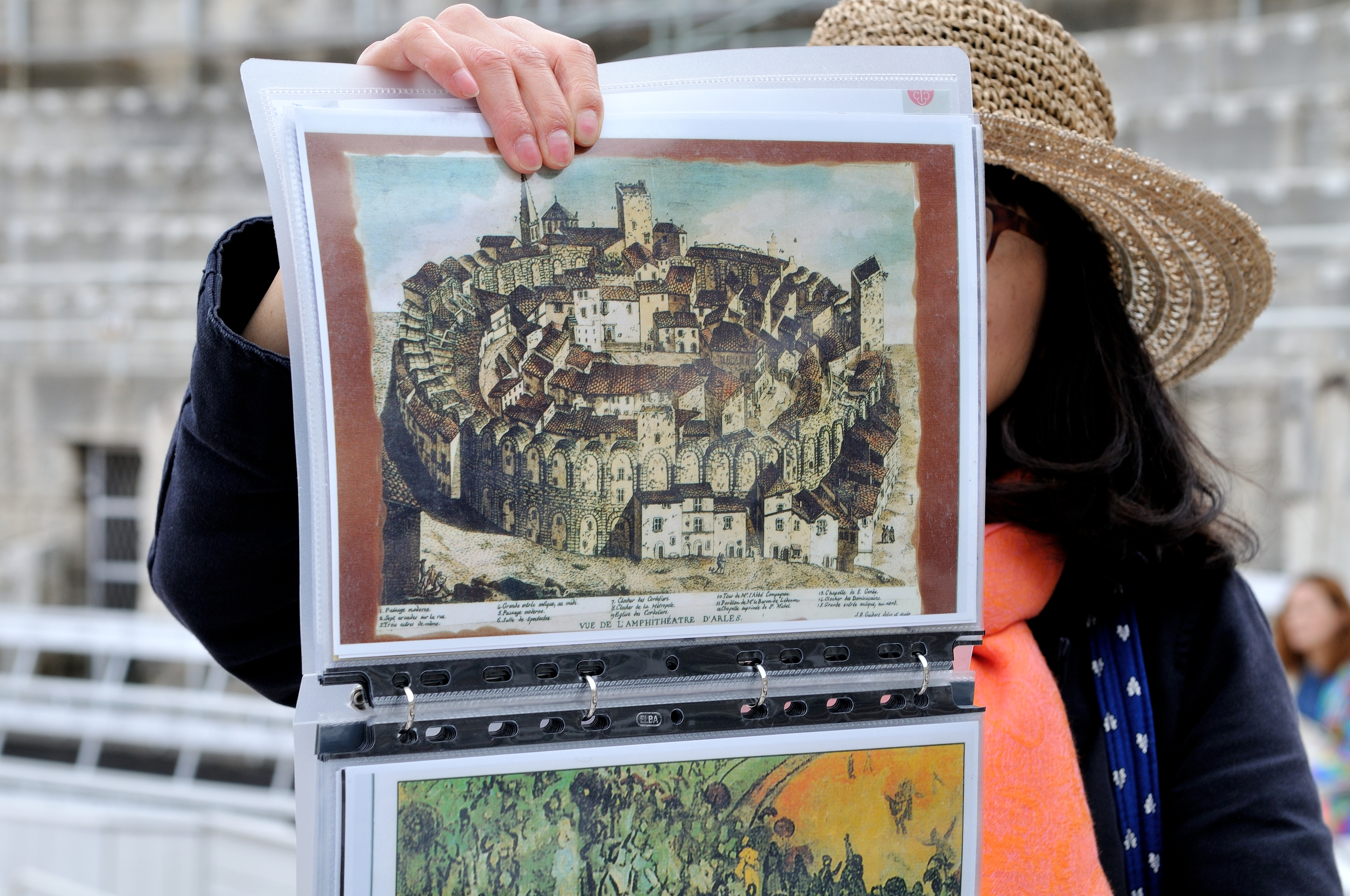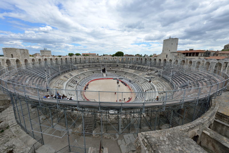 | 円形闘技場 [Amphithéâtre] (15:46) 今残っている階段席の内、約4段目までがローマ時代のもで、それより上部の、小さな石組みで造られた階段席は18世紀の時代に再現されている。 昔は、グラディエーターの闘い、猛獣と奴隷との闘いなどが行われていたが、404年にキリスト教が伝わって以来、それらの闘いは禁止された。 その後、ローマ軍は徐々に衰退し、5世紀以降は、多くの侵略者が押し寄せて来るようになった。 そのため、この闘技場の中に、古代劇場の建材を使って要塞を築き、 外側のアーチには、煉瓦で壁が出来、外側、内側に民家が造られた。 要塞の中には、2軒の礼拝堂と212軒の民家が築かれていて、身を守りながら生活してた。 そして、この状態は18世紀頃まで続いた。 18世紀以降、使われなくなった要塞を市長が買い取り、現在の状態に再建した。 (参考資料画) 1853年以降、毎年 "キリストの復活祭" と秋の "米収穫祭" [Fete du Riz] には、闘牛場として使われている。 (Feria d'Arles) 「東」MAPLay. C |