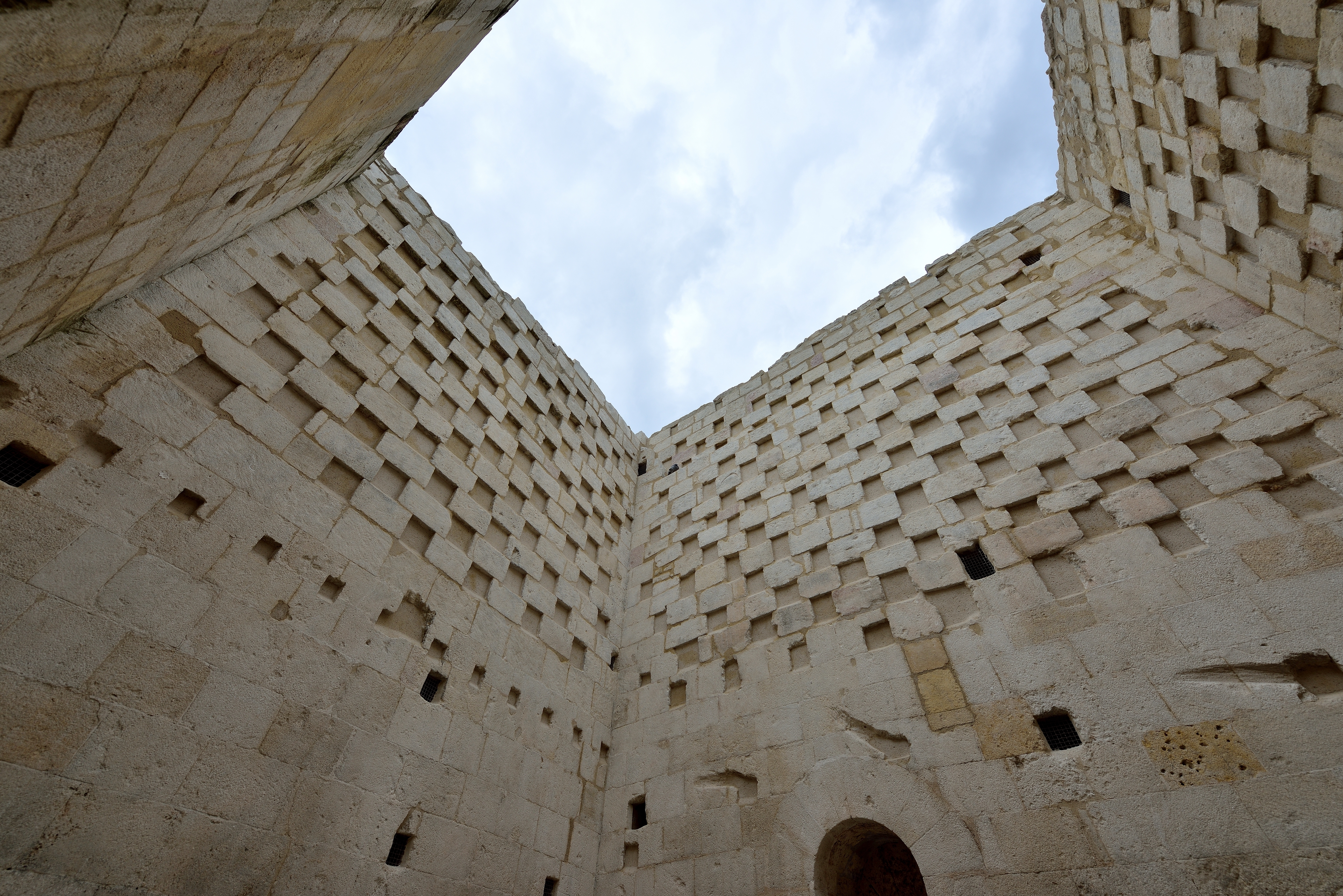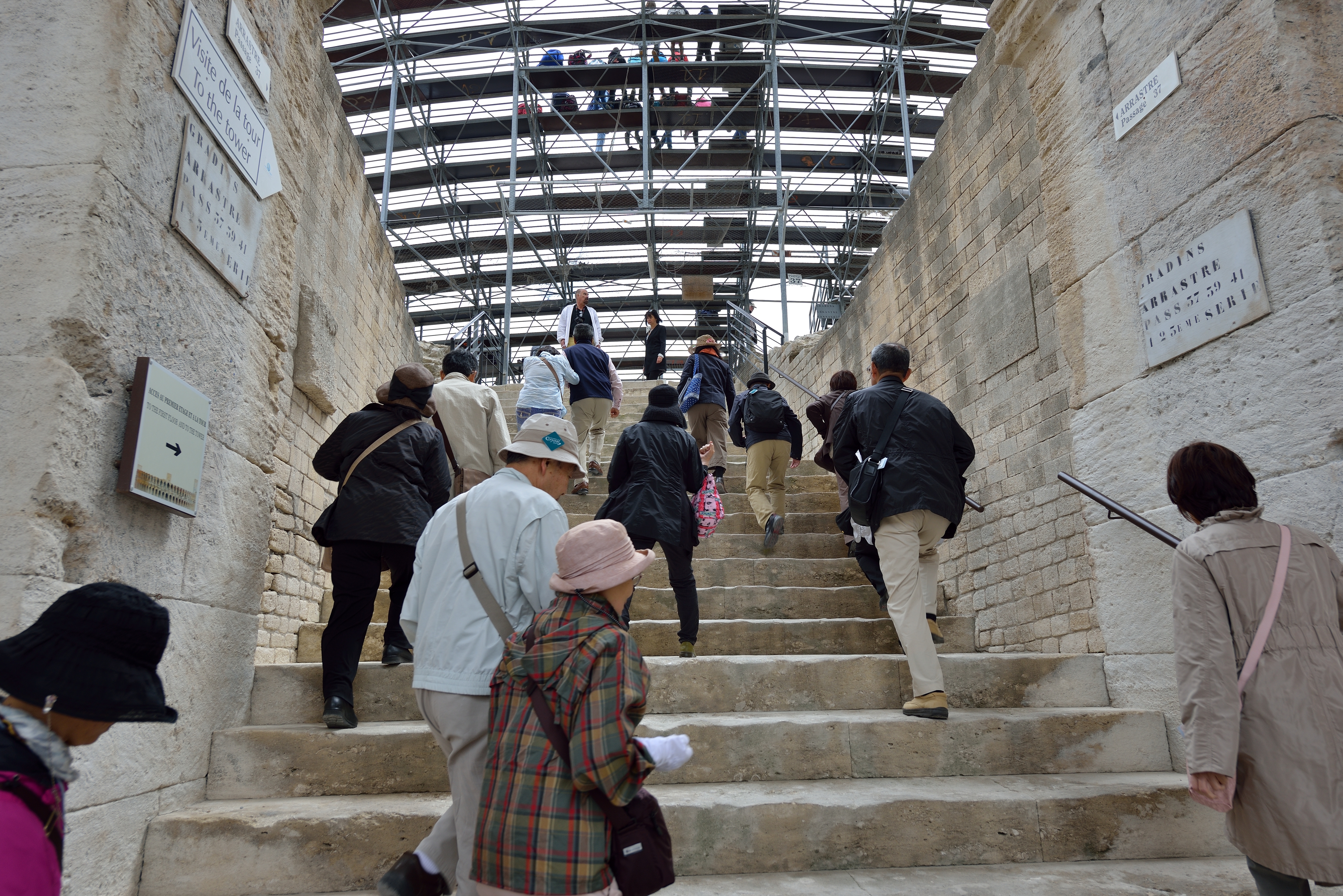 | 要塞として使用されていた時代の見張り塔 (16:03) 一層目のアーチ上から二層目のアーチ上にある見張り塔へ向かう。 嘗て、要塞があった時代には、東西南北と、四つの見張り塔があったが、現在は3塔だけ残っていて、その内、北側の塔の途中 (2層目のアーチの上) まで登ることが出来る。 上からは、ローヌ川 [Le Rhône] 、アルル [Arles] の街並み、アルピーユ山脈 [Les Alpilles] (MAP) を一望することができる。 「西」MAPLay. C |