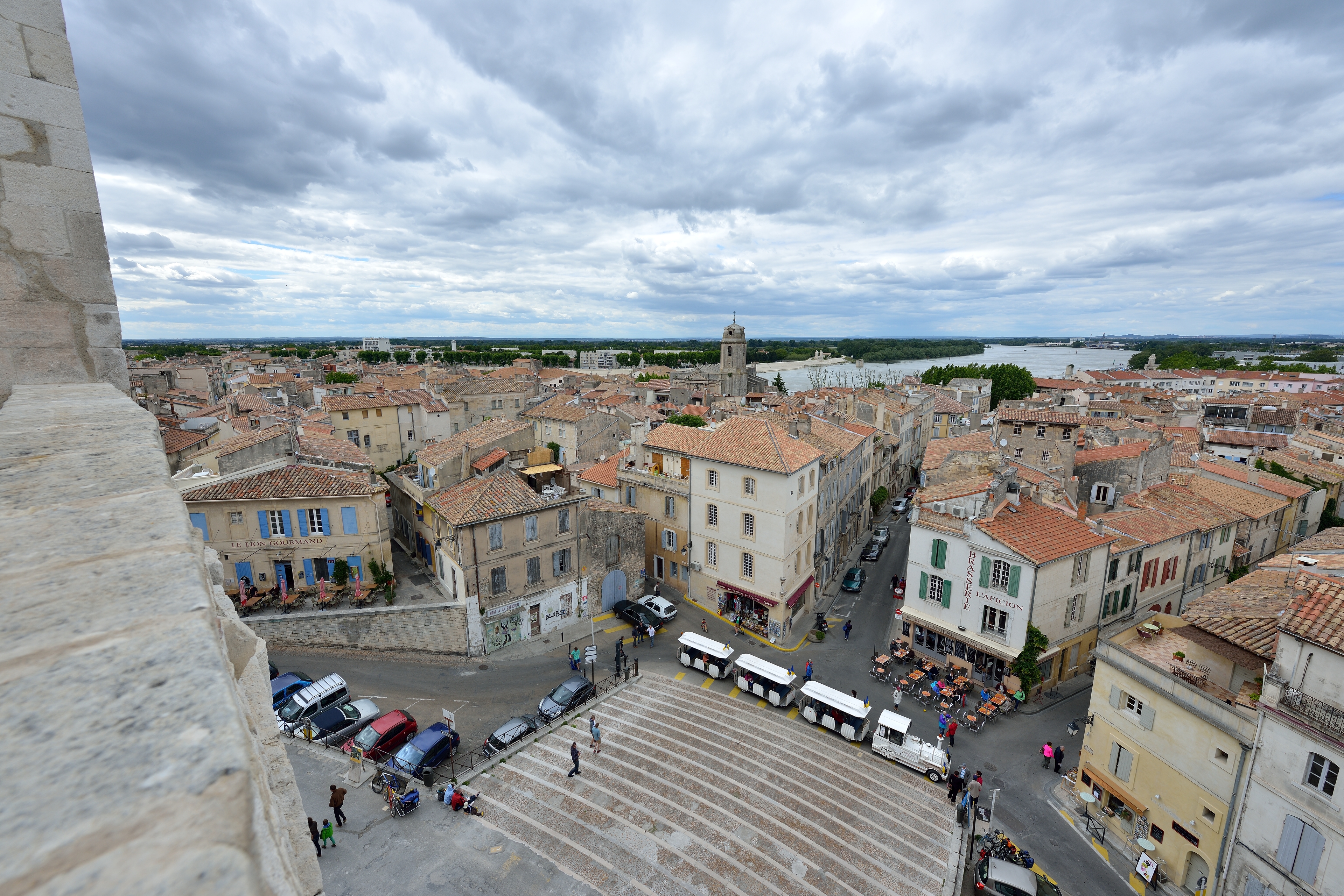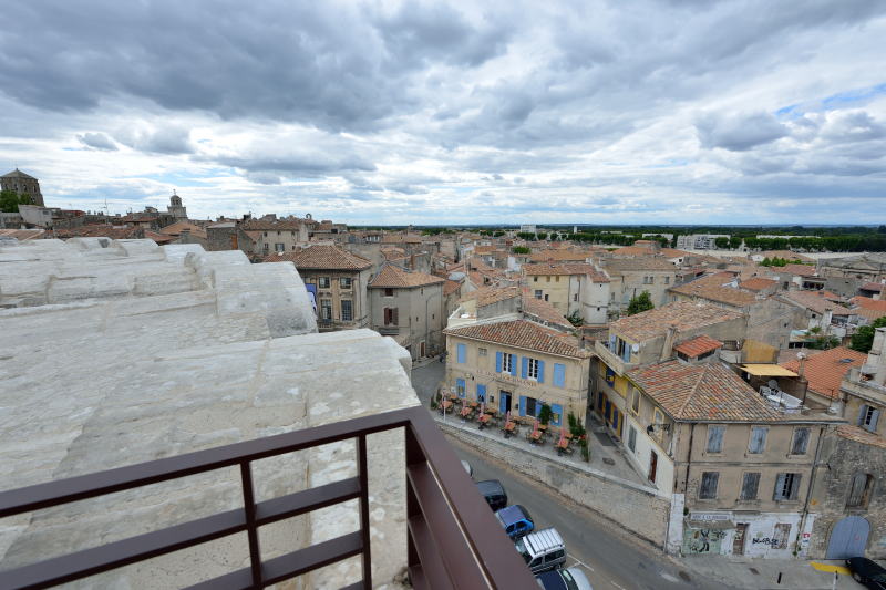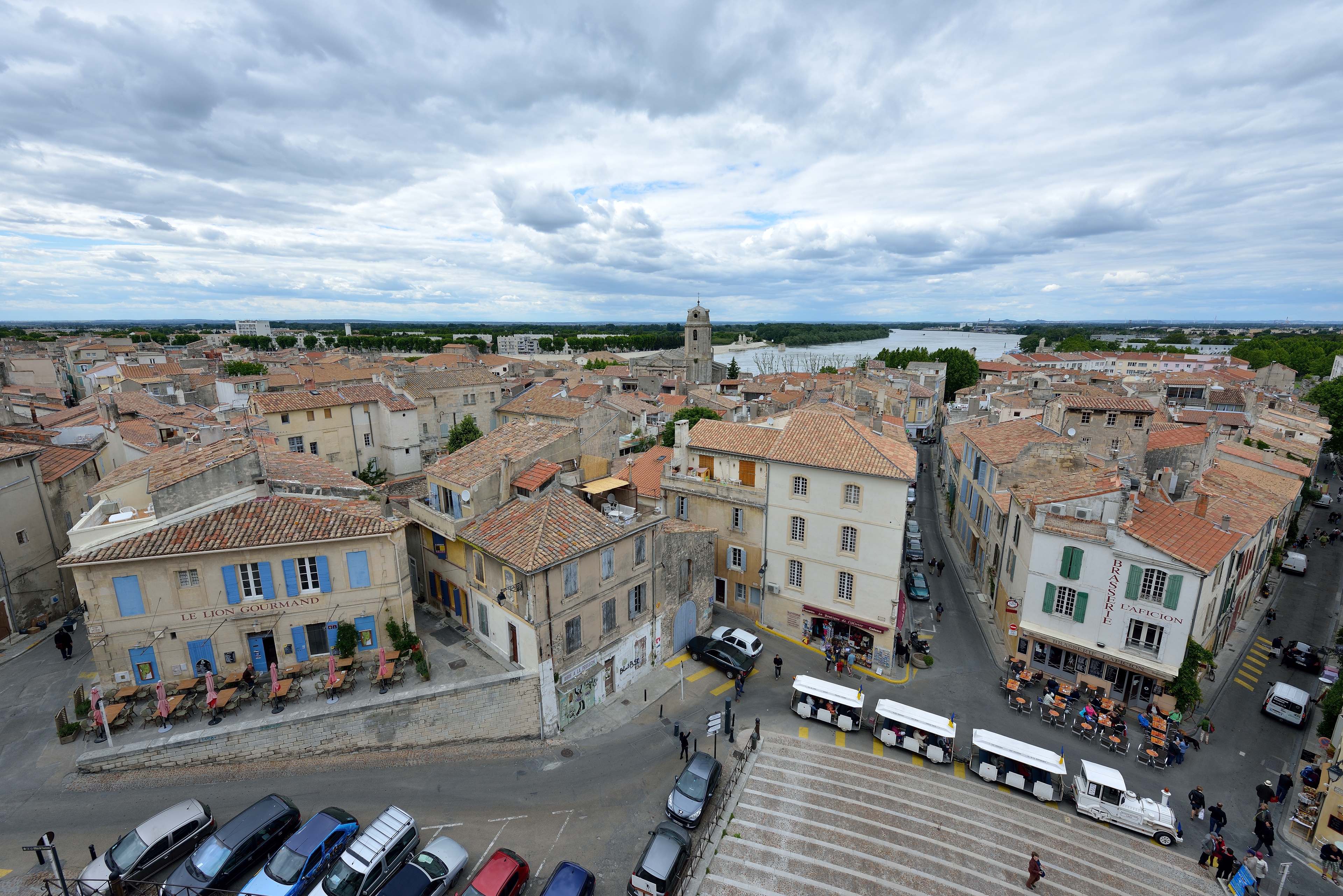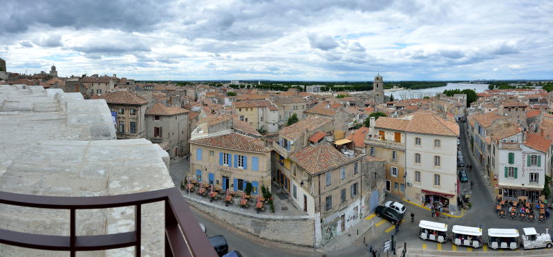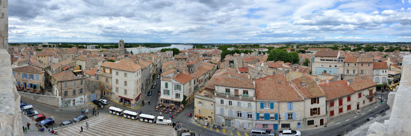 | 見張り塔のテラスからの眺望 (16:05) アルルの街並みとローヌ川。 右奥の、背の低い山脈は、アルピーユ山脈 [Les Alpilles] (MAP) で、この山脈から運ばれた石材で、円形闘技場が造られている。 また、この地方では、沢山のオリーブが採れ、世界で一番美味しいオリーブオイルが採れる事でも有名。 アルピーユ山脈の手前に2つの丘があり、その左の丘に古城が建っている。 これは、 10世紀にベネディクト派の礼拝堂として創建。 12世紀から13世紀にかけて増改築を続け、プロバンス地方最大級のロマネスク様式の修道院になった、モンマジュール修道院 [Abbaye de Montmajour] (MAP) で、1981年に円形闘技場などと併せて、世界遺産 「アルルのローマ遺跡とロマネスク様式建造物群」 として登録されている。 (遠方のほぼ中央) 「北東」MAPLay. C |