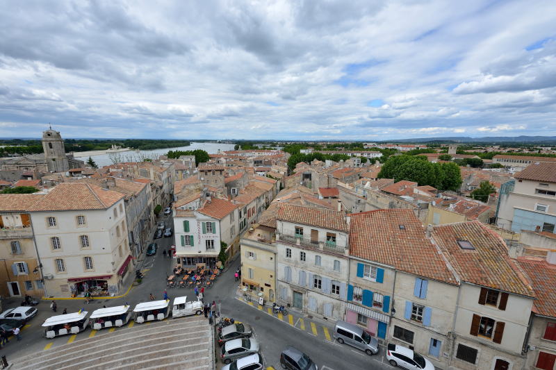 | 見張り塔のテラスからの眺望 (16:05) アルルの街並みとローヌ川。 ローヌ川 [Le Rhône] は、スイスのサン=ゴタール山塊のローヌ氷河に源を発し、レマン湖を経由して、フランス国内に入る。 そして、リヨン [Lyon] 、アビニヨン [Avignon] 、アルル [Arles] を流れて、地中海へ注いでいる。 この川は、ここから、2km ほど上流で、二又に分岐し、本流のグラン・ローヌ川 [Le Grand Rhône] と西側へ流れるプティ・ローヌ川 [Le Petit Rhône] に分かれている。 この二つの川と地中海に囲まれた三角州地帯は カマルグ [Camargue] (MAP)と呼ばれる湿地帯になっており、ここでは昔から野生の白馬が棲息しており、今はガーディアン達 [Guardians] に守られながら、闘牛で活躍する牛や馬が放牧されている。 また、多くの野鳥が棲息し、中でもフラミンゴは有名で、一年中見ることが出来る。 秋の米収穫祭 [Fete du Riz] は、この地での、米の収穫を祝ったお祭りで、フランスでは珍しい稲作地帯にもなっている。 この時期には、円形闘技場で闘牛が行われる。 (闘牛は、春のイースターの時期にも行われる) 写真に写っている川は、本流のグラン・ローヌ川で、単にローヌ川と呼ばれている。 「北」MAPLay. C |
