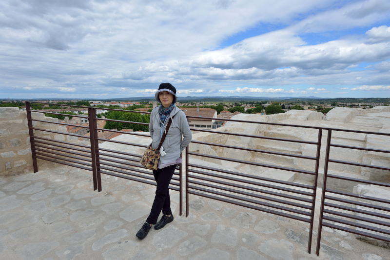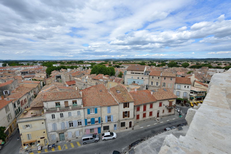 | 二層目のアーチ上の景色 (16:06) 中央のやや右に見える教会は、17世紀時代のノートルダム・デュラ・マジョー [Notre Dame de la Major] (MAP) 教会。 この地方には、ガーディアン [Guardian] (カウボーイに相当) と言う職業があり、この人達の守護聖人が祀られている教会。 毎年5月1日には、お祭りがあり、ガーディアン達 [Guardians] を始め沢山の人達がこの教会に集まる。 「東」MAPLay. C |