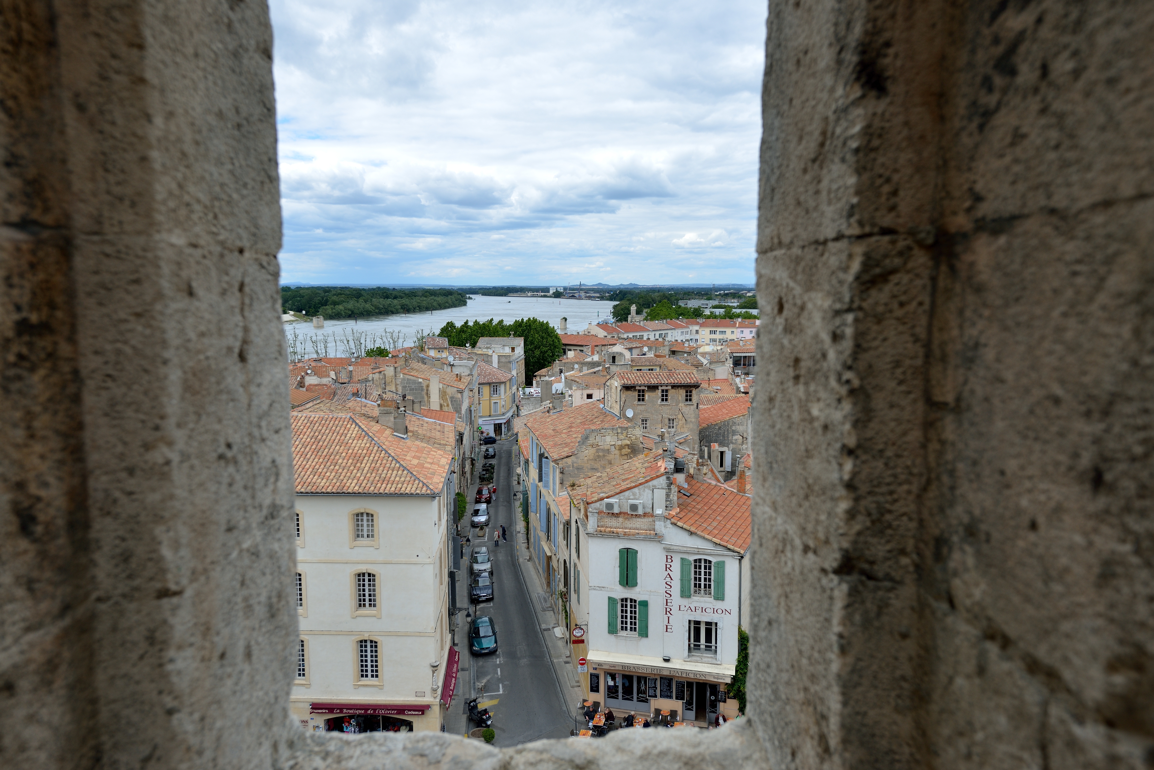 | 見張り塔の窓から見るローヌ川とアルルの街並み (16:08) 中央に見える通りは、アンフィテアトル通り [Rue de l'Amphithéâtre] 。 「北北西」MAPLay. C |