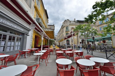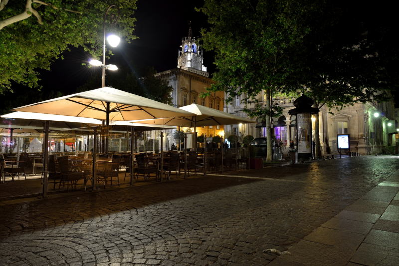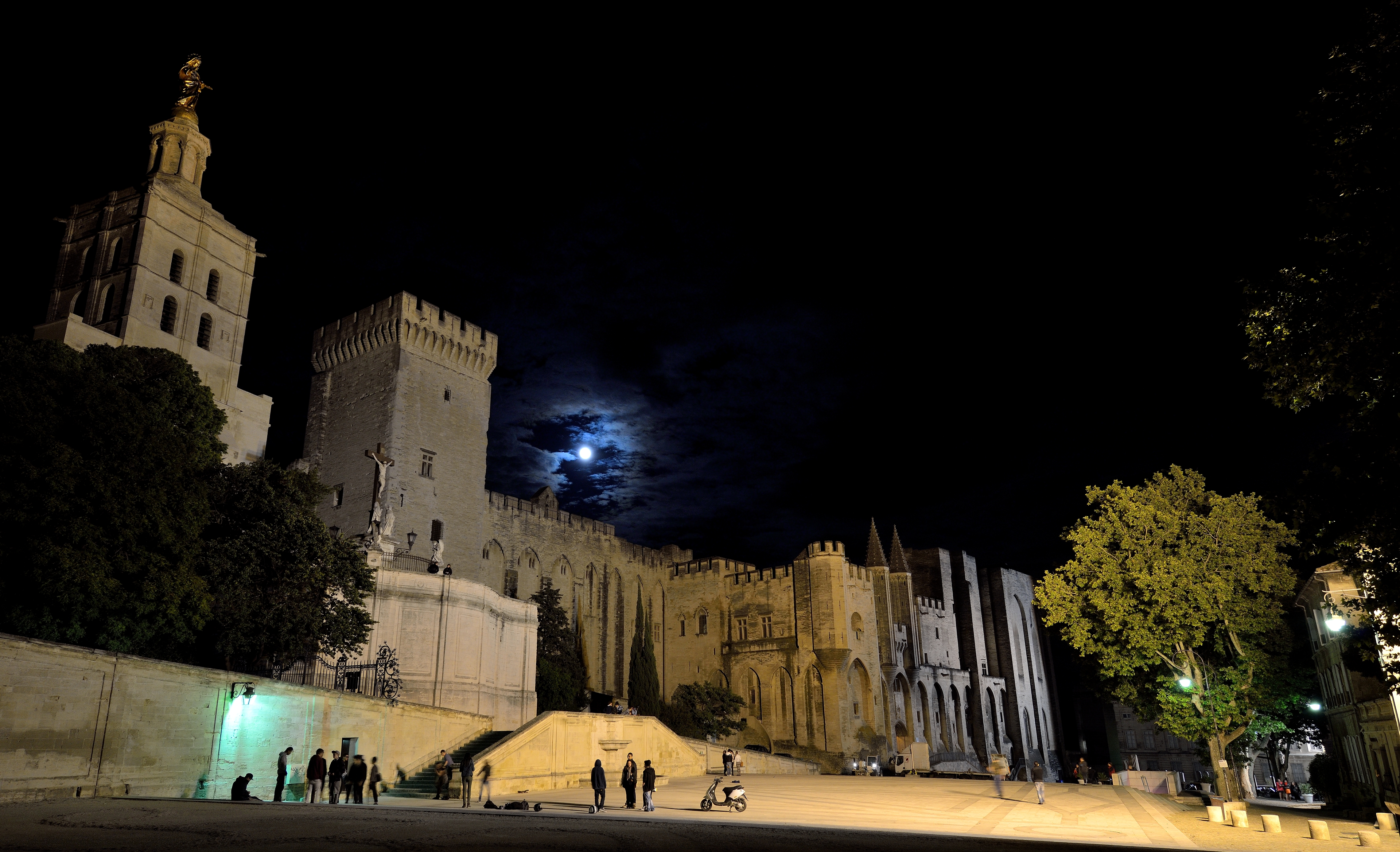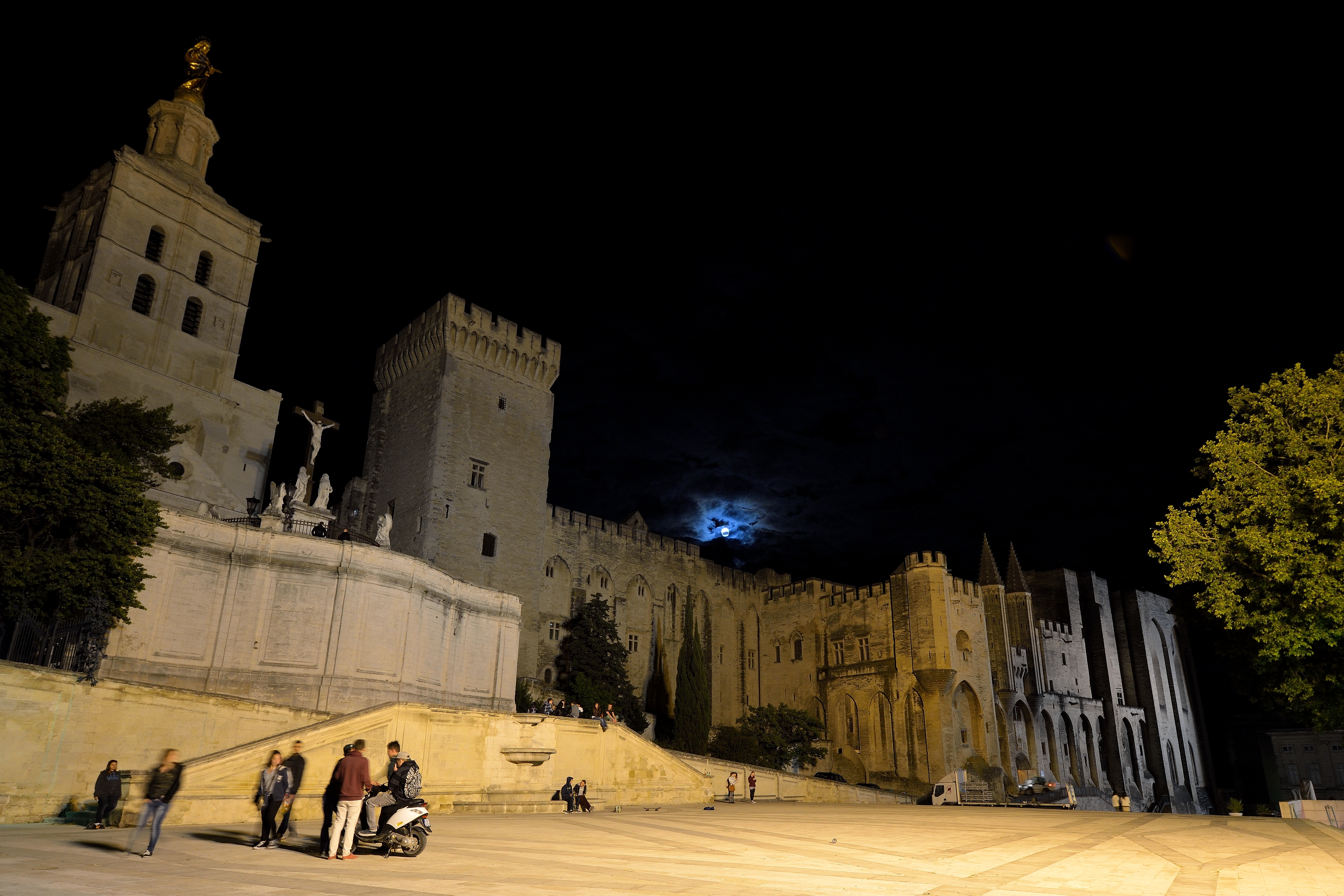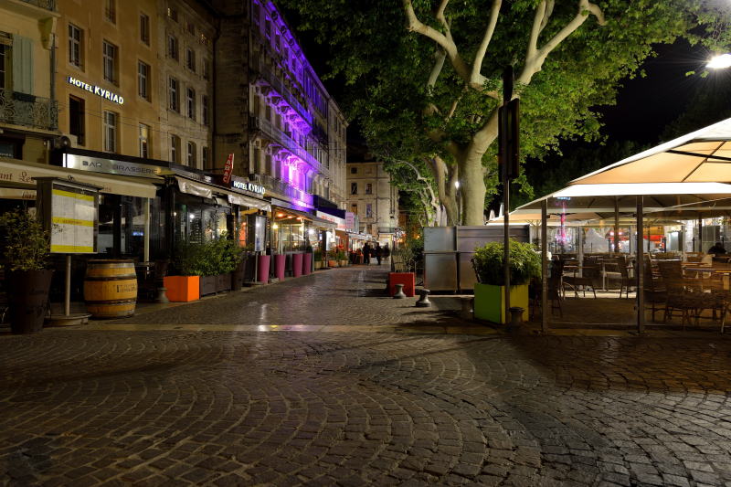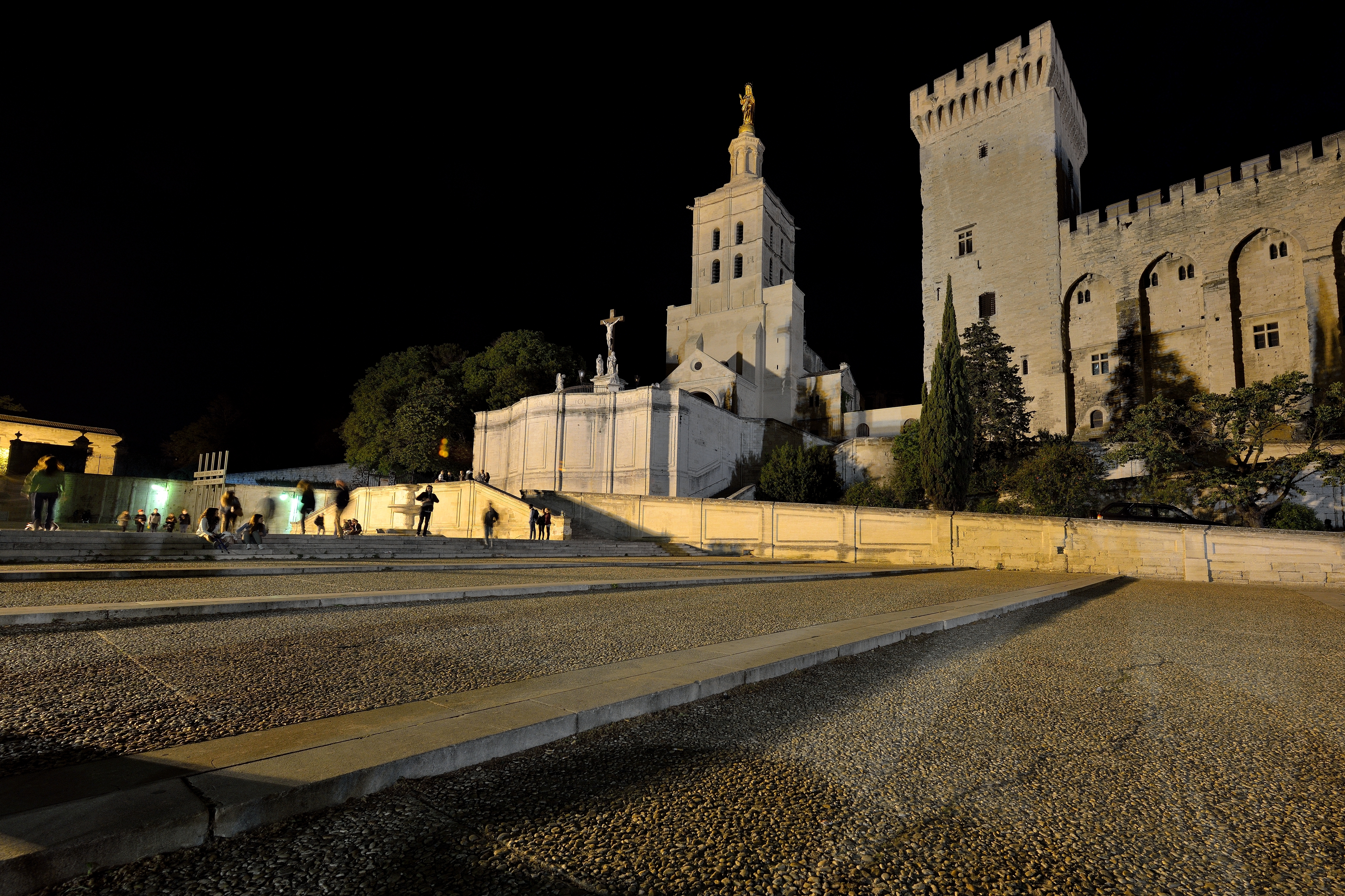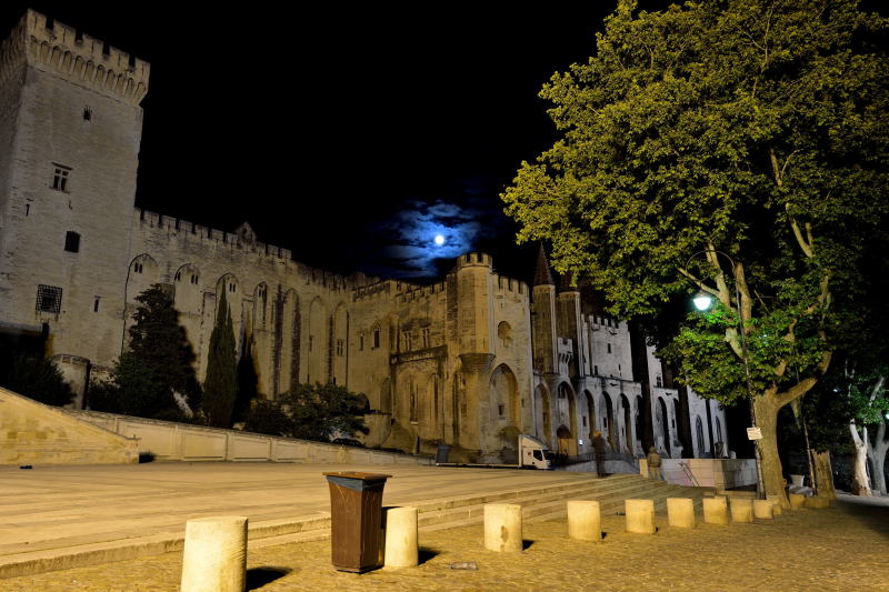| 時計台広場 [Place de l'Horloge] (23:20) カフェやレストランのテラス席が並び、いつも賑わう街の中心となる広場。 法王庁宮殿 (教皇庁宮殿) の南西に位置し、広場には名前の由来にもなっている14~15世紀の時計塔をもつ市庁舎や、19世紀のオペラ劇場などが建っている。 「南西」MAPLay. E |
