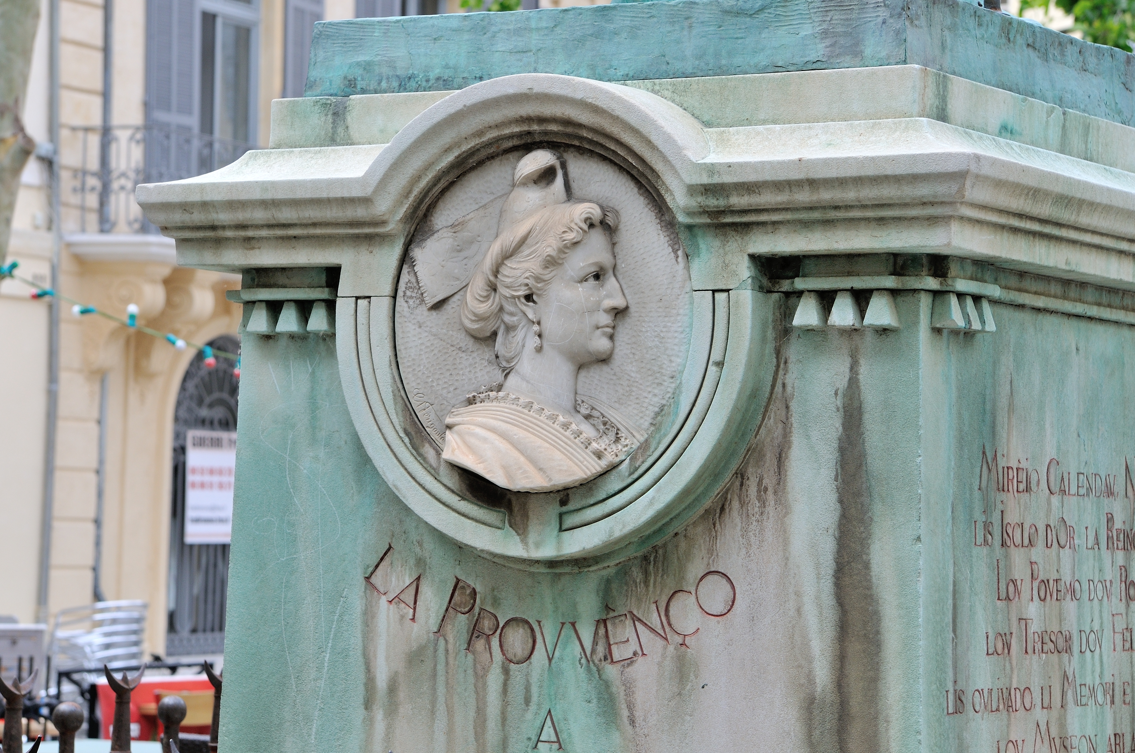 | 第一代目アルルの女王のレリーフ (16:25) フレデリック・ミストラル [Frédéric Mistral] の銅像の足元にある、第一代目アルルの女王のレリーフ。 フレデリック・ミストラルが "アルルの女王祭り" を創始した事に因んで、第一代目女王のレリーフが飾られている。 初代の女王は、1930年4月にフレデリック・ミストラルの生誕100周年を記念して、"アンジェラ・ヴェルネ" [Angèle Vernet] が初代の女王として選ばれている。 「北北西」MAPLay. D |