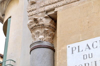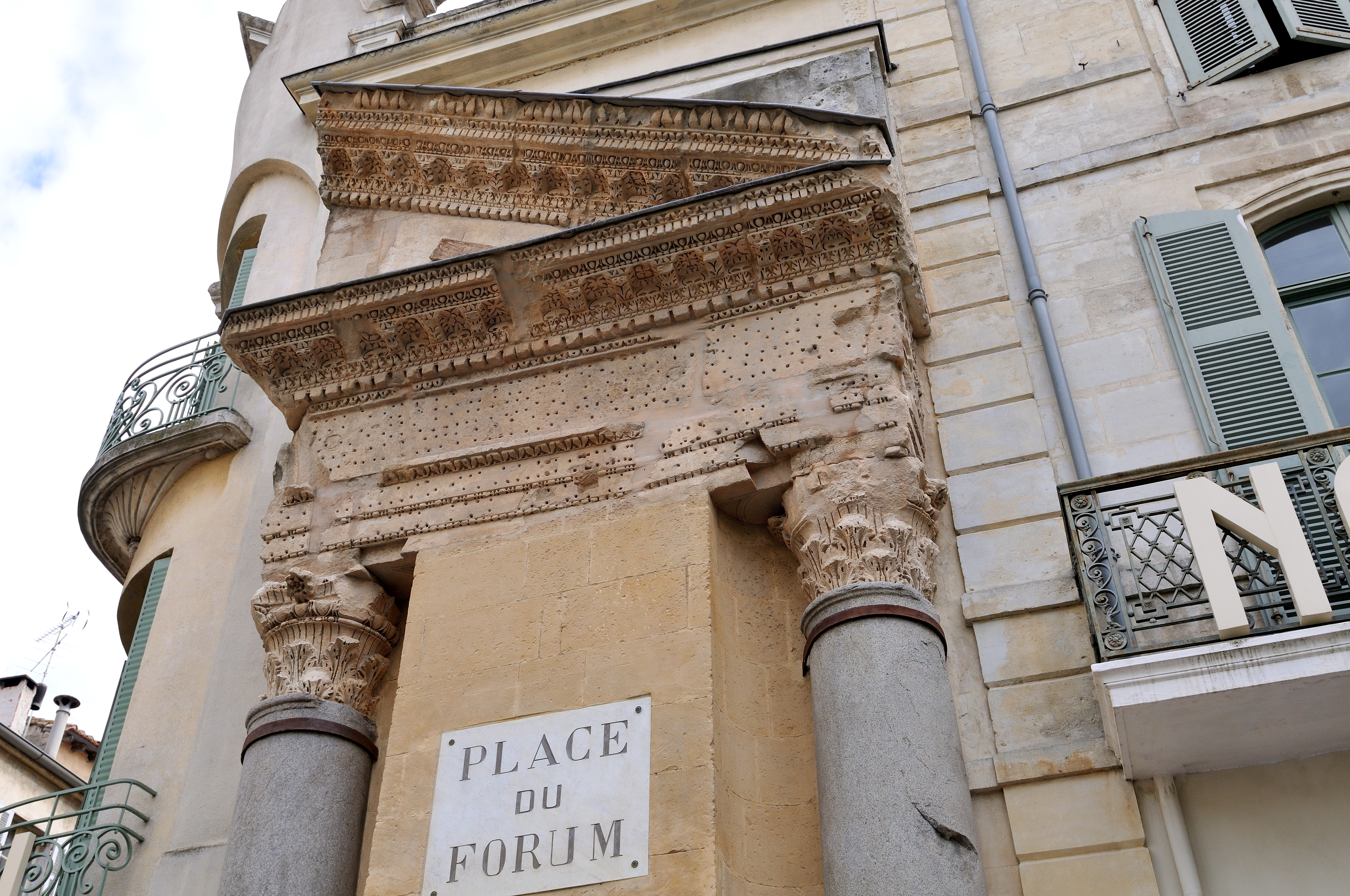 | 4世紀時代の屋根と二本の柱 (16:25) ノード・ピヌス・ホテル [Hôtel Nord Pinus] の左に隣接する古い三角の屋根と二本の柱は、4世紀時代のフォーラム (フォルム) [Forum] の遺構。 「南東」MAPLay. D |