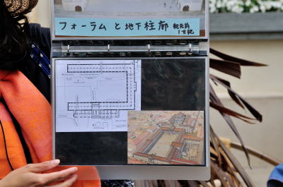 フォーラム (フォルム) [Forum] の模型 (16:26) ノード・ピヌス・ホテルの左に隣接する古い三角の屋根と二本の柱は、大きな回廊へ向かう入口の階段上にあった。 模型では、中央階段上の右手壁面に相当する。 嘗て、地面は掘り下がっていて、二層になっていた。 MAPLay. D |