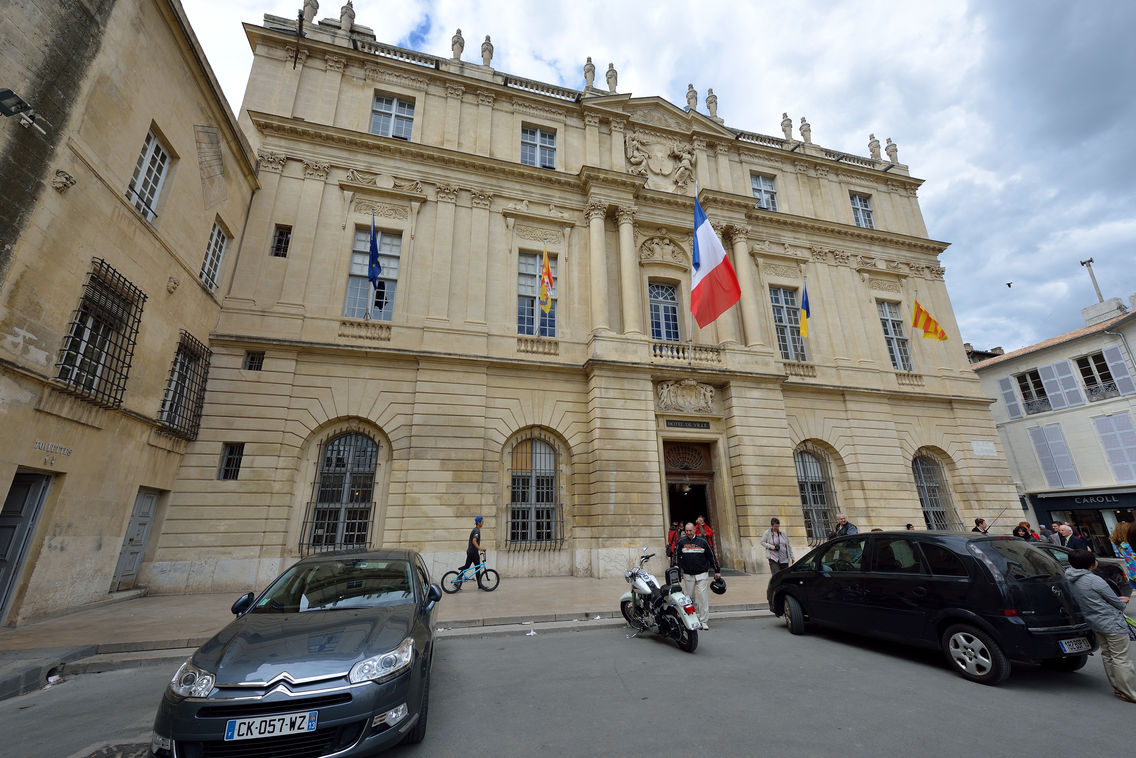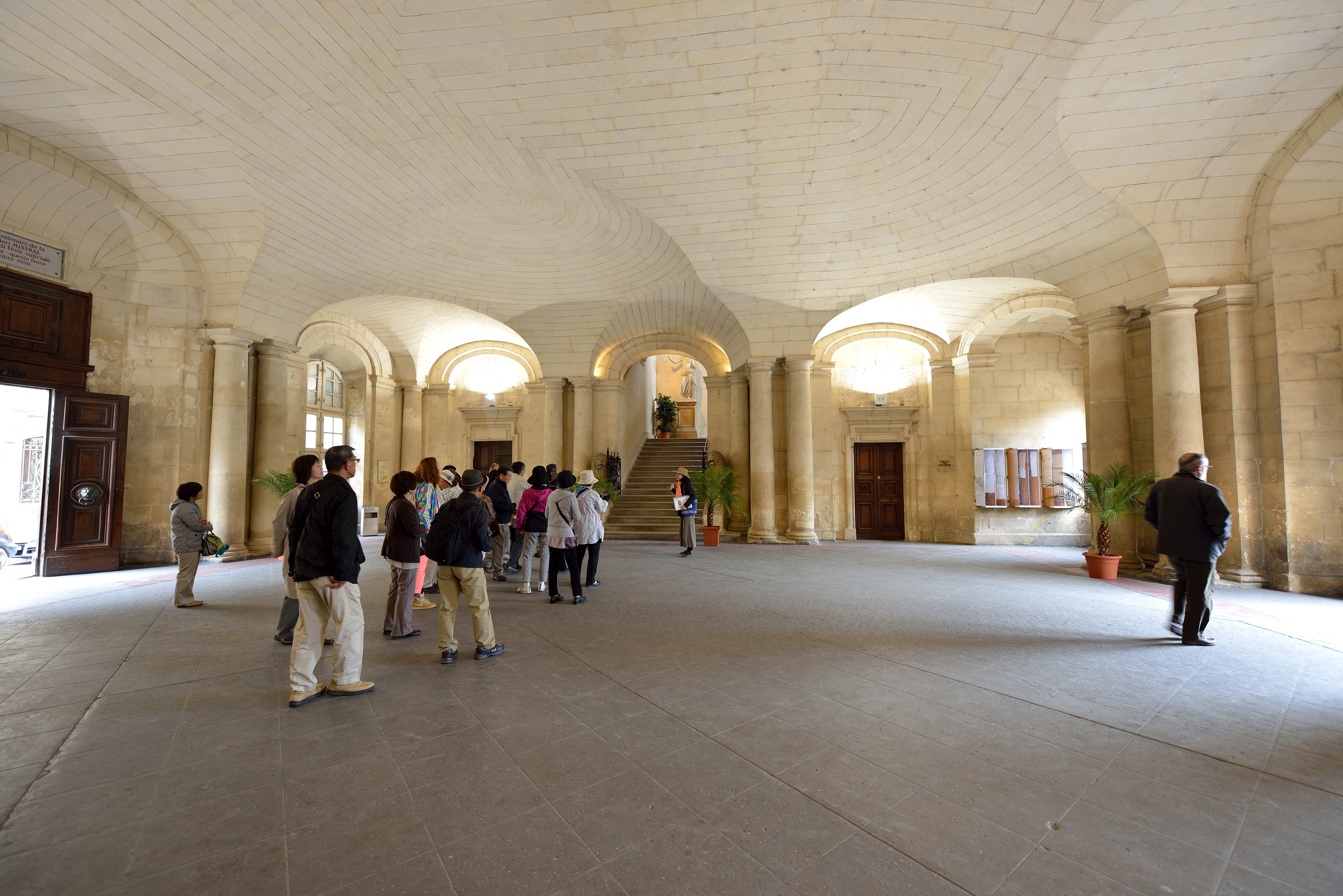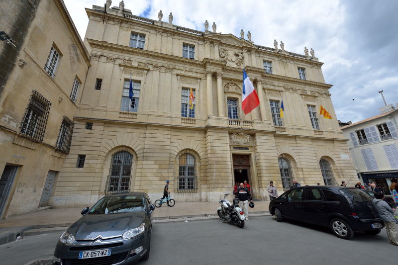 | アルルの市庁舎 [Mairie d'Arles] (16:30) 17世紀の建物で、 ヴェルサイユ宮殿の一部を設計した事で知られる、ジュール・アルドゥアン=マンサール [Jules Hardouin-Mansart] が設計している。 特に有名なのは、大きなホールで、ホールの真ん中には柱は無く、周囲の20本の柱で天井高を保っている。 天井の模様や曲線美などが高く評価されている。 因みに、このホールから世界遺産に登録されている フォーラム (フォルム) [Forum] の地下回廊に入ることが出来る。 「東」MAPLay. D |
