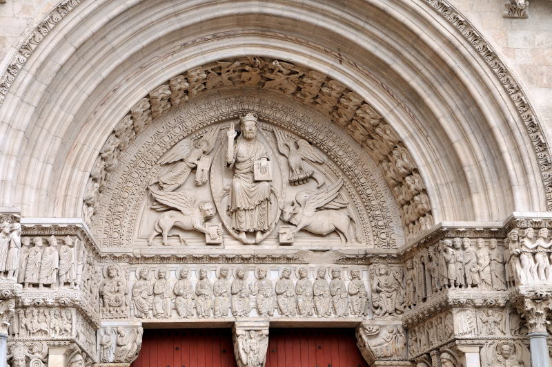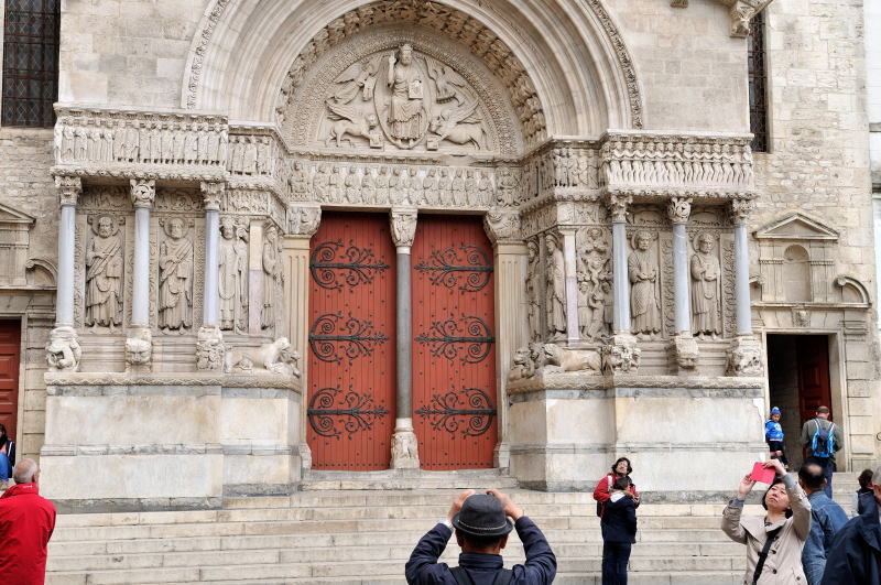 | サン・トロフィーム教会 [Église Saint-Trophime] (16:33) 入口上部の半円形部分 (タンパン) は、「最後の審判」 のキリストを描いている。 キリストは左手に福音書を持ち、その足下には、同じく福音書を持つ十二使徒が描かれている。 この十二使徒を境に、小さな人間達が帯状に連なっている部分は、天国と地獄を表しており、左側の列は、着物を纏った人々がキリストの方に向かって導かれる様子が描かれ、キリストに一番近い側面には、天使が描かれている。 この左側の列は、選ばれた者達の列で、天国を意味している。 それに対し、右側の列は、キリストに背を向け、腰は鎖につながれ、炎の中を歩いている様子が描かれている。 右側の列は、見捨てられた者達の列で、地獄を意味している。 当時、キリスト教徒達は文字の読み書きが出来なかったため、この様な彫刻や絵画などによってキリスト教を広めていった。 この教会の守護聖人トロフィームは、この地方に初めてキリスト教を広めた人で、下段に並ぶ聖人像の内、左から3番目の左手に杖を持った聖人像がトロフィーム。 守護聖人トロフィームは、3世紀にキリスト教をアルルに伝えた人物で、この町の初代司教であった。 「東」MAPLay. D |