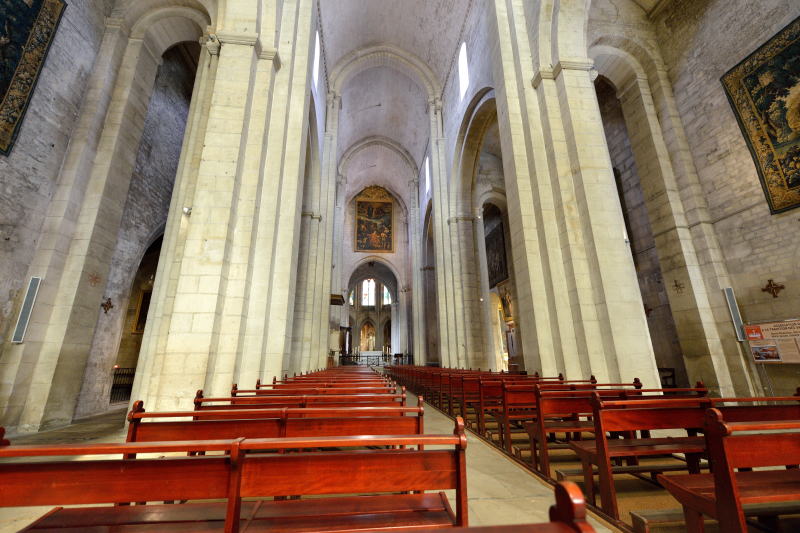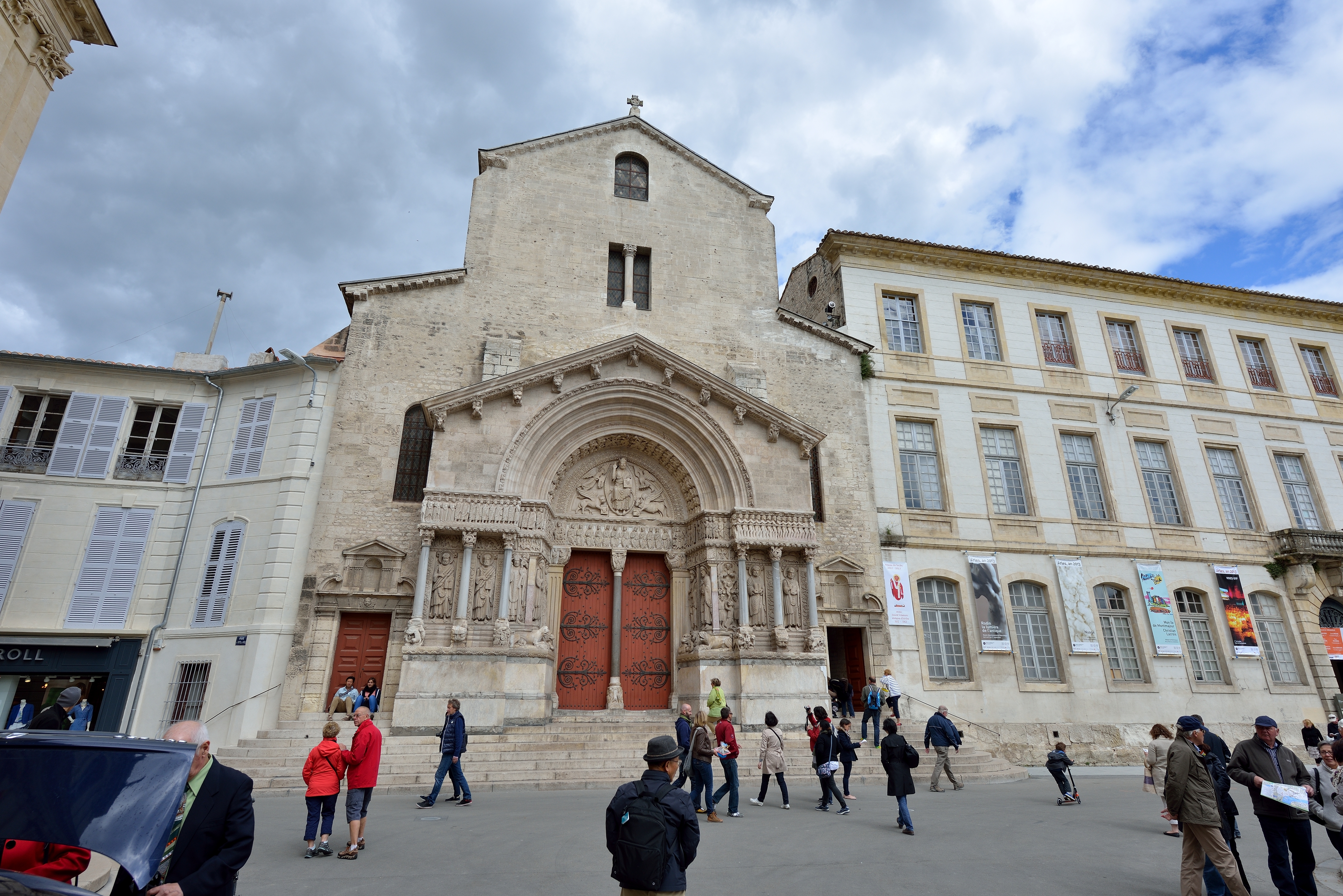 | サン・トロフィーム教会 [Église Saint-Trophime] (16:38) 2種類の建築様式で建てられている教会で、祭壇から奥が、ゴシック様式、祭壇から手前がロマネスク様式で建てられている。 ロマネスク建築は、太い柱と分厚い壁によって天井高が保たれているのが特徴。 ゴシック様式ではステンドグラスが嵌められるようになる。 ゴシック様式が南仏に伝わったのは15世紀頃であるので、祭壇から奥の部分は15世紀以後に後付けされた部分になる。 「東」MAPLay. D |