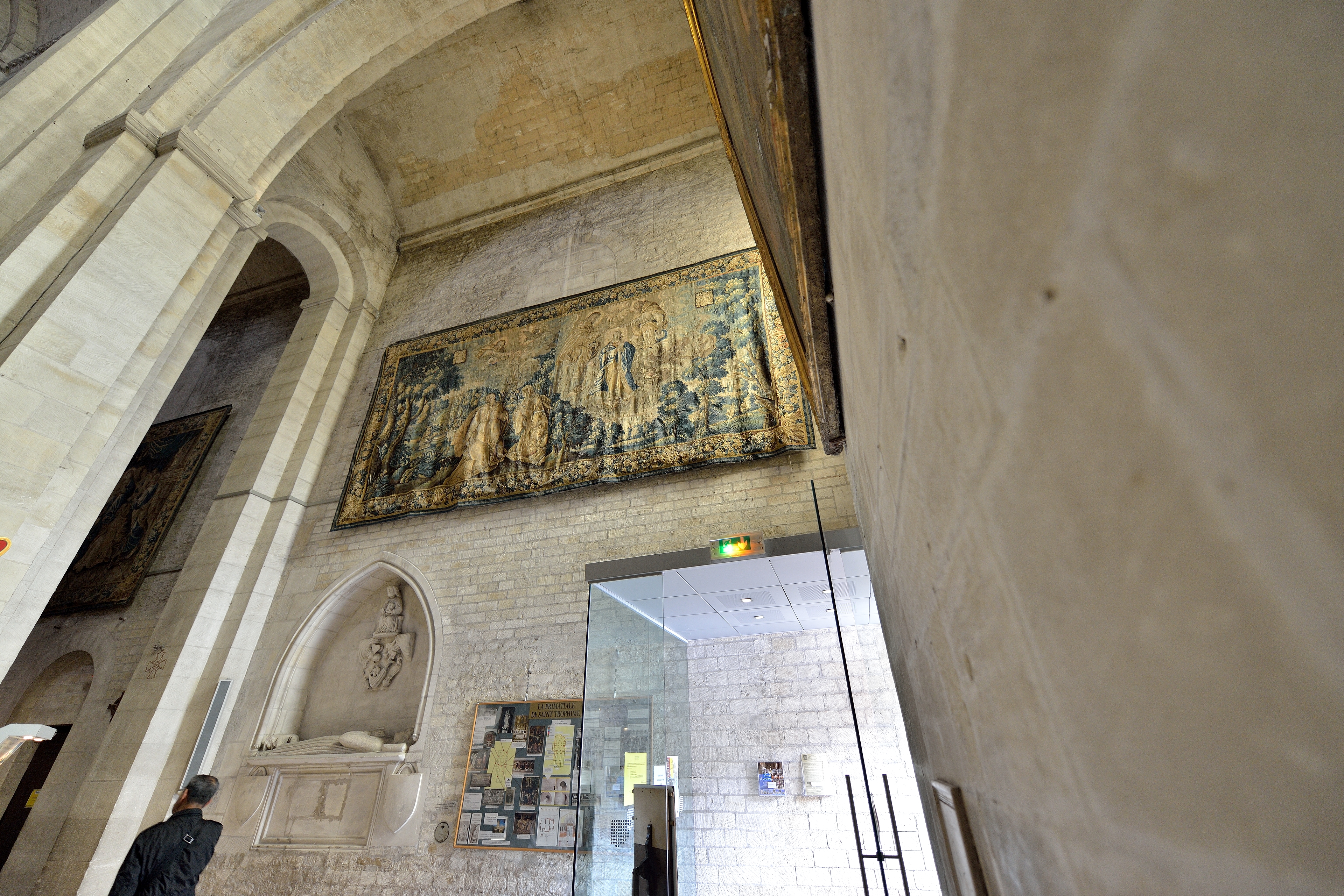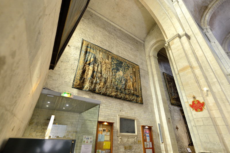 | 壁に掛けられたタペストリー (16:38) 教会の壁には、17世紀に織られた8枚のタペストリーが掛けられている。 このタペストリーには聖母マリアの生涯が描かれている。 MAPLay. D |