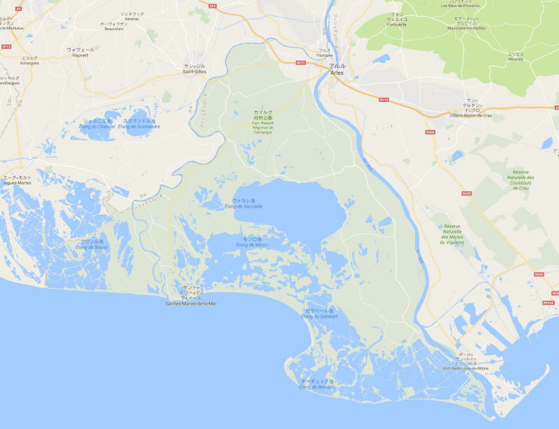 | カマルグ地方の湿地帯 二つの川と地中海に囲まれた三角州地帯は カマルグ [Camargue] と呼ばれる湿地帯になっており、ここでは昔から野生の白馬が棲息しており、今はガーディアン達 [Guardians] に守られながら、闘牛で活躍する牛や馬が放牧されている。 また、多くの野鳥が棲息し、中でもフラミンゴは有名で、一年中見ることが出来る。 秋の米収穫祭 [Fete du Riz] は、この地での、米の収穫を祝ったお祭りで、フランスでは珍しい稲作地帯にもなっている。 カマルグの東端の街 "サラン・ド・ジロー" [Salin-de-Giraud] (MAP) では、18世紀頃から塩田による製塩産業が営まれ、現在に至っている。 ここで採れるカマルグの塩は、 フルール・ド・セル [fleur de sel] (塩の花) と呼ばれ、世界的に有名。 この塩は、地中海の水を塩田に引き、はじめに水面に現れた結晶のみを手作業で採塩し、それを更に天日に干した物で、マグネシウム、カルシウム、カリウムなど、塩化ナトリウム以外のミネラル成分を多く含むため、豊かな風味がある。 そのため、高級なフランス料理やイタリア料理には欠かせない調味料として使用される。 (画像出典:Google map) |
