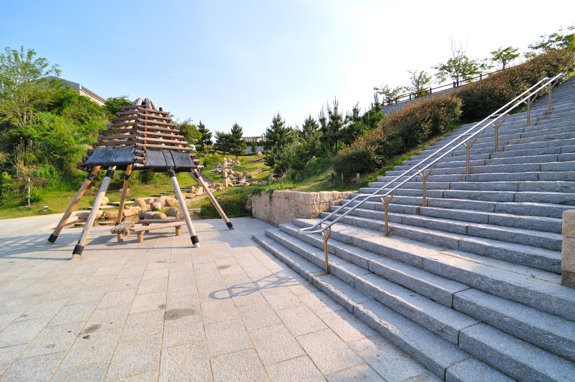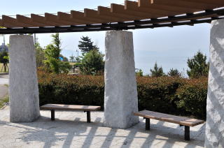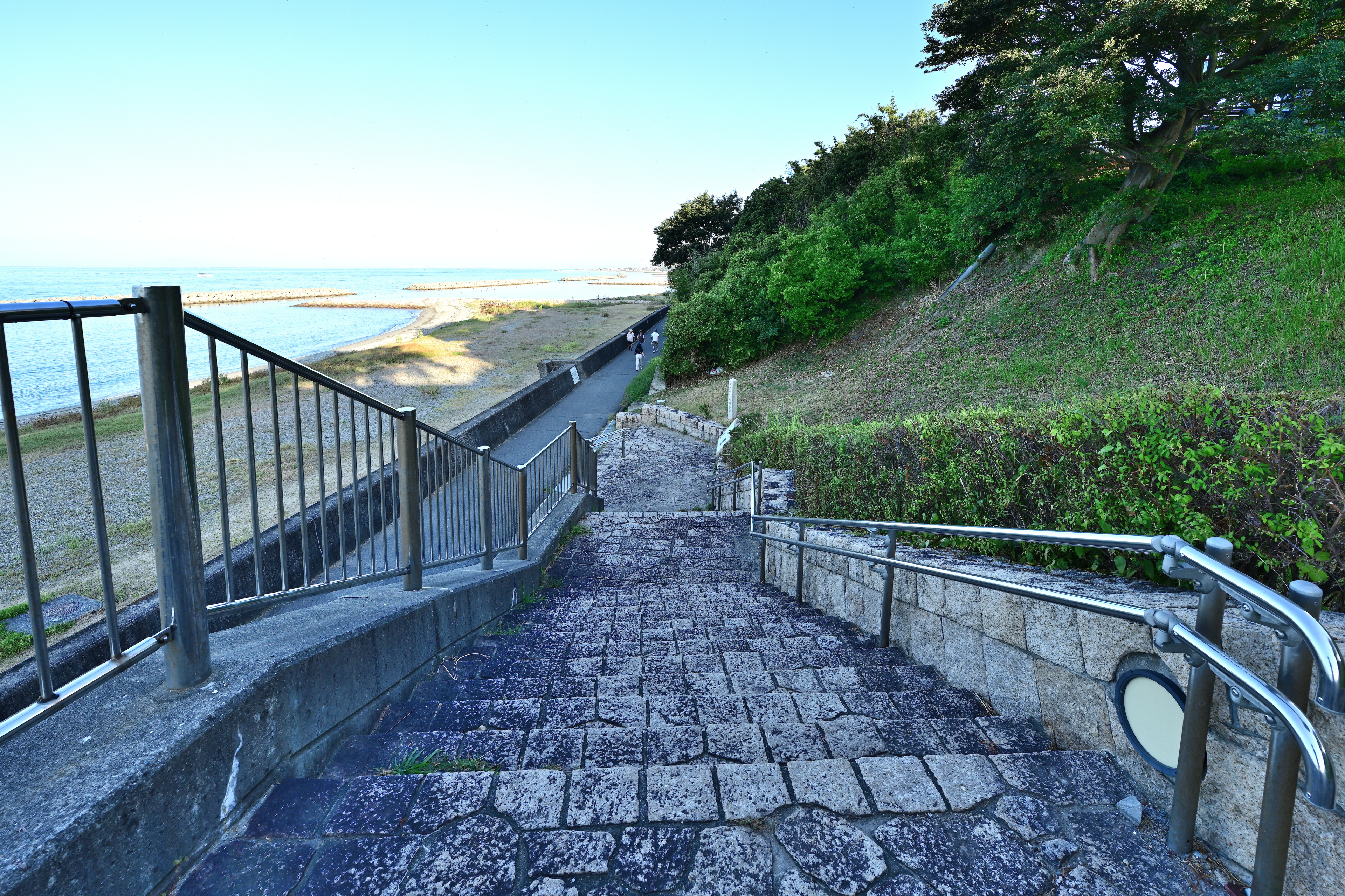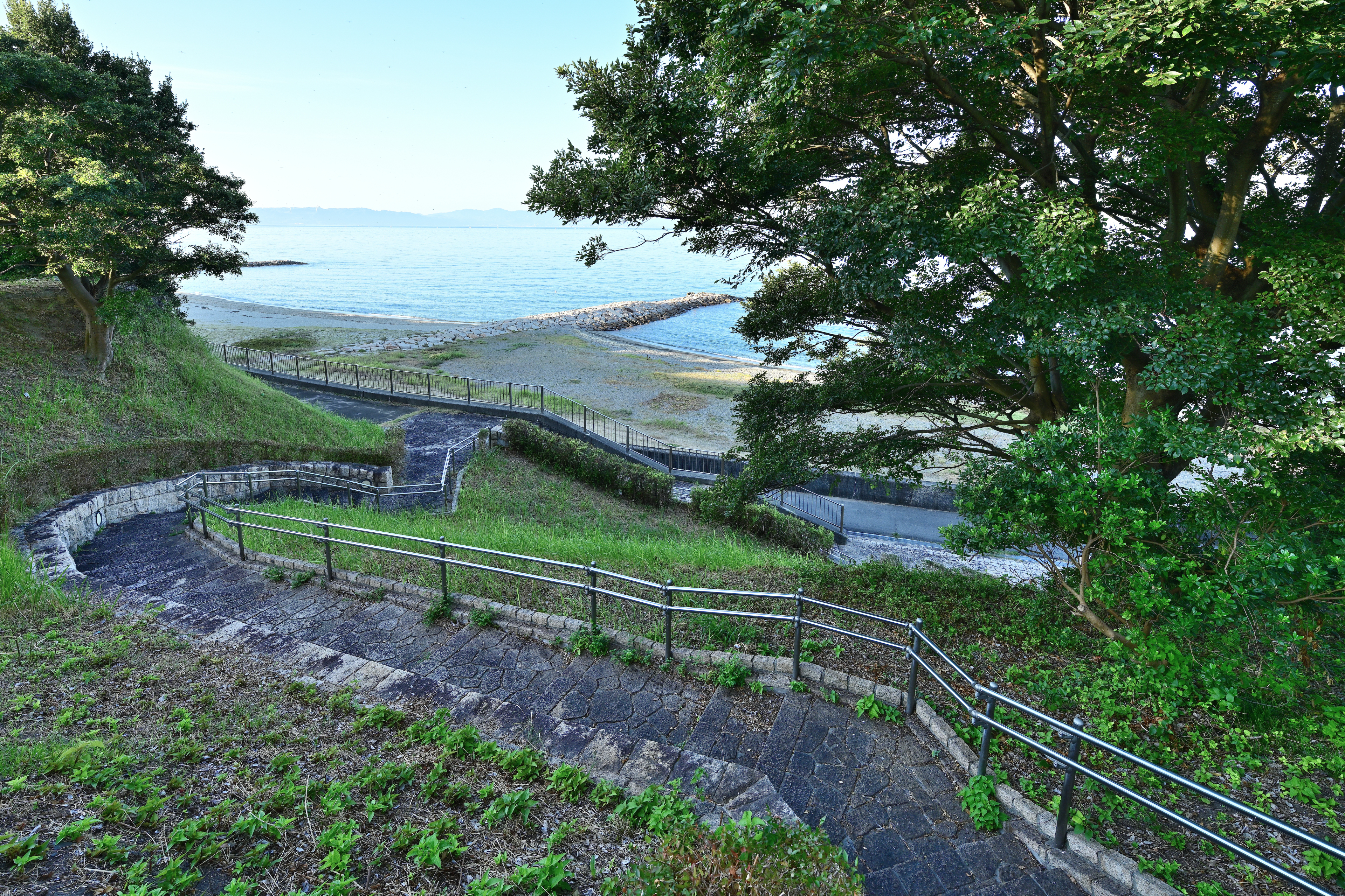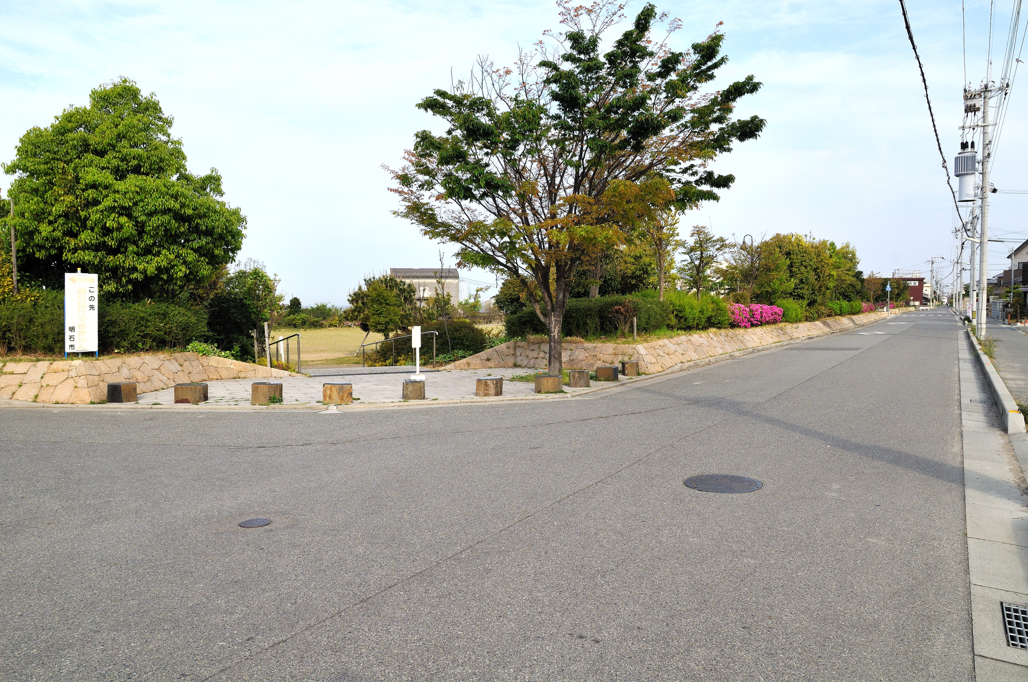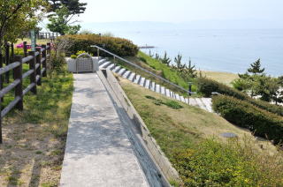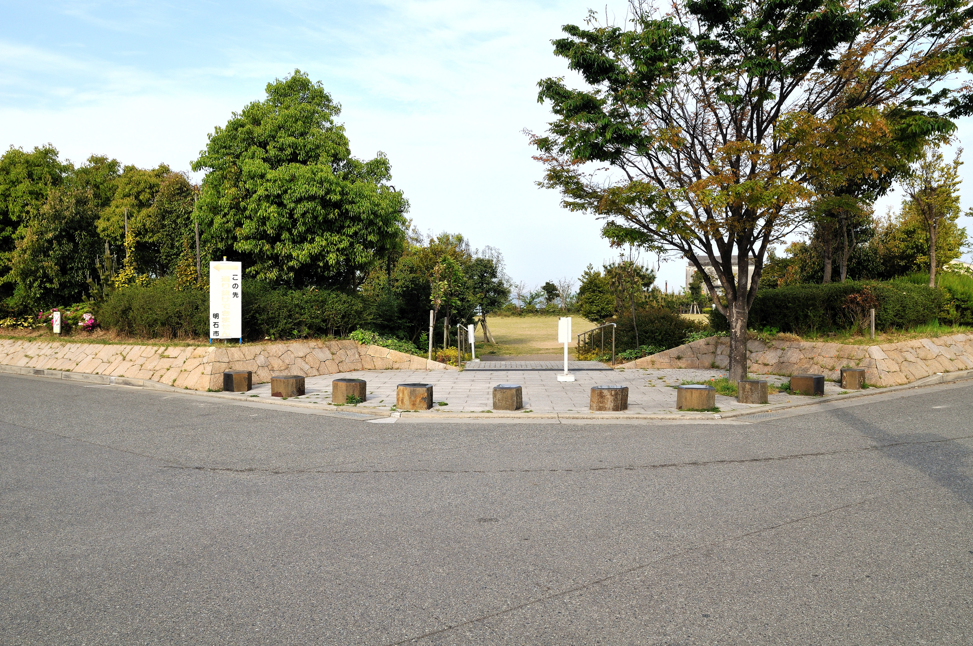 | 右手の階段を下りると、 屏風ヶ浦、明石象化石発掘地に通じている。 撮影方向 (南) MAP f |