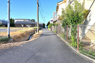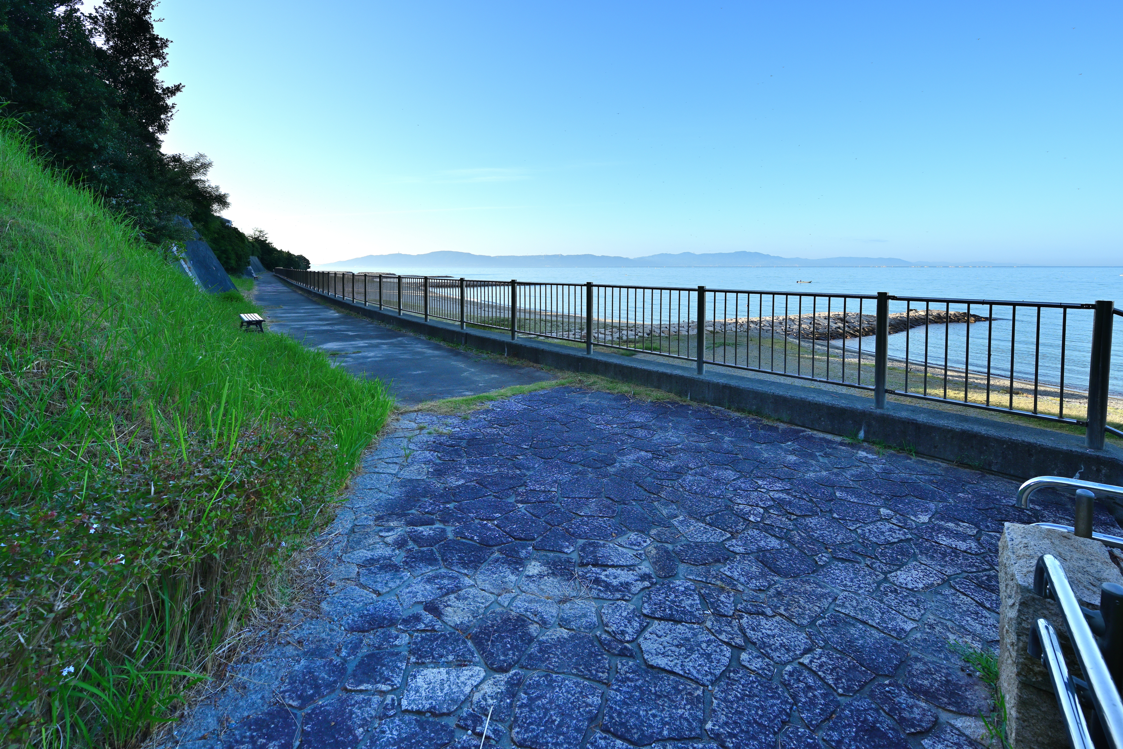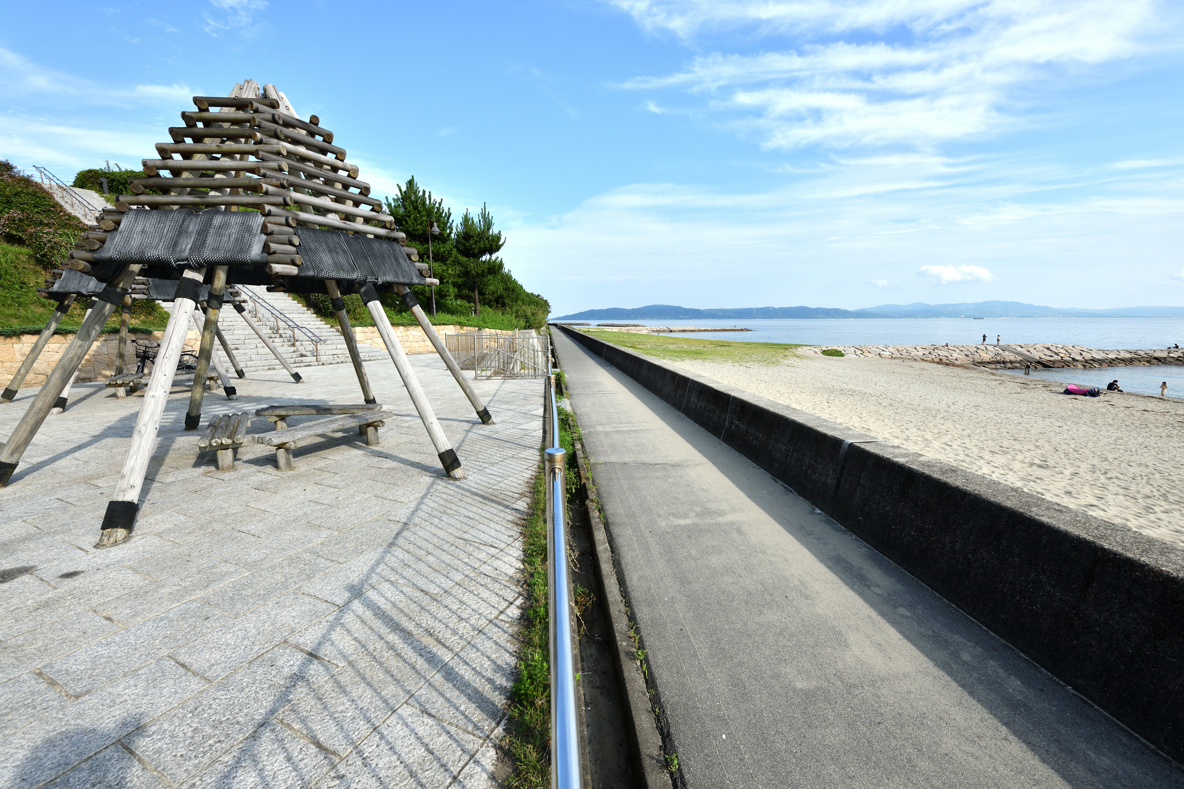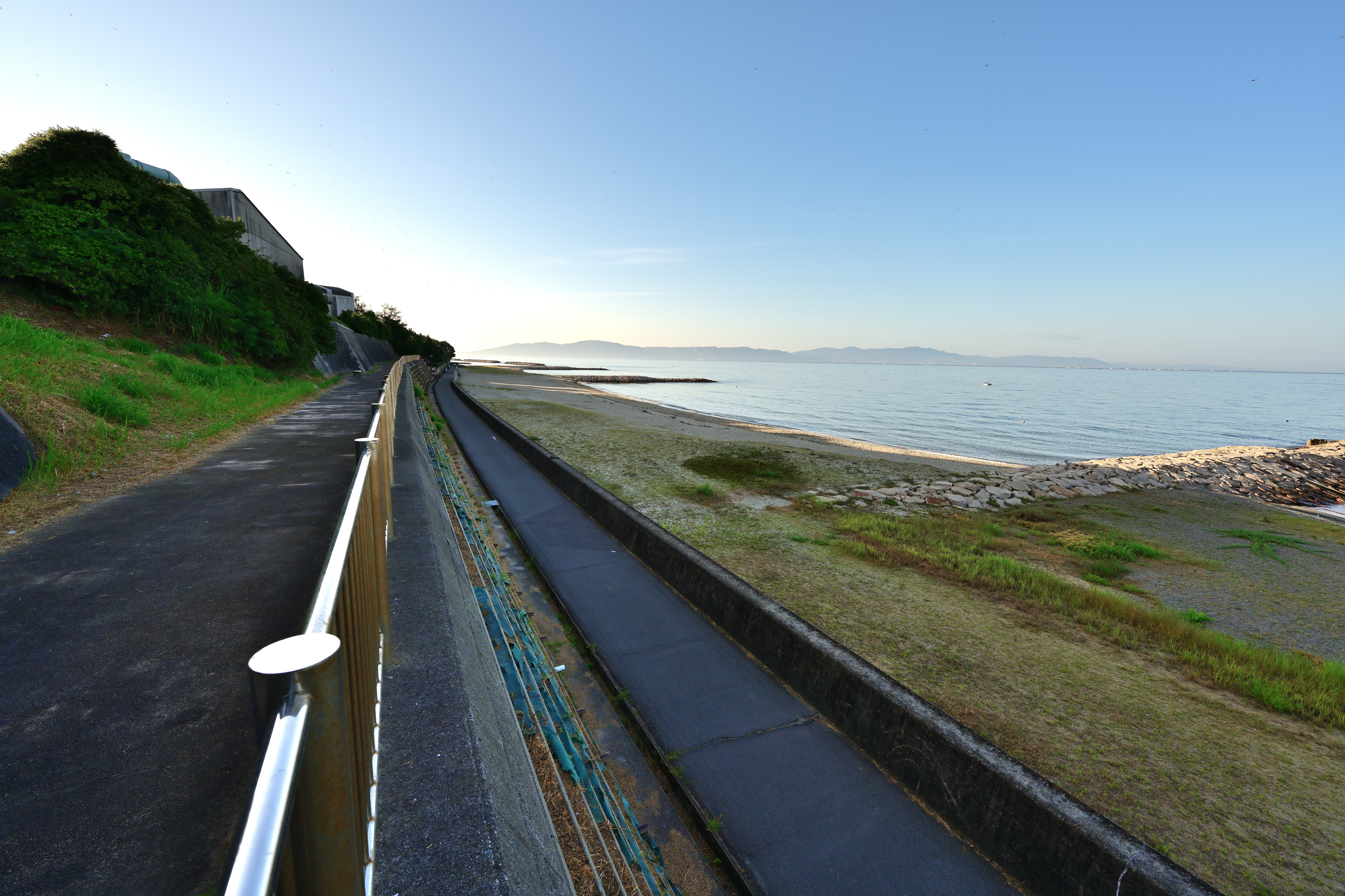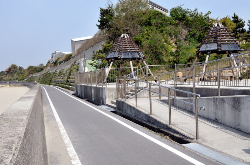 上段の歩道から南東方向を望む この道を南東に100m歩けば、八木遺跡公園に至る。 下段の道は、浜の散歩道 (播磨サイクリングロード) で 同じく、八木遺跡公園に至る。 撮影方向 (南東) MAP j |