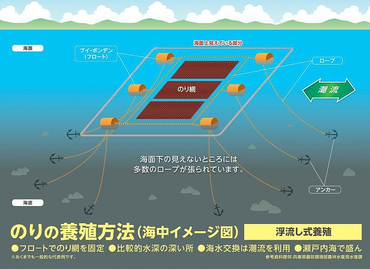 | 八木海岸の沖合で行われている、"海のり" の浮流し式養殖 晩秋から春にかけて、海中で海苔を付着、成長させるため、タネ付した網ヒビ (海苔網) を海面近くに沈め、海苔が10cmほどに生長したら、いよいよ海苔摘みの作業が始まる。 現在では海苔摘みと言った感じではなく、船 (もぐり船) に装備された横に長いブレードを回転させて、ヒビの下から海苔を削ぎ落とすように収穫している。 船も現在では、船首側と船尾側にスラスターが取り付けられており、船体は前進 (後退) 中でなく、舵が効かない状態でも、その位置で方向を変える事が出来る。 YouTubeへリンク 明石の浮き流し式海苔養殖 (あまり知られていない海上作業) |