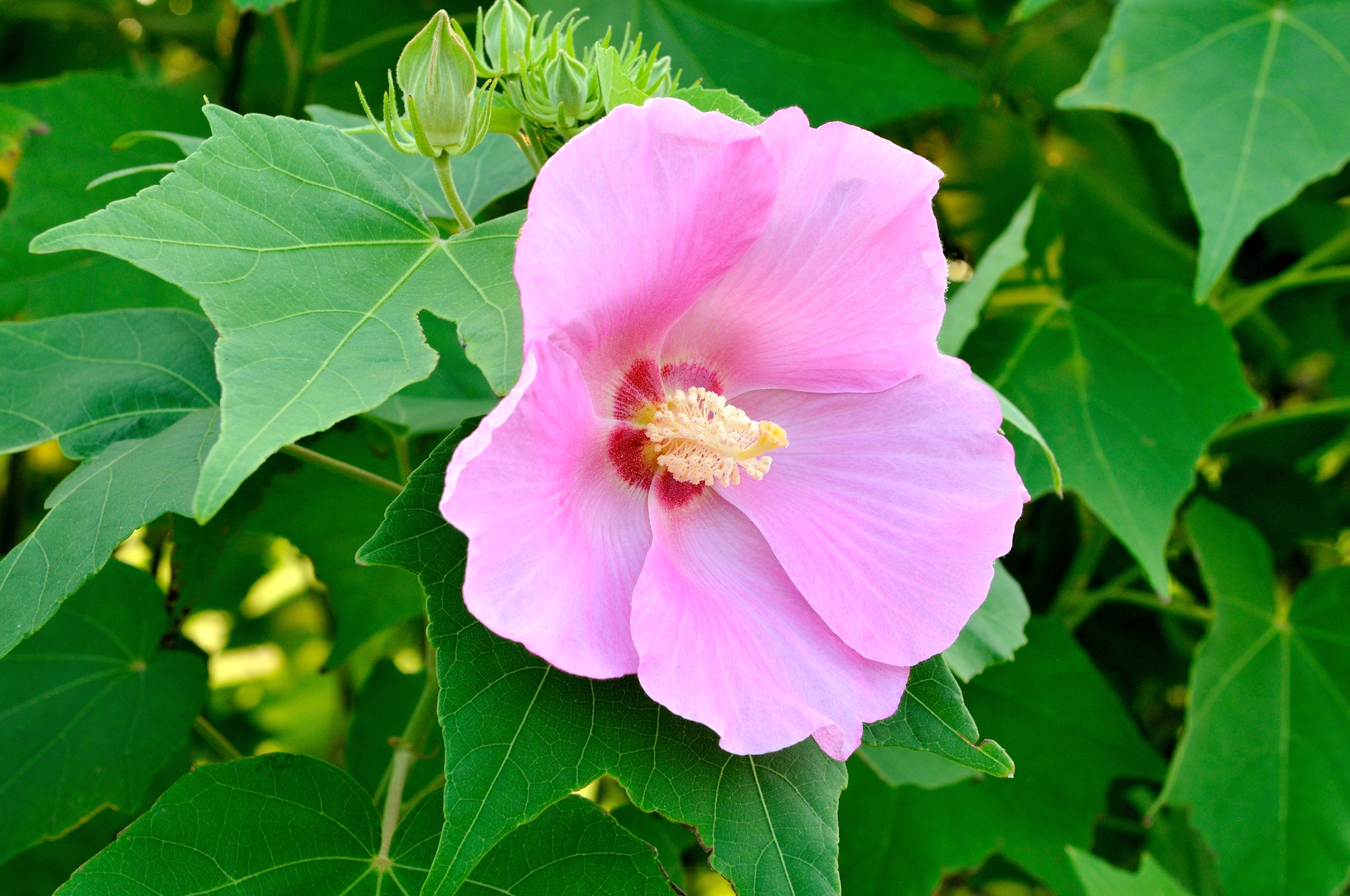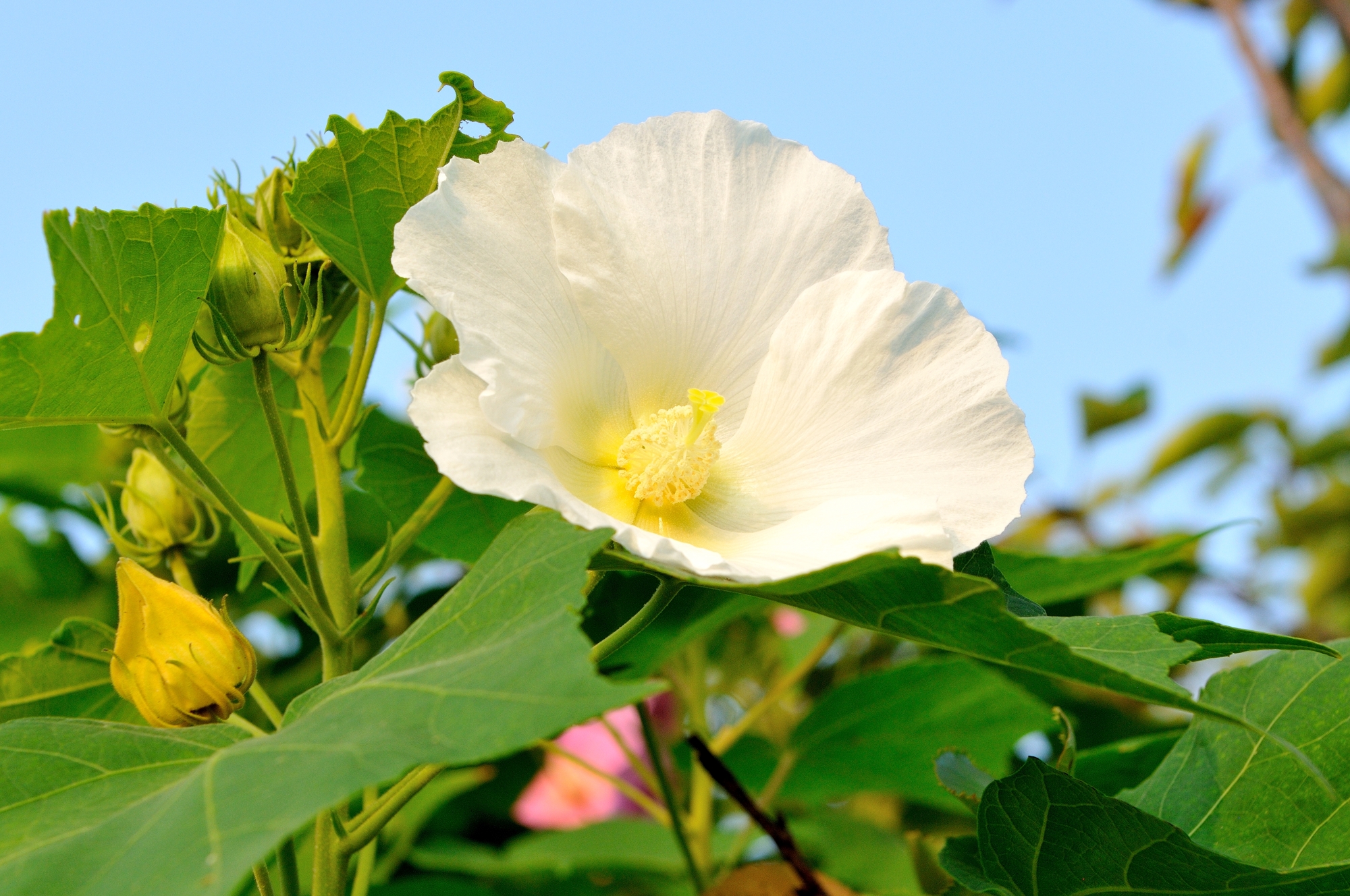 | 遺跡公園内に咲いている芙蓉の花(9月中旬) MAP a 朝に咲き、夕方には萎んでしまうことから、一日花とも呼ばれている。 |