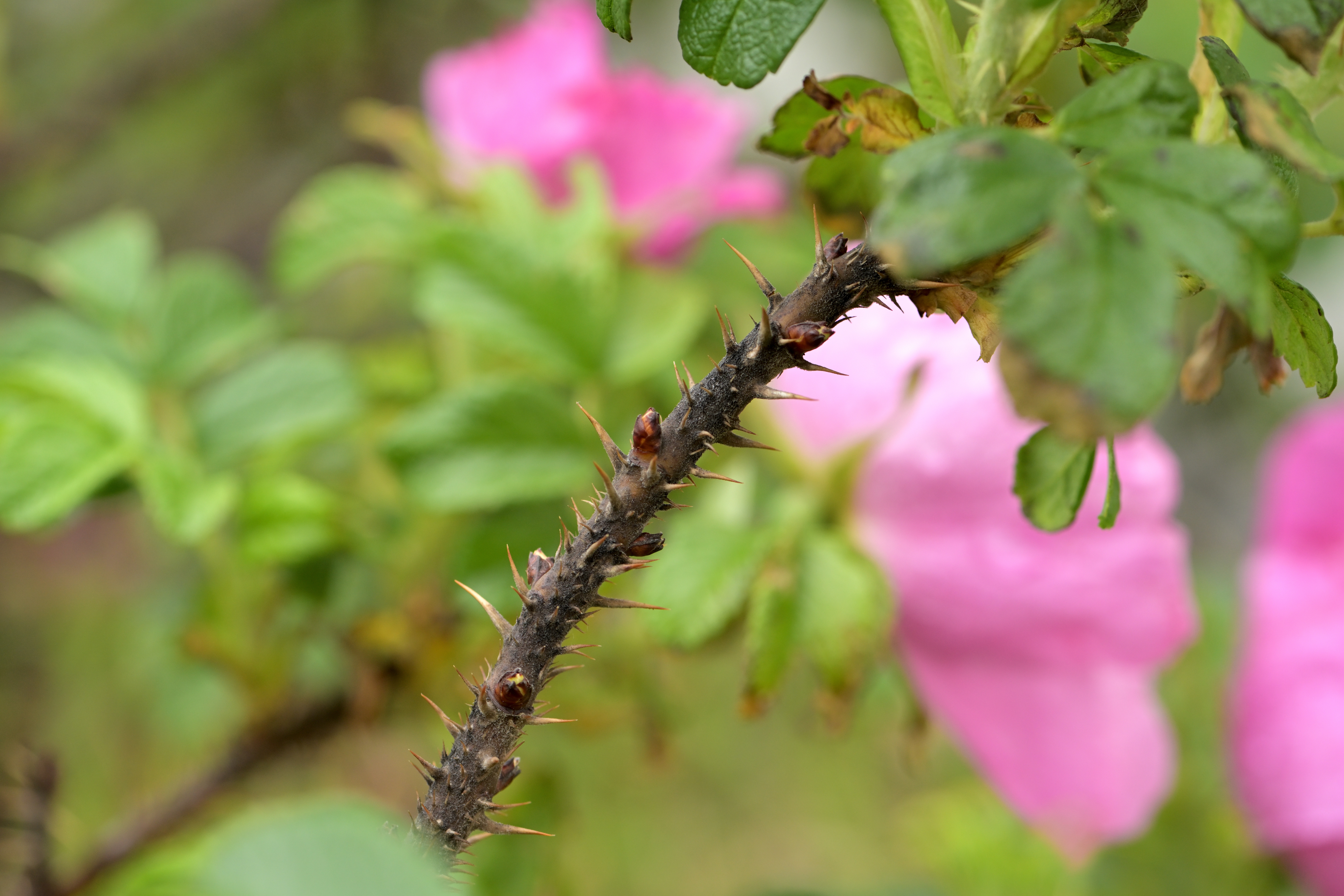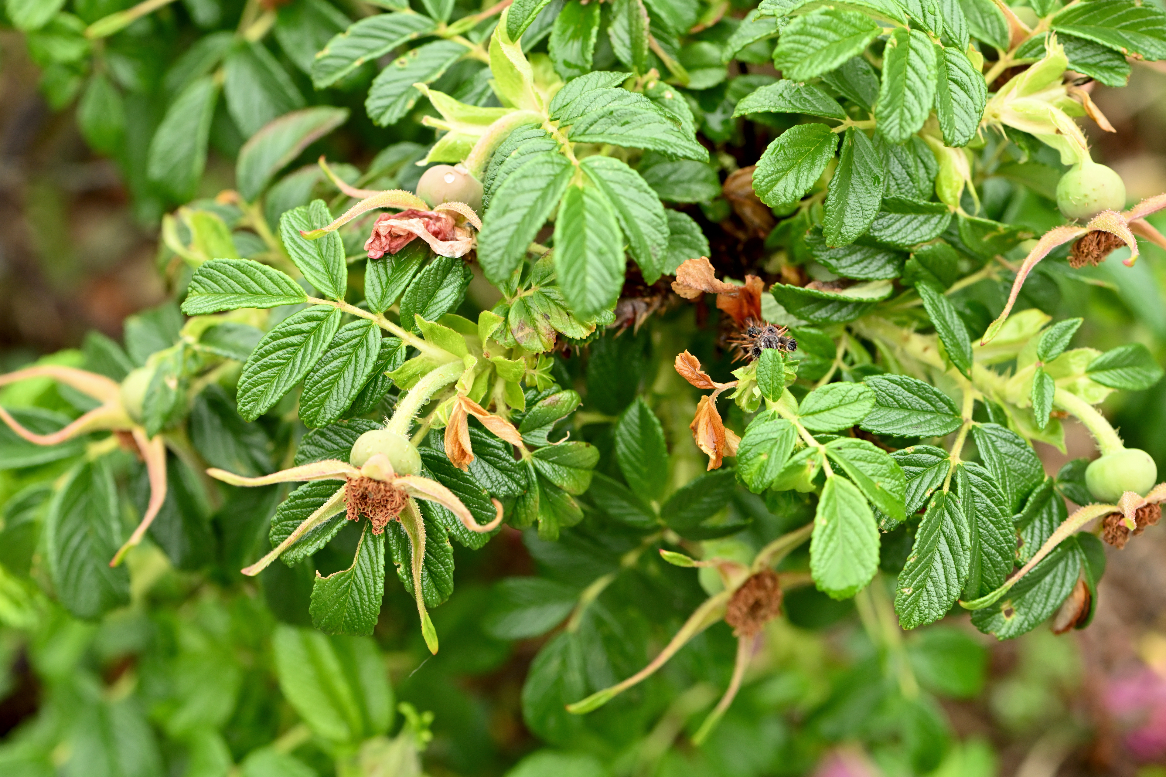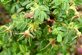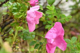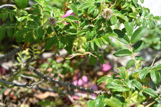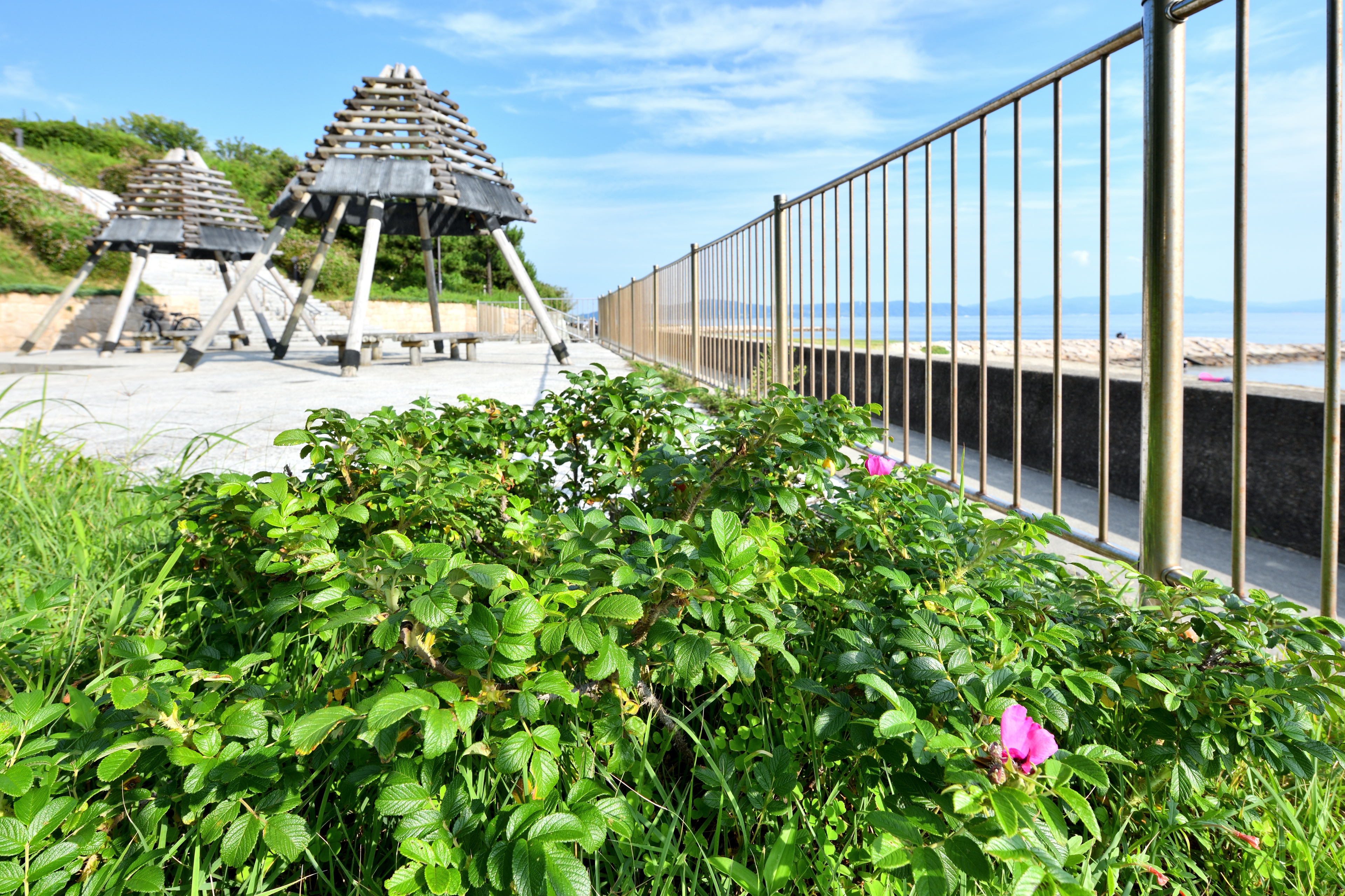 | 遺跡公園内に咲いているハマナス(4月、7月中旬) MAP b 和名ハマナスの語源は、浜(海岸の砂地)に生え、熟した果実が甘酸っぱいので、ナシに例えて「ハマナシ(浜梨)」という名が付けられ、それが転訛したとする牧野富太郎が唱えた説が通説になっている。 出典:Wikipedia <ハマナスは、防犯カメラ設置のため、残念ながら2021年頃?に撤去されています。> ハマナスと聞けば、 あの "知床旅情" の歌詞を思い浮かべる方も多いのでは? |