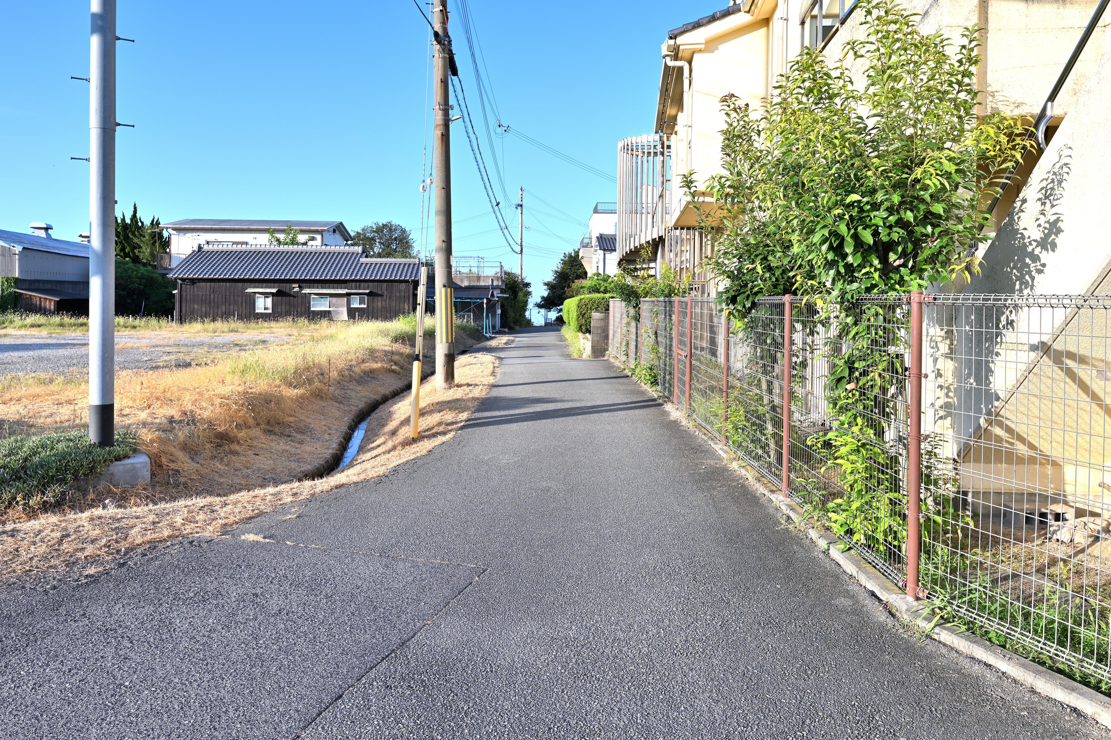 この道の突き当たりに、屏風ヶ浦海岸への 下り階段がある。 撮影方向 (南南西) MAP e |
