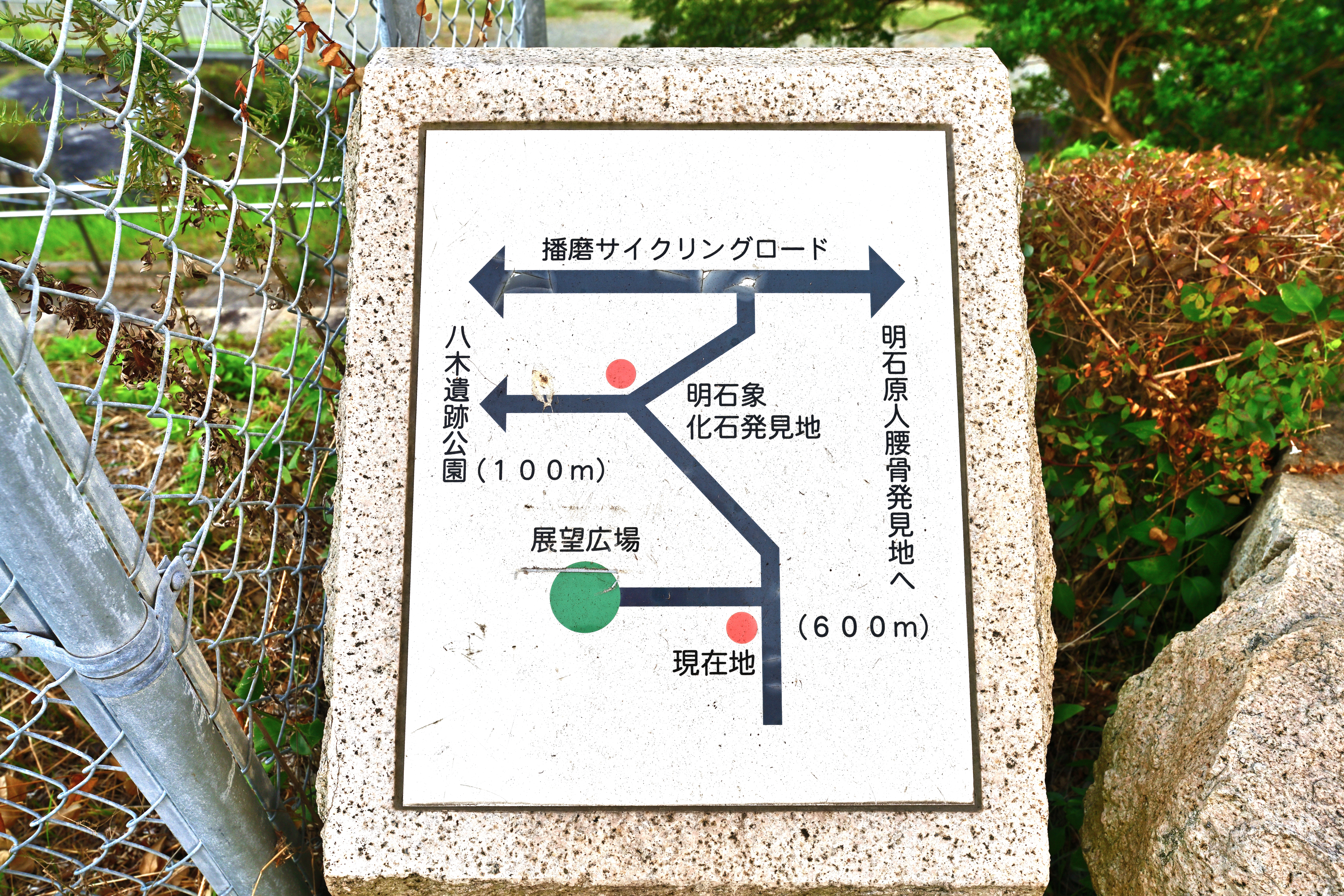 播磨サイクリングロード、八木遺跡公園、 明石象化石発掘地、及び明石原人腰骨 発見地 (600m) への案内図。 撮影方向 (南) MAP f |