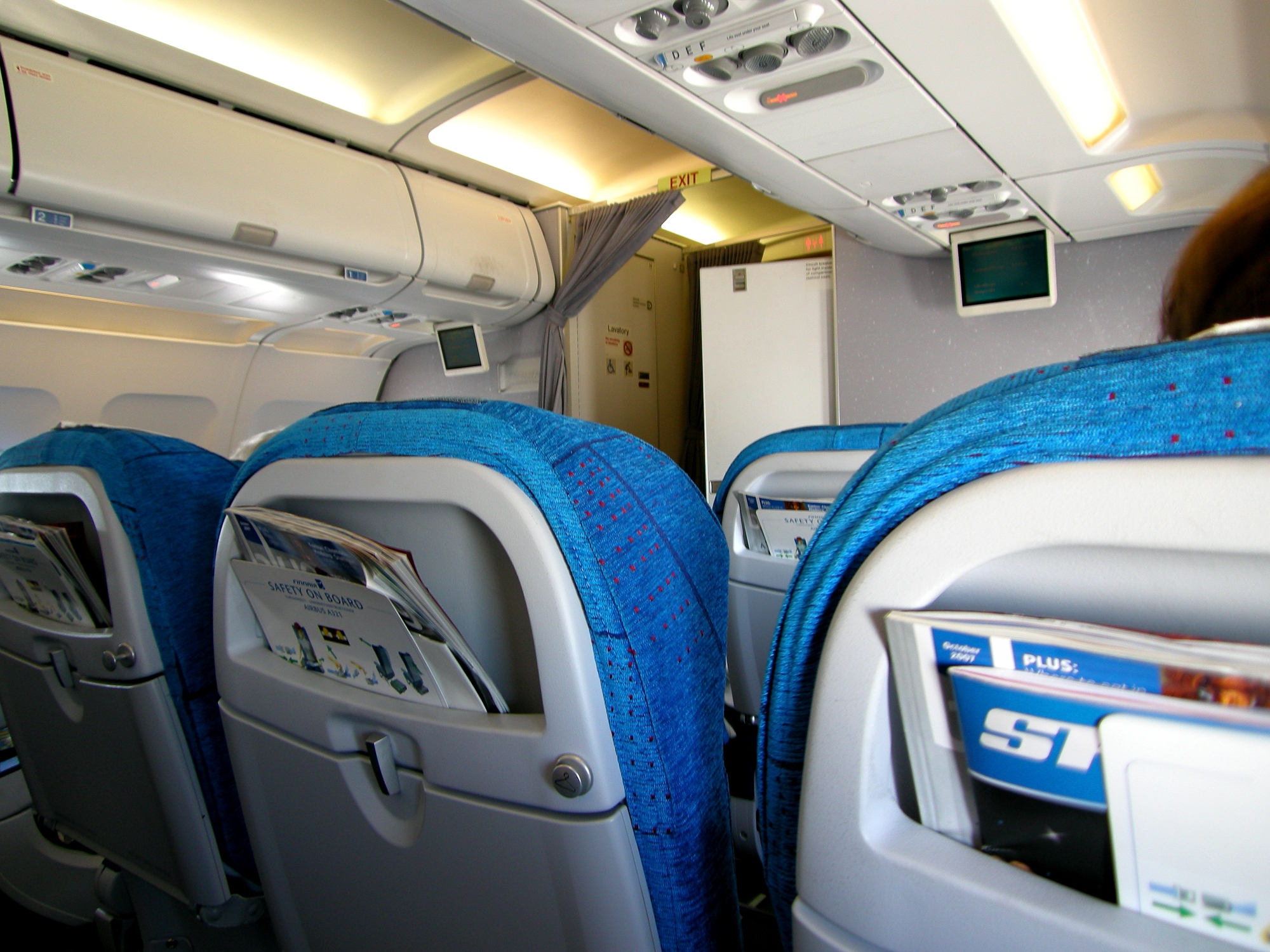 | Finnairのビジネス・キャビン (12:42) 突然のストのためエコノミー席に空きがなく、ビジネスクラス席があてがわれた。 |