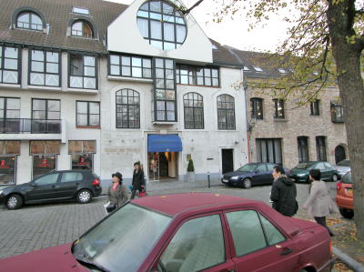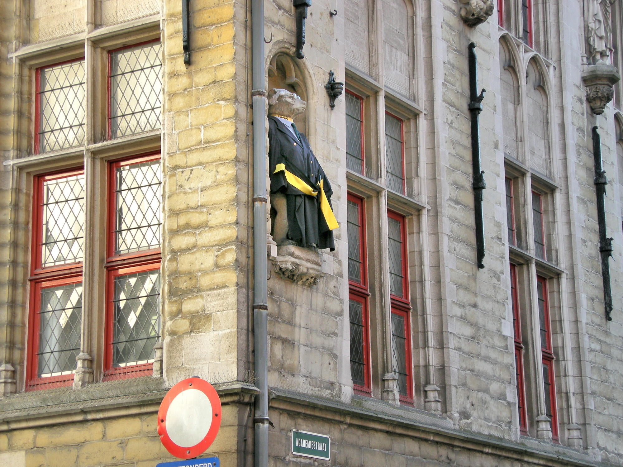 | アカデミー通り [Academiestraat] にある "ポータロス・ロッジ" [De Poortersloge](09:18) 15世紀の頃、多くの富裕層は、Poortersloge を互いの交流の場として、会議や娯楽のために使用していた。 その後ブルージュ騎士道馬上槍協会「ホワイトベア」がこの施設を使用するようになって、ホワイトベアのメンバーだった ボールドウィンの英雄的行為*に因み、この建物のニッチ [Nichi]にマスコットとして熊が置かれるようになった。 * 『フランダース伯ボールドウィン一世が、カロリング朝西フランク王国の初代国王シャルル二世の娘ジュディスをフランスの修道院から誘拐したため、国王シャルル二世はボールドウィンを罰するため、フランダースの僻地へ彼を追放した。 この辺りには住民をほとほと困らせてきた熊がいたが、勇猛を誇る”鉄の腕の”ボールドウィンはついにこの熊を倒した。 住民はボールドウィンをたたえ、熊を剥製にして贈った。』 「南西」MAP Lay.1E |