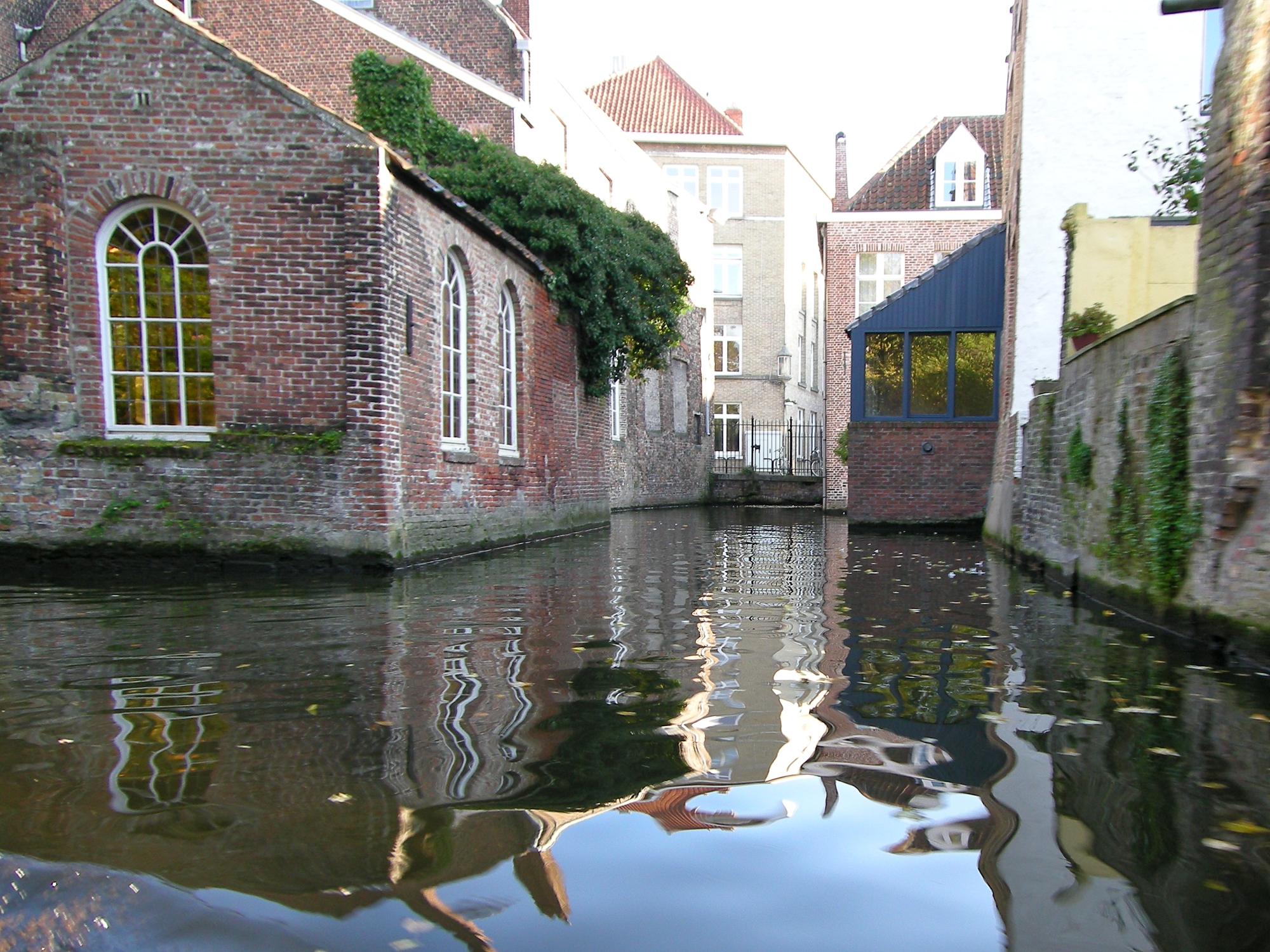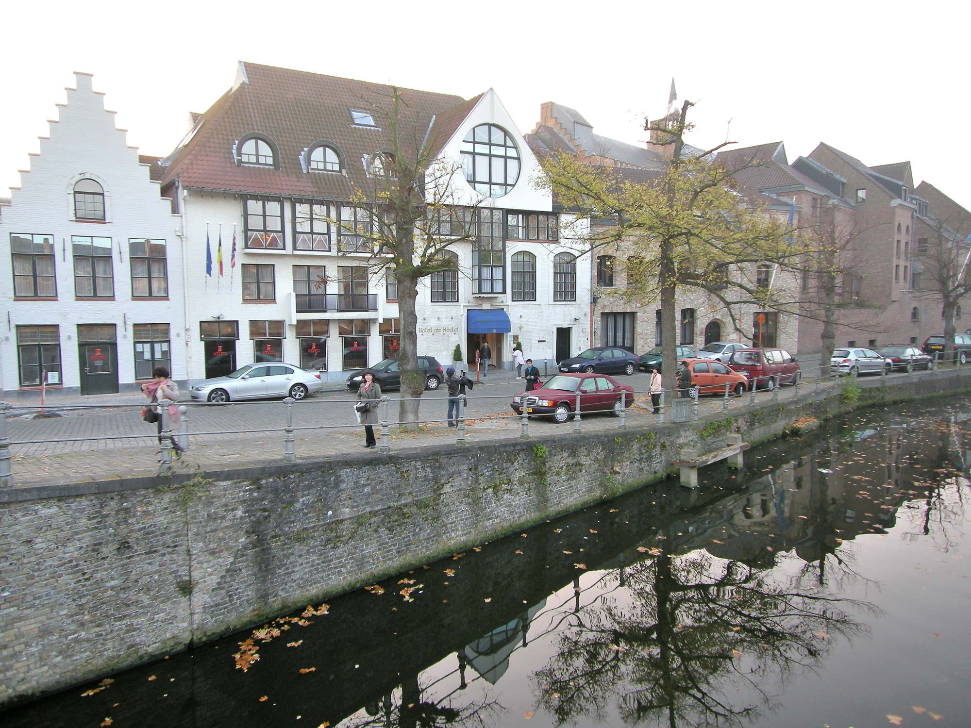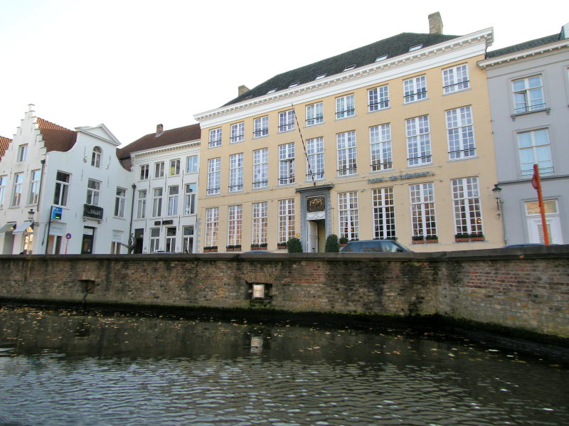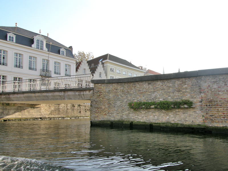 | 運河 "Dijver" をクルーズ(10:46) 中央の白い建物 (屋根は黒) は欧州大学院大学 [Collège d'Europe] 。 欧州大学院大学は、ヨーロッパ研究の独立大学院機関で、ヨーロッパに関する研究・教育機関として世界で最も歴史を持つものとなっている。 「東」MAP Lay.1t |