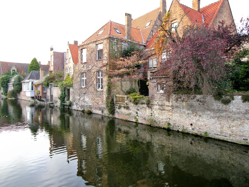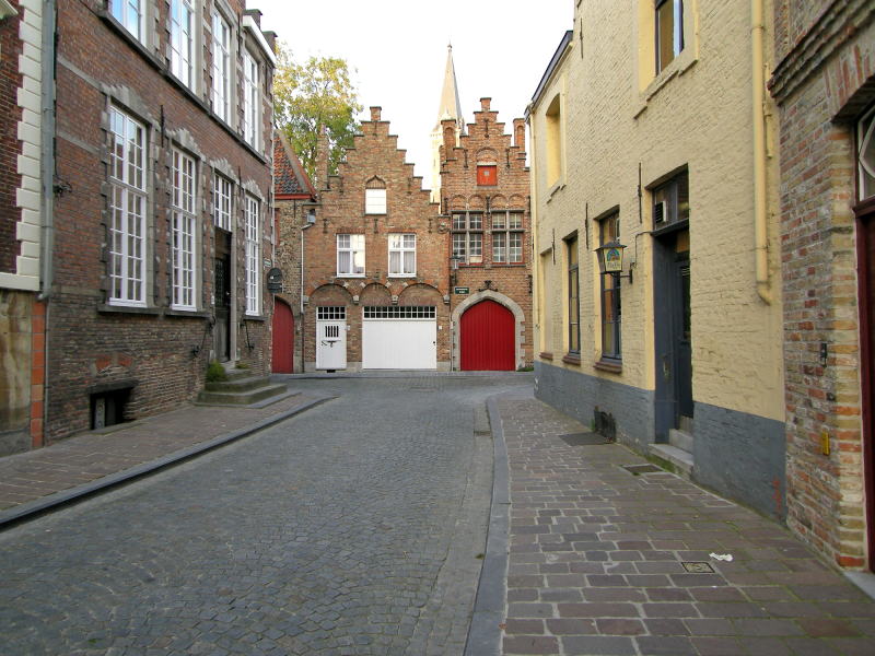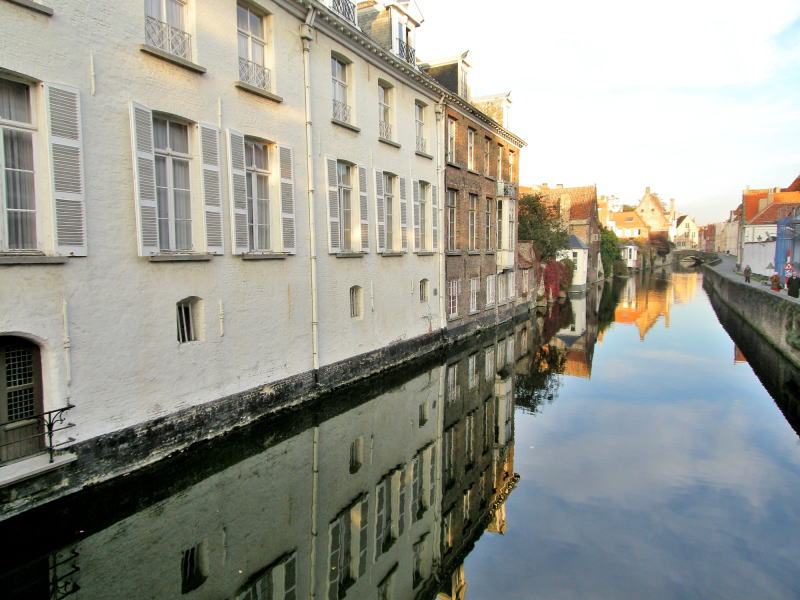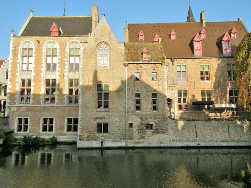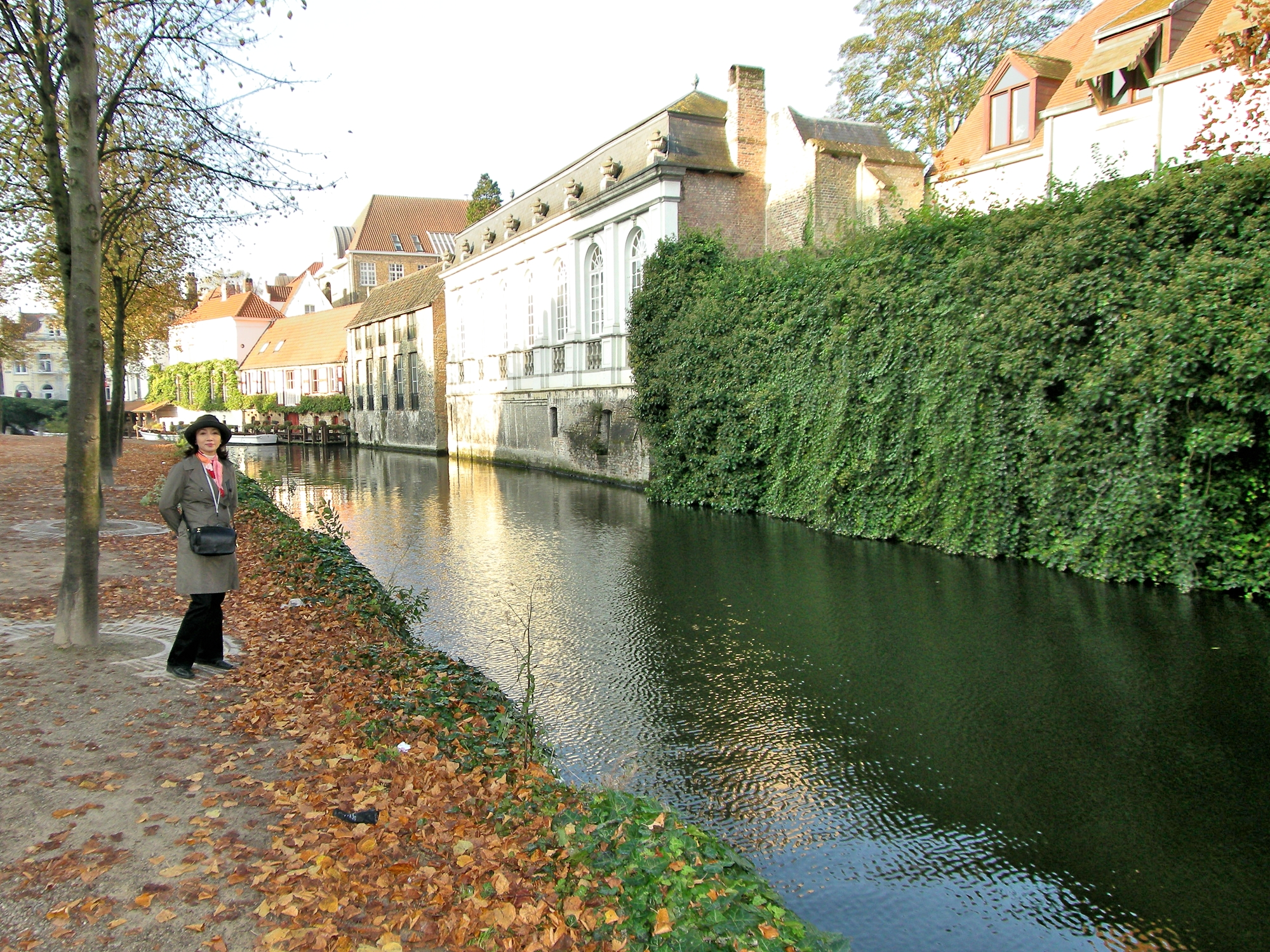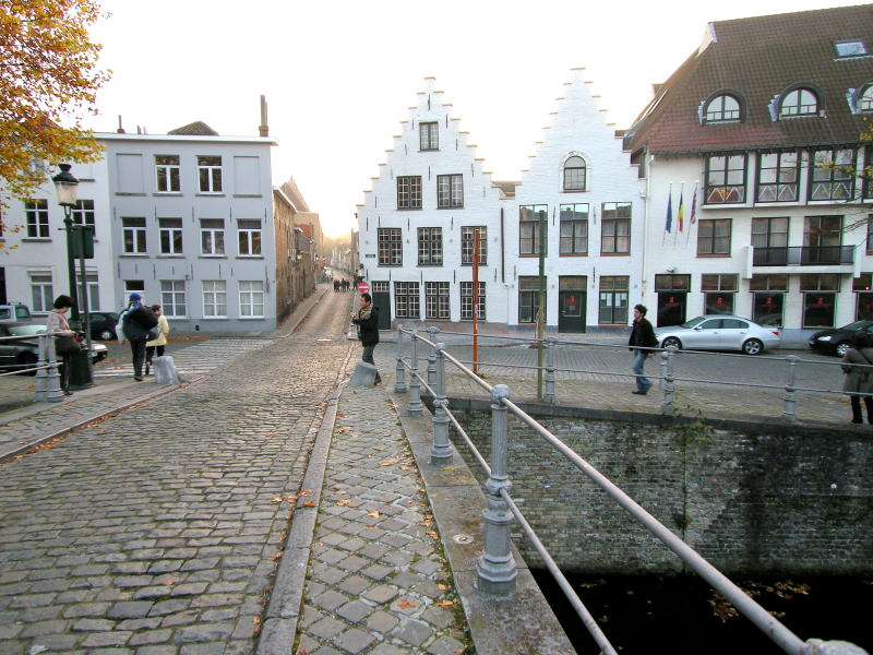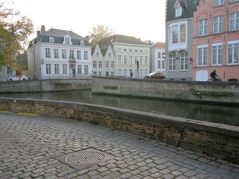 | スピーゲルライ道 [Spiegelrei] からの眺め(09:12) 左の白い建物は、オードリー・ヘップバーン主演の映画「尼僧物語」(1958年作) のロケに使用された建物。 風景は当時と殆ど変わっていません。 (オードリーは地元ブリュッセルの出身) 「東」MAP Lay.1D 映画 「尼僧物語」[The Nun's Story] ブルージュのシーン |