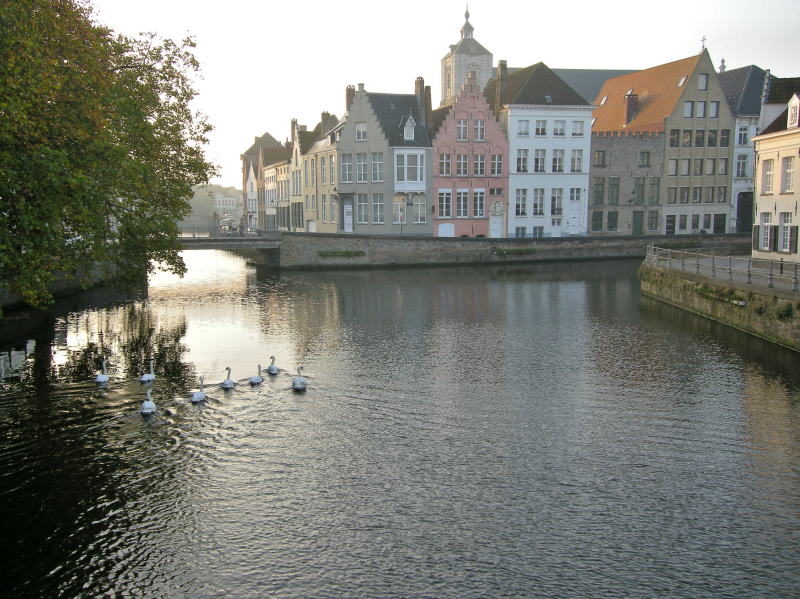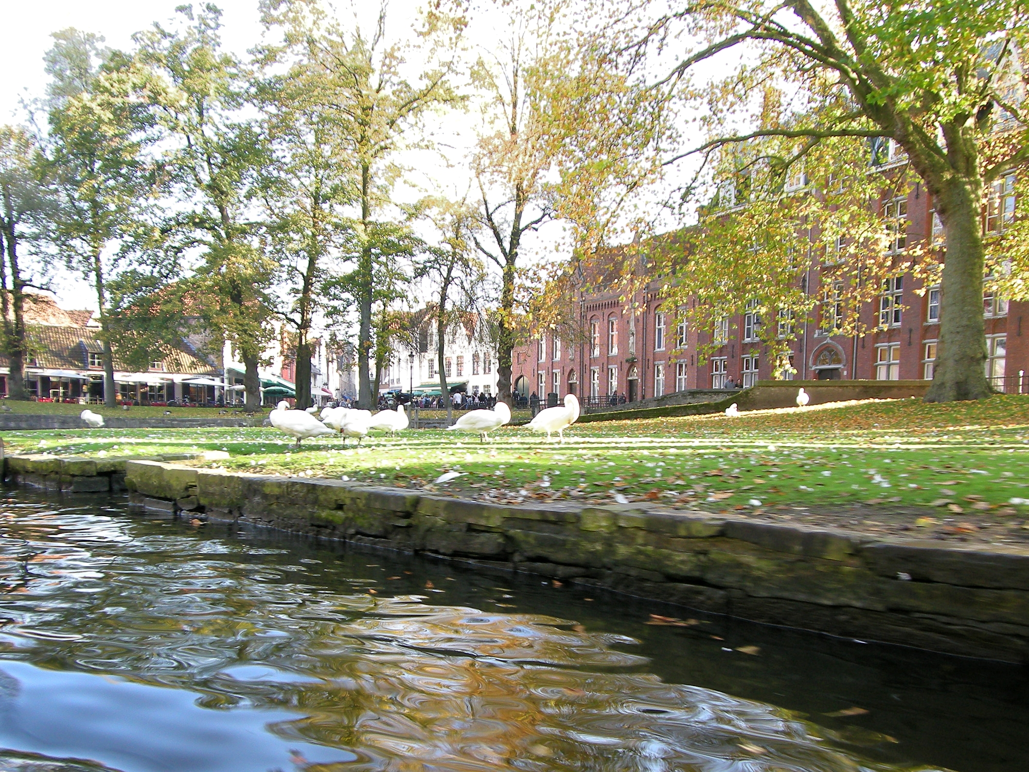 | 運河 "Bakkersrei" をクルーズ(10:40) 白鳥が遊ぶ "愛の湖公園" [Minnewaterpark] 。 「北東」MAP Lay.1h |