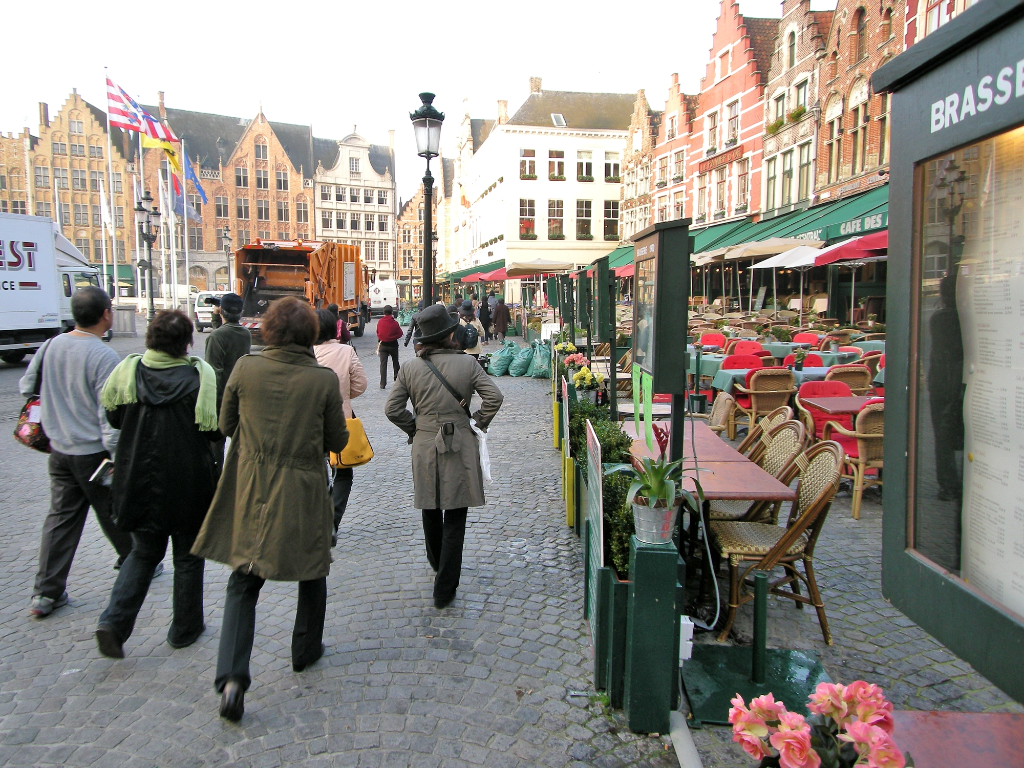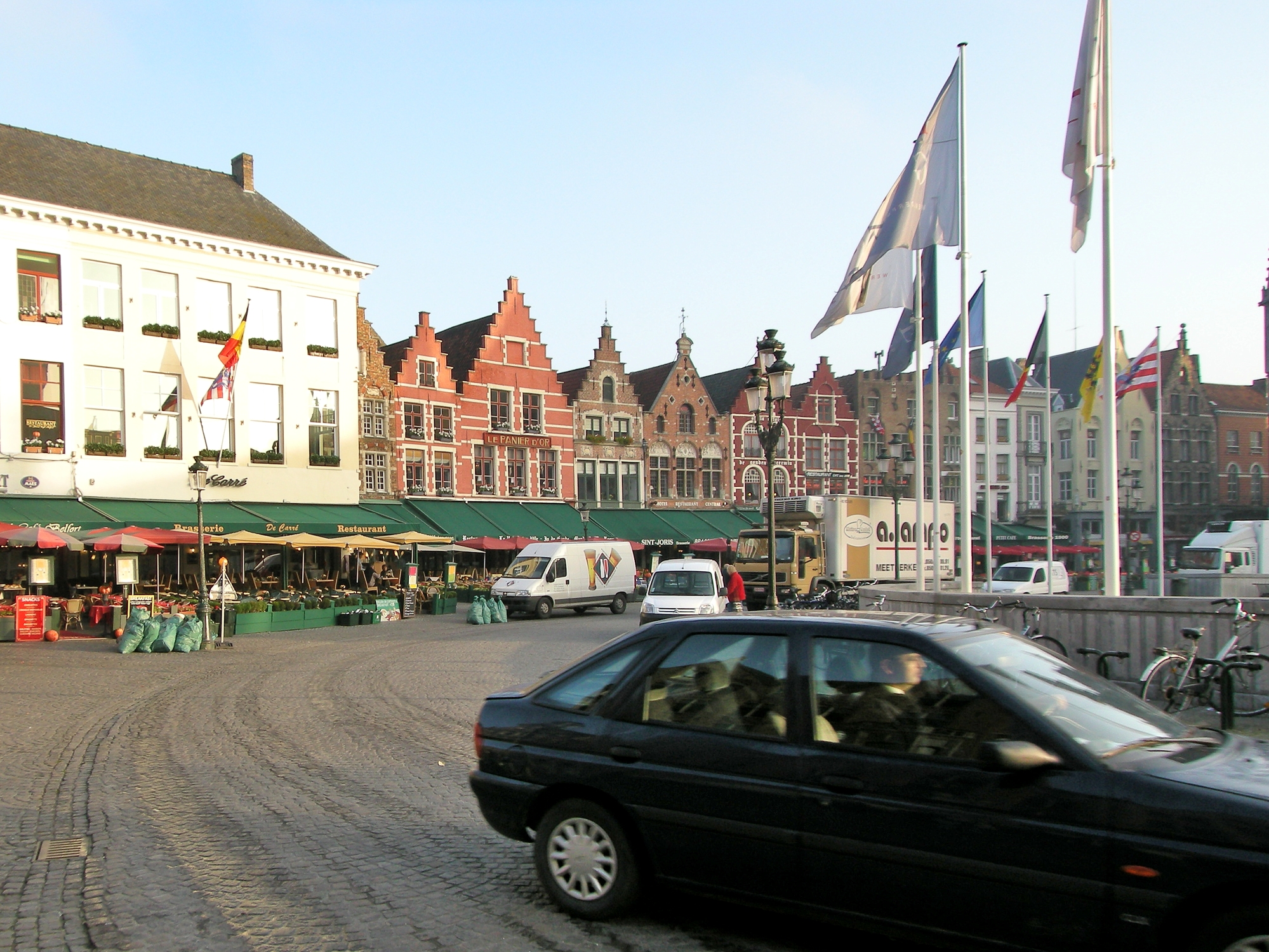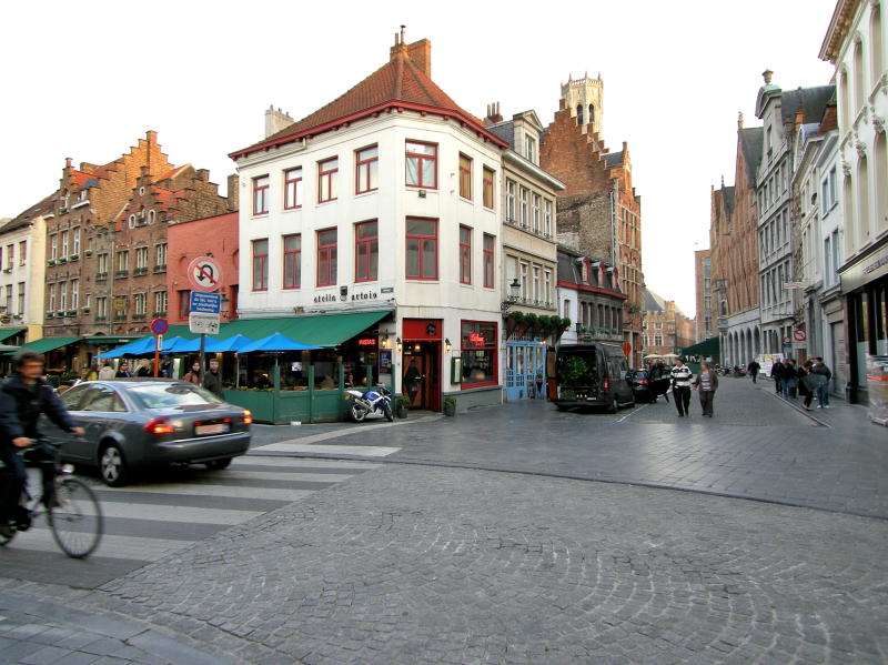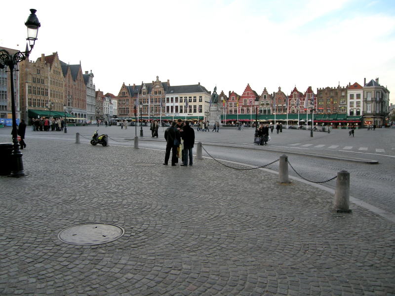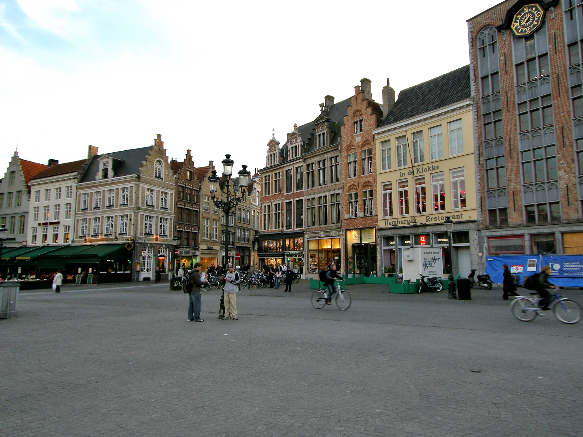 | マルクト広場 [Markt](18:12) 広場の北側と西側では、かつてはギルドハウスだった切妻屋根をもつ建物が、今ではレストラン、カフェ、土産物店、銀行として使用されている。 前方の通りはシント-アマンズ通り [Sint-Amandsstraat] 。 「南西」MAP Lay.3L |