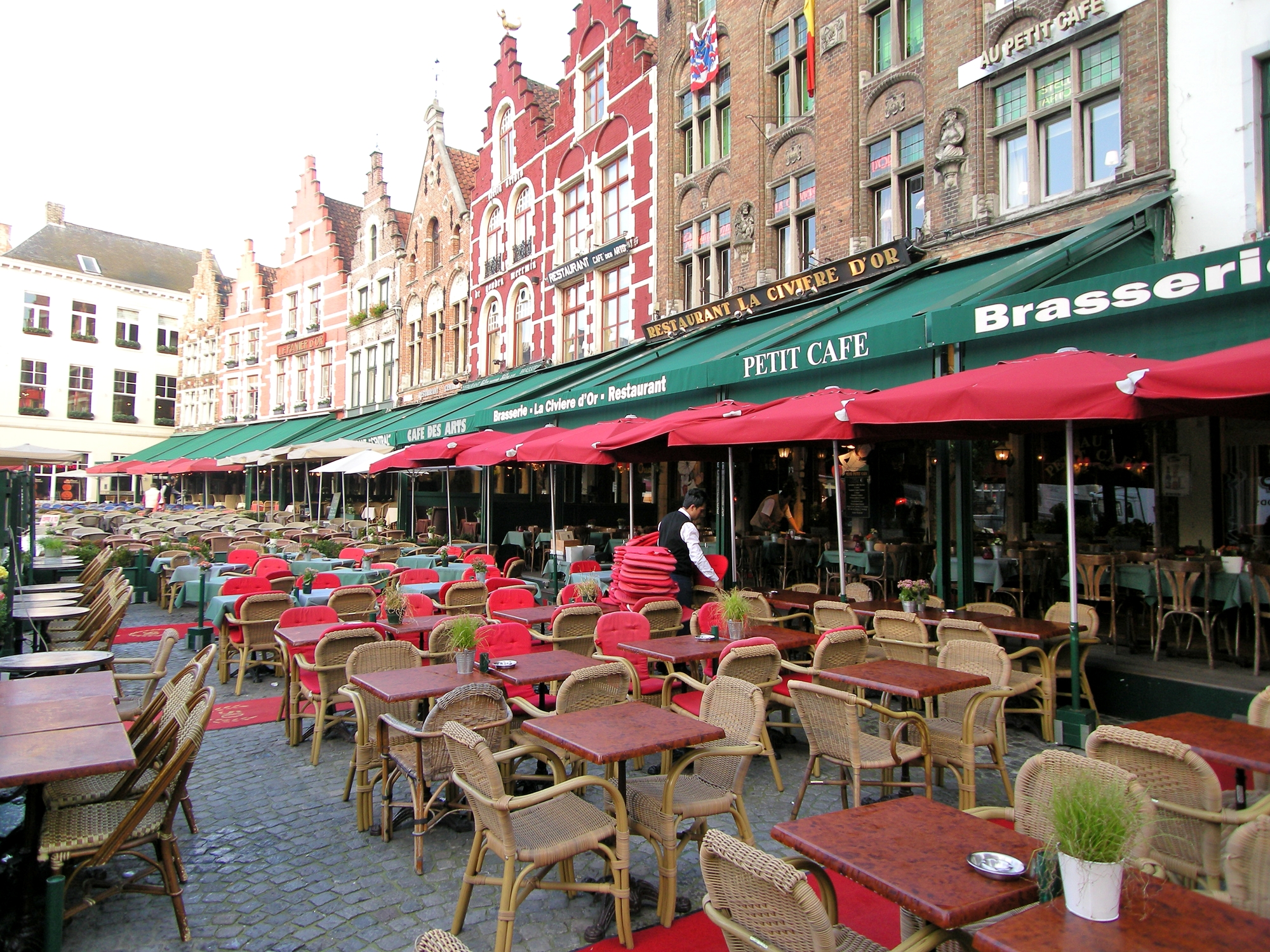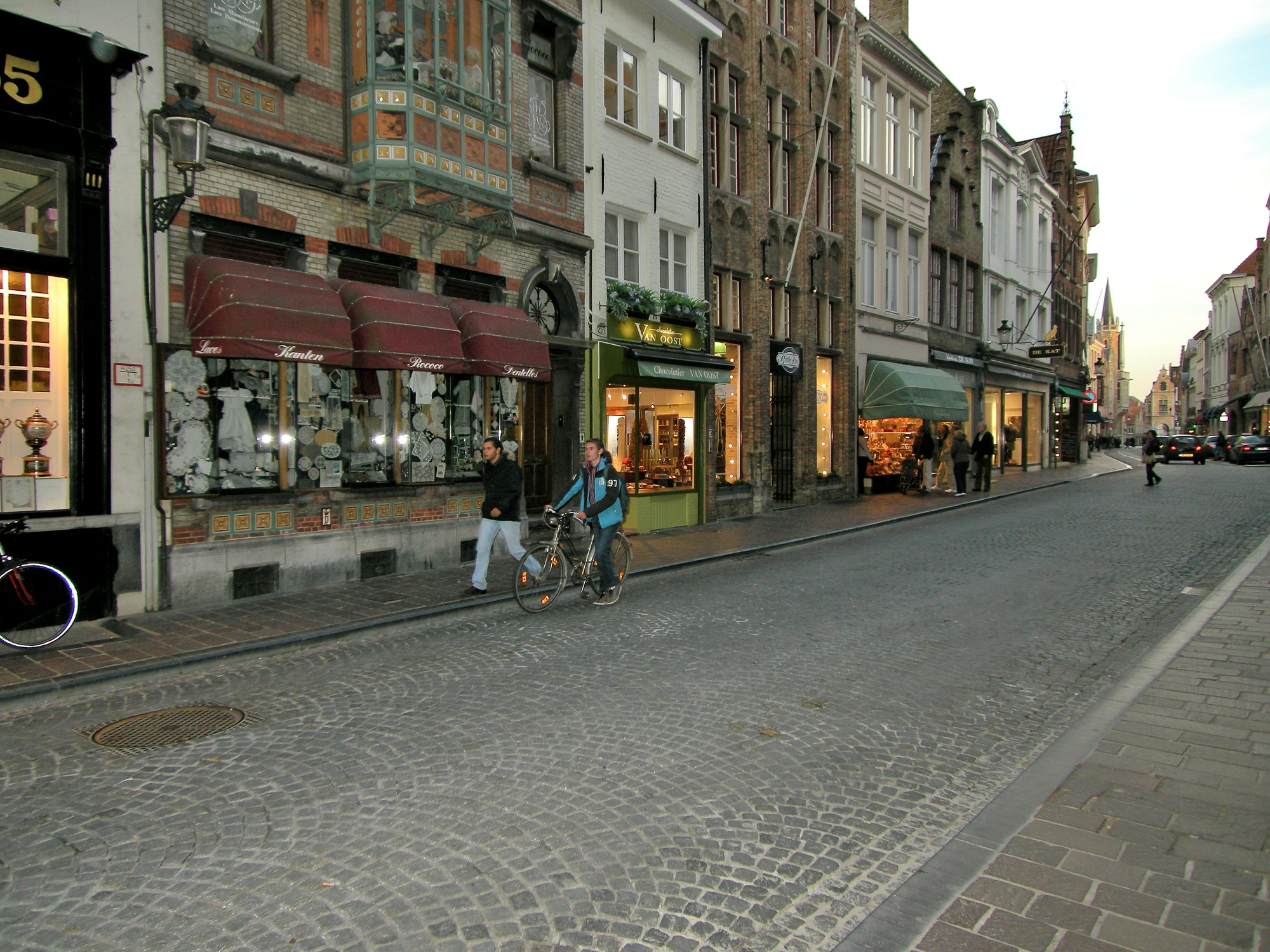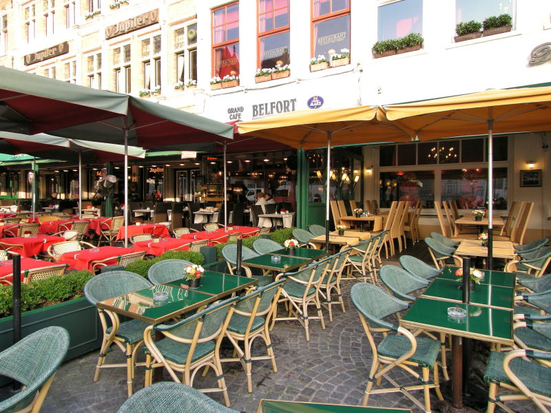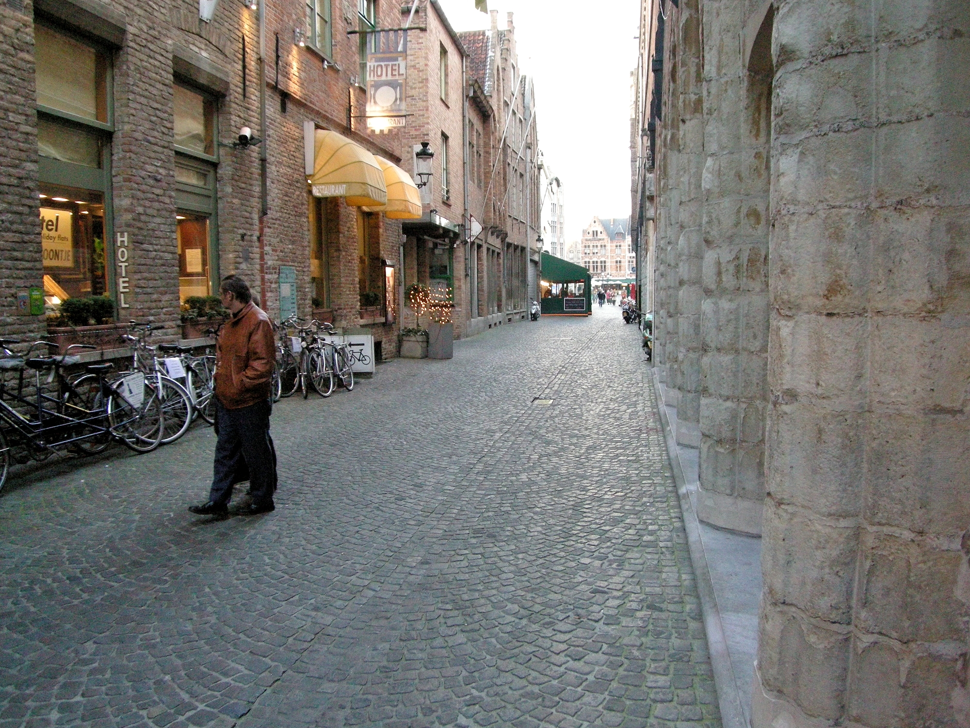 | マルクト広場 [Markt](18:12) 広場の北側と西側では、かつてはギルドハウスだった切妻屋根をもつ建物が、今ではレストラン、カフェ、土産物店、銀行として使用されている。 前方の通りはシント-アマンズ通り [Sint-Amandsstraat] 。 「南西」MAP Lay.3L |