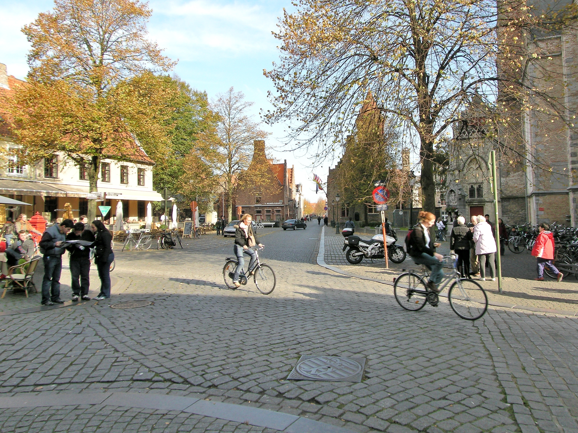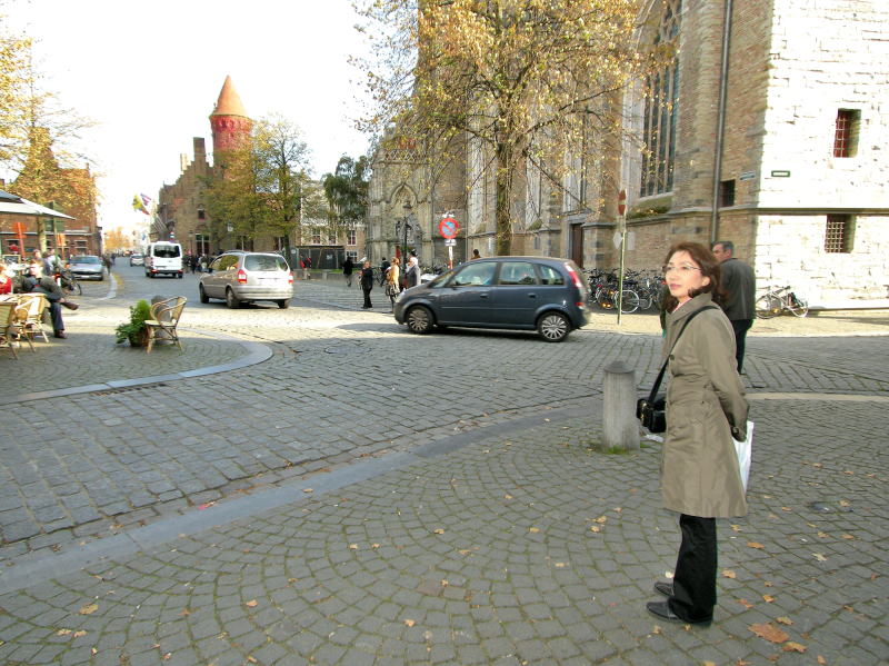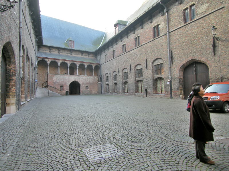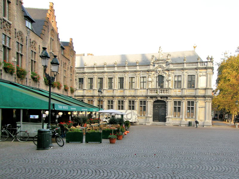| ブルグ広場 [Burg Square](09:58) 左端の黒い建物は "聖血礼拝堂" [Basilica of the Holy Blood] 、右端の建物は "プローズディ裁判所" [Proozdij Gerechtshof] 。 "聖血礼拝堂"の由縁は、第2回十字軍遠征に参加したフランドル伯ディードリックが、1149年に帰路でコンスタンチノープル(現イスタンブール)に立ち寄り、「キリストの血」とされる液体を持ち帰り、一族の礼拝堂に奉納したのが始まり。 「西」MAP Lay.1N |