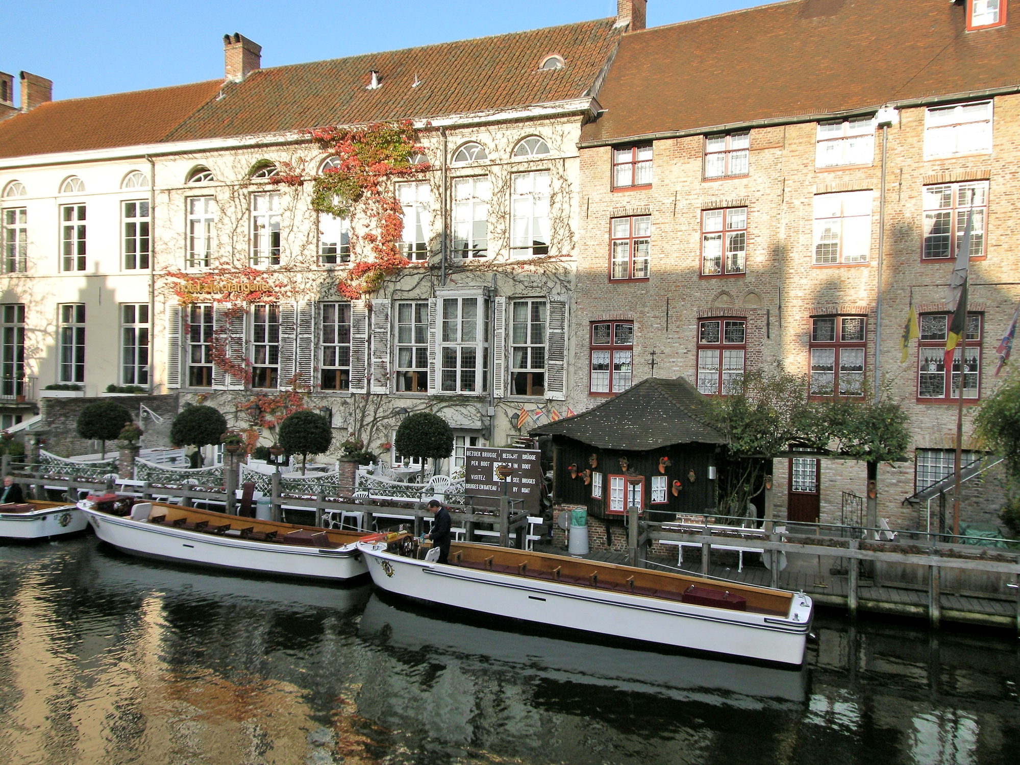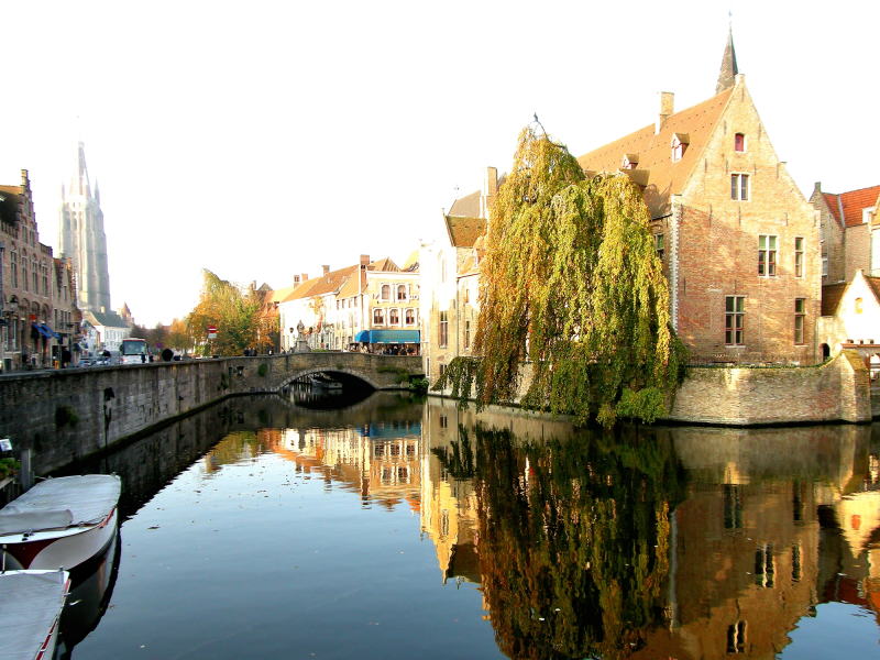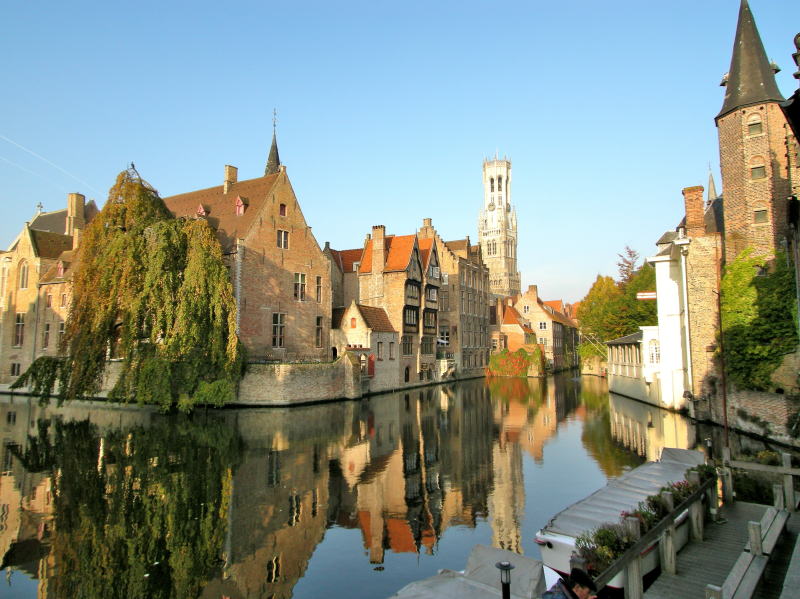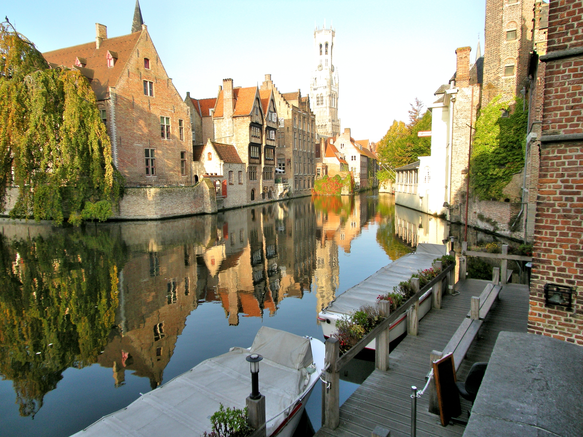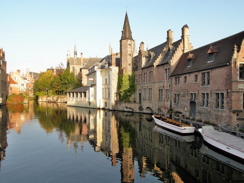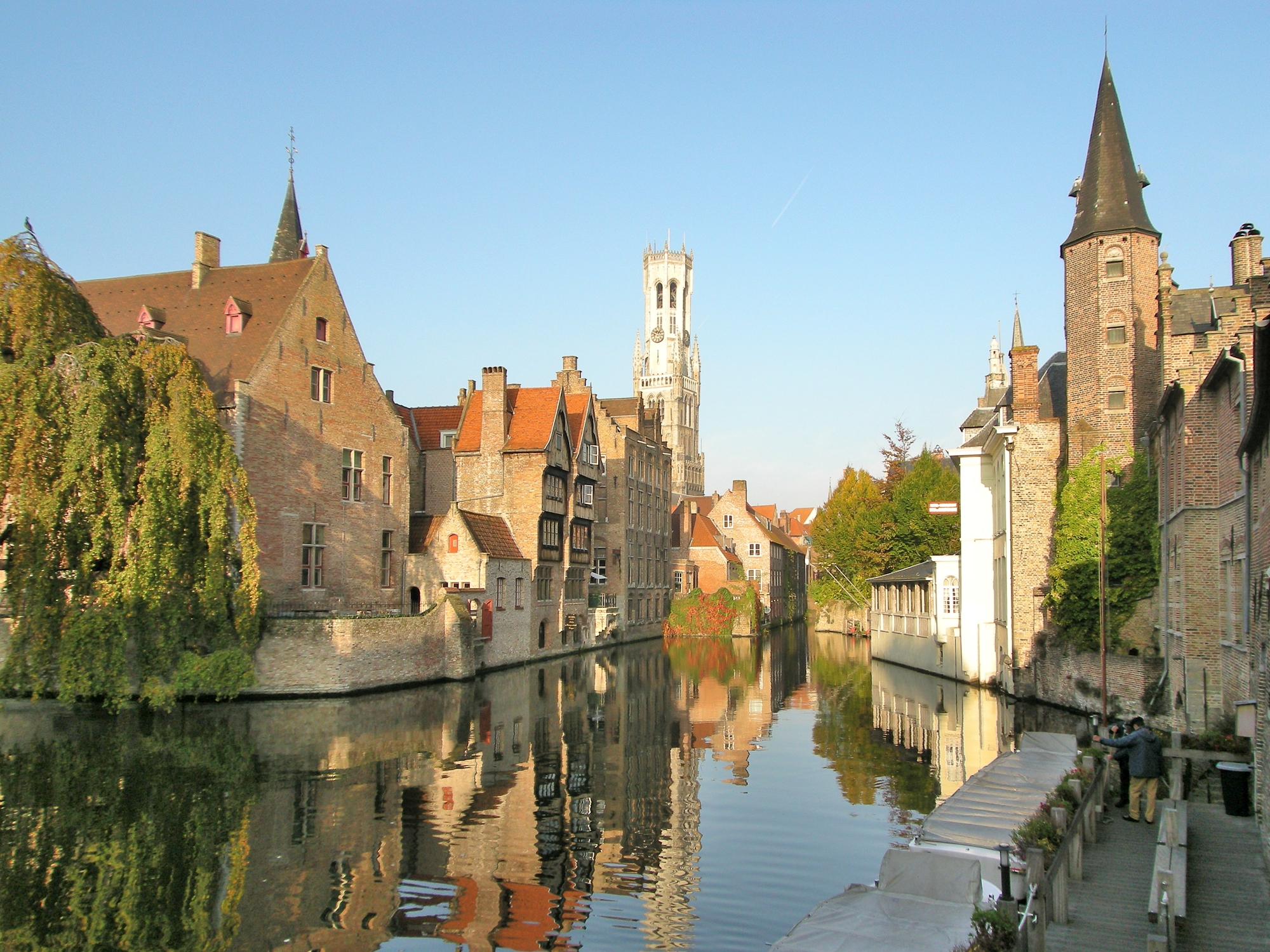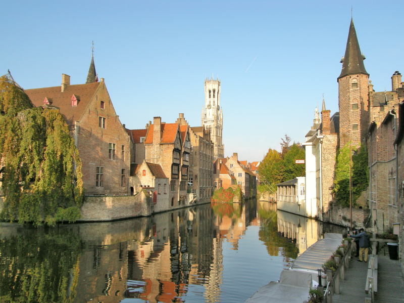 | ブルージュ/ブルッヘ [Bruges (英)/Brugge (蘭] 中世のまま時が止まった「天井のない博物館」とも言われる、ベルギー屈指の美しさをもつ水の都。 町を縦横に流れる運河には50以上の橋が架かっている。 13~14世紀にハンザ同盟の主要都市として栄えたが、その後運河の沈泥で商船の出入りが出来なくなり、町の発展が止まってしまった。 伝統的なレース産業のほか、造船業も盛んで、旧市街は世界遺産に登録されている。 なお、地名の由来は「橋」を意味するブルーフ [Brug (蘭)] で、市内に張り巡らされた運河に架かる無数の橋に因んでいる。 |