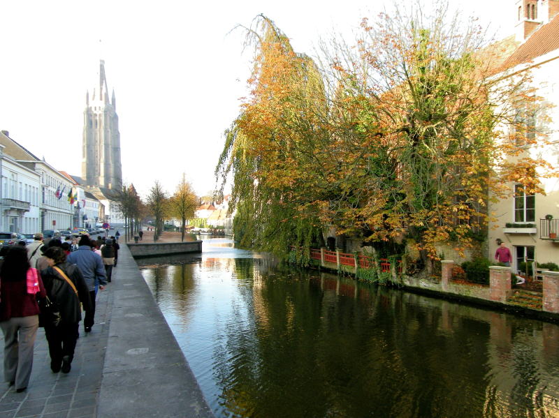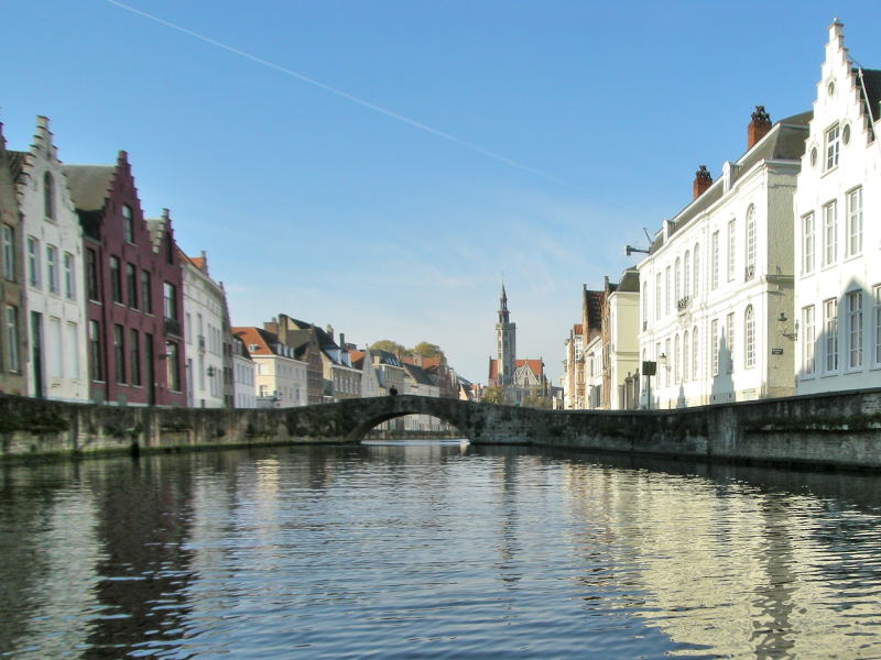 | 運河 "Dijver" をクルーズ(10:48) この辺りの風景は、ブルージュを代表する風景で、商業写真など、好まれて撮影される場所。 中央に見える塔は、マルクト広場にある鐘楼。 「北西」MAP Lay.2D |