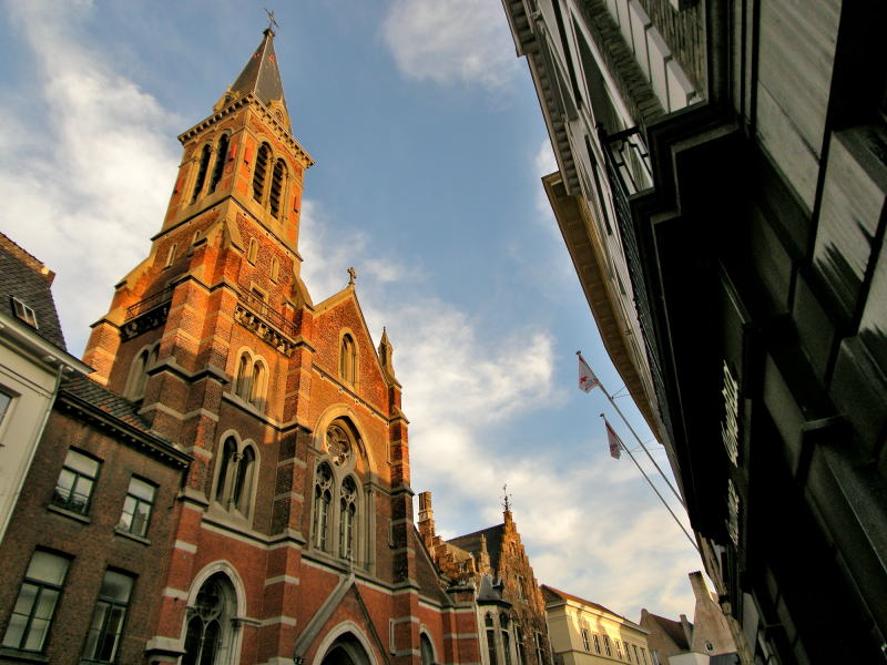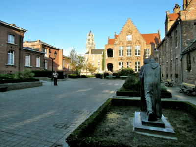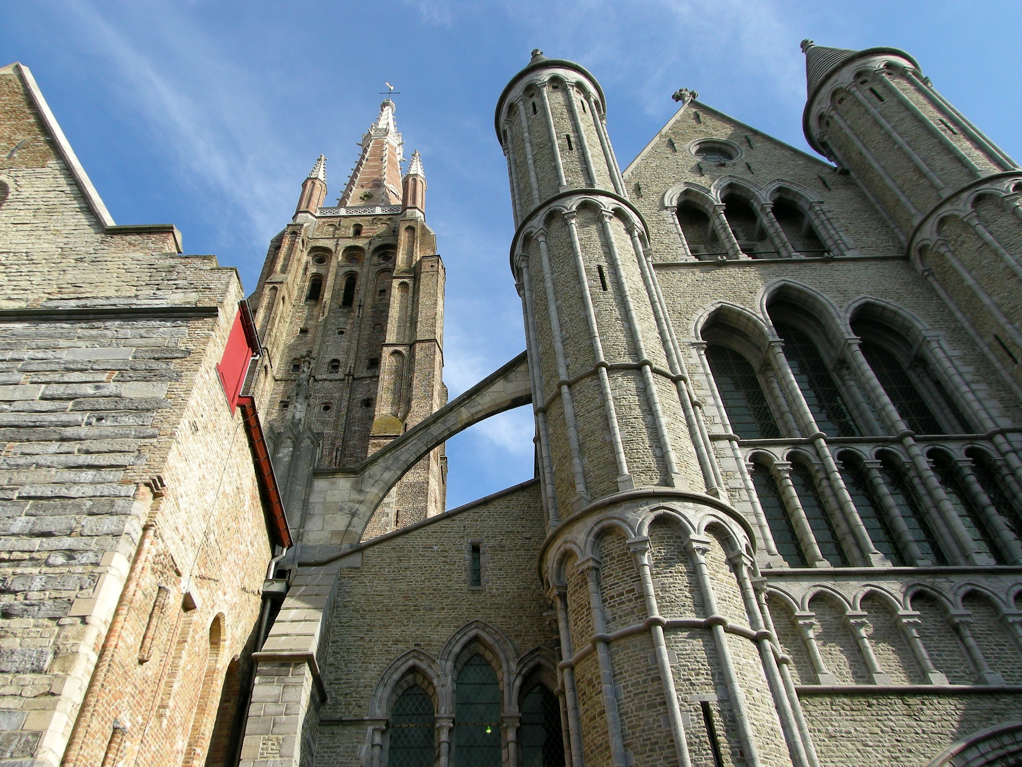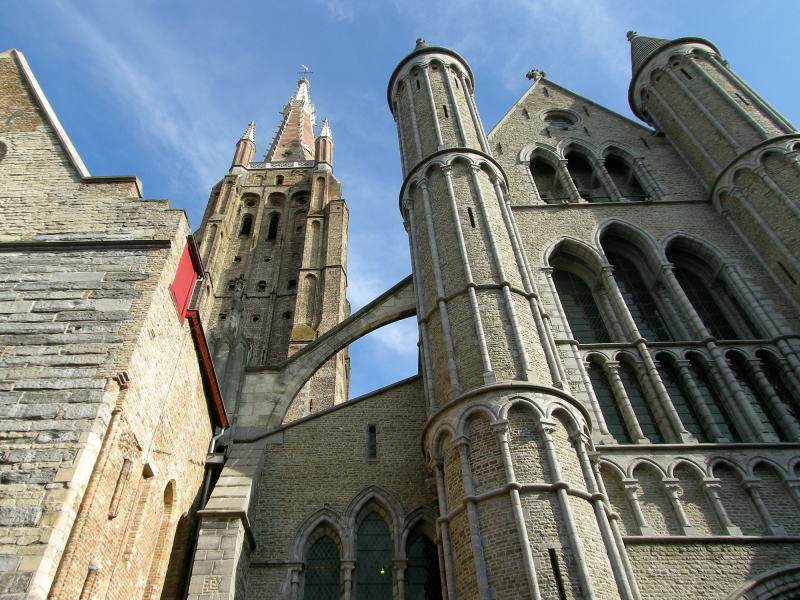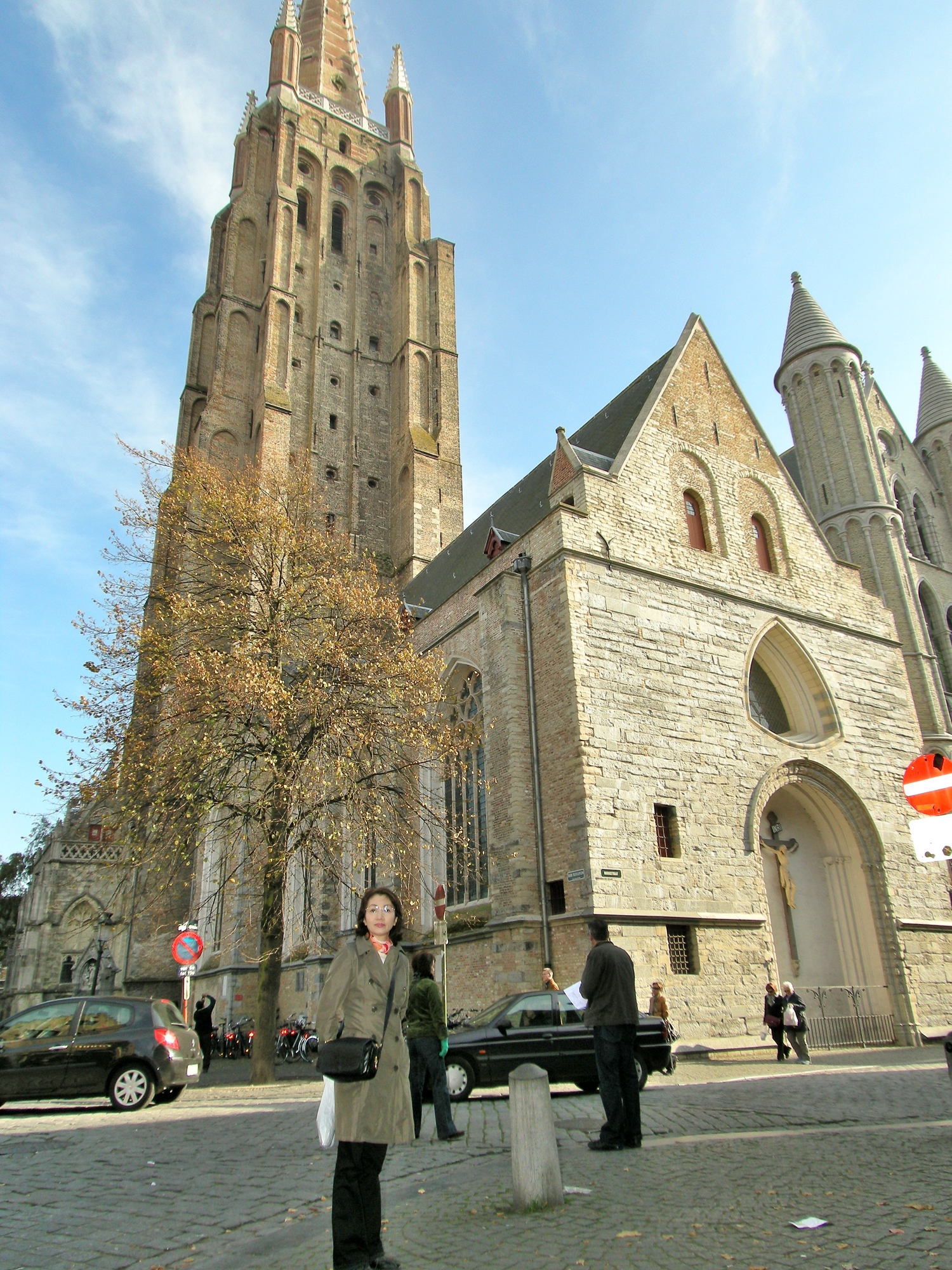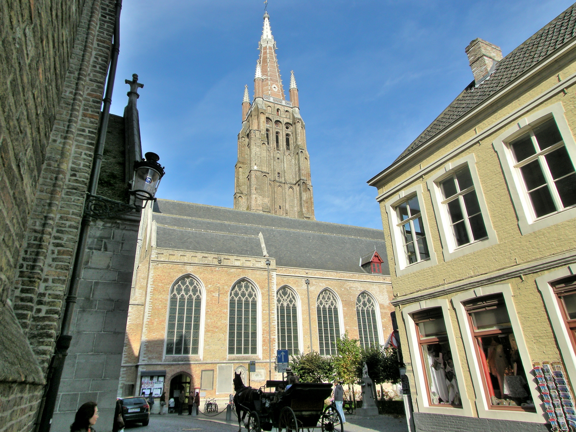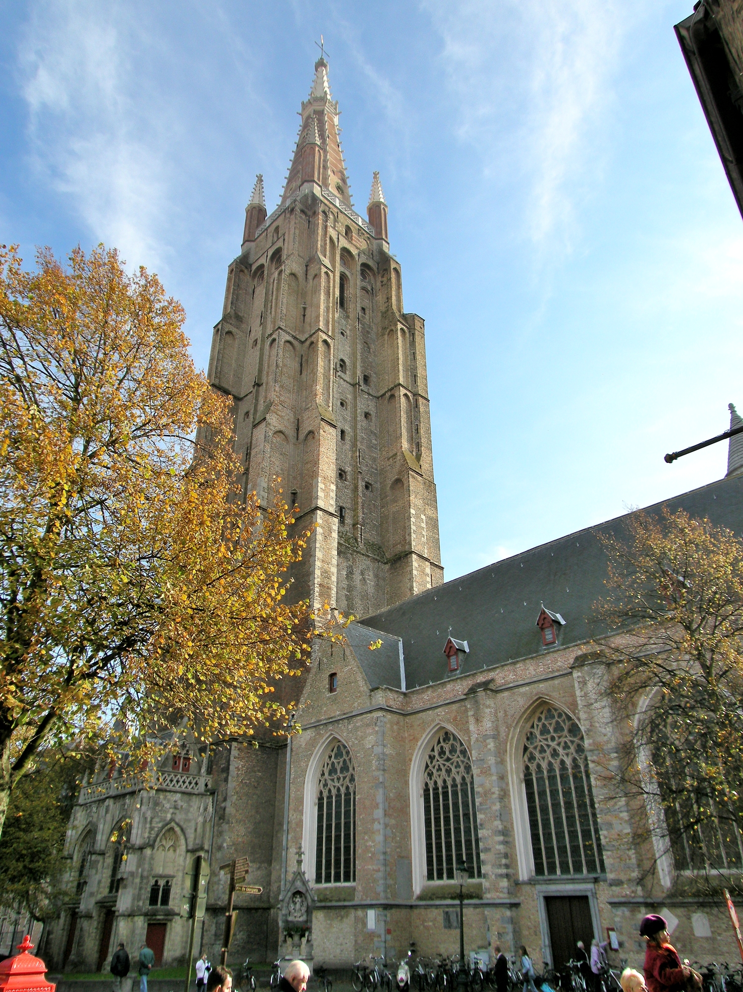| 聖母教会 [Onze Lieve Vrouwekerk](13:22) ギート・ゲゼレ広場 [Guid Gezelleplein] から観た、聖母教会。 13~16世紀に建てられた教会で、何度も改修が加えられたため、多くの建築様式が混在している。 教会内部にある白大理石でできたミケランジェロ作 "聖母子像" [Madonna met Kind] が有名。 「東南東」MAP Lay.2i |